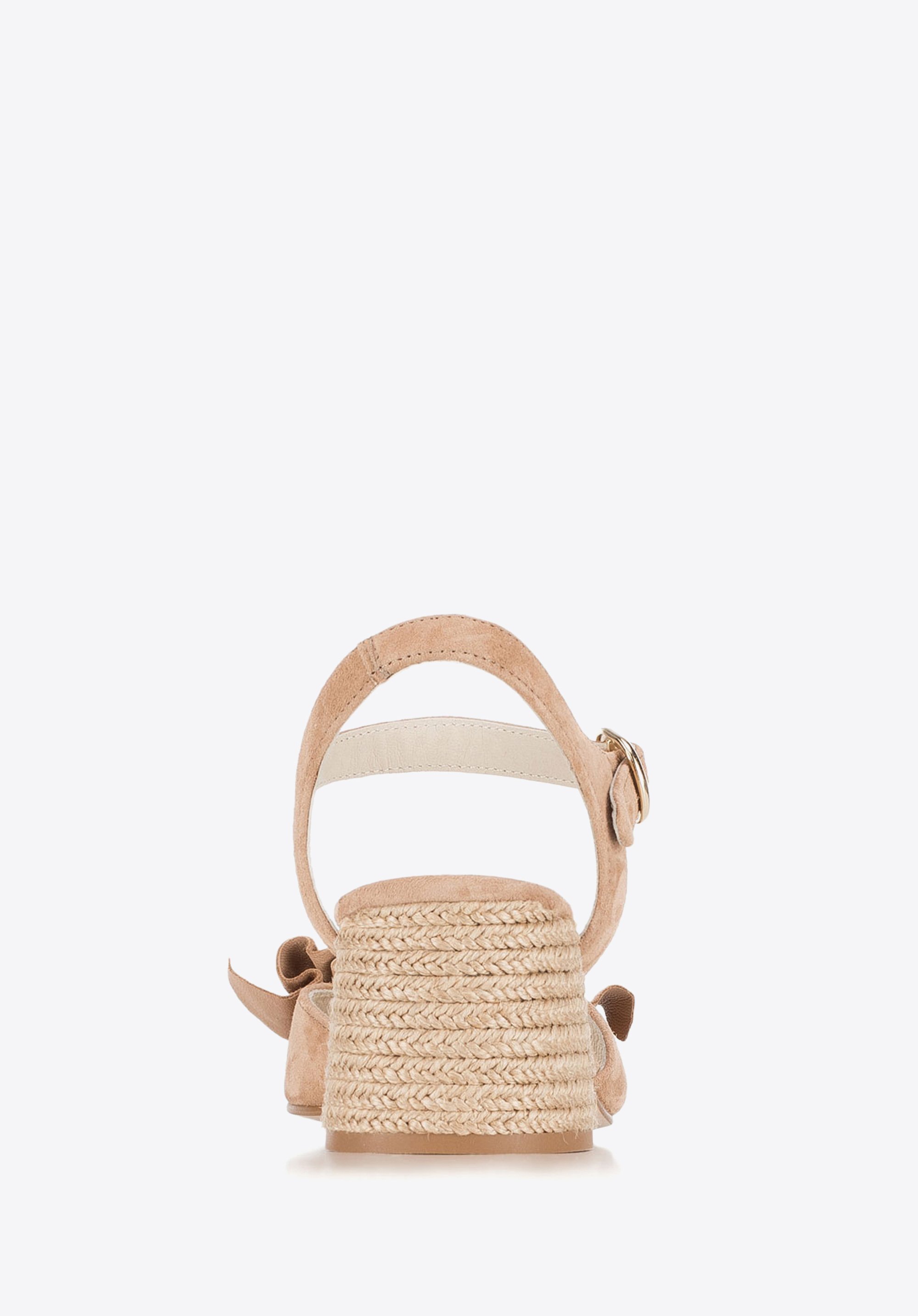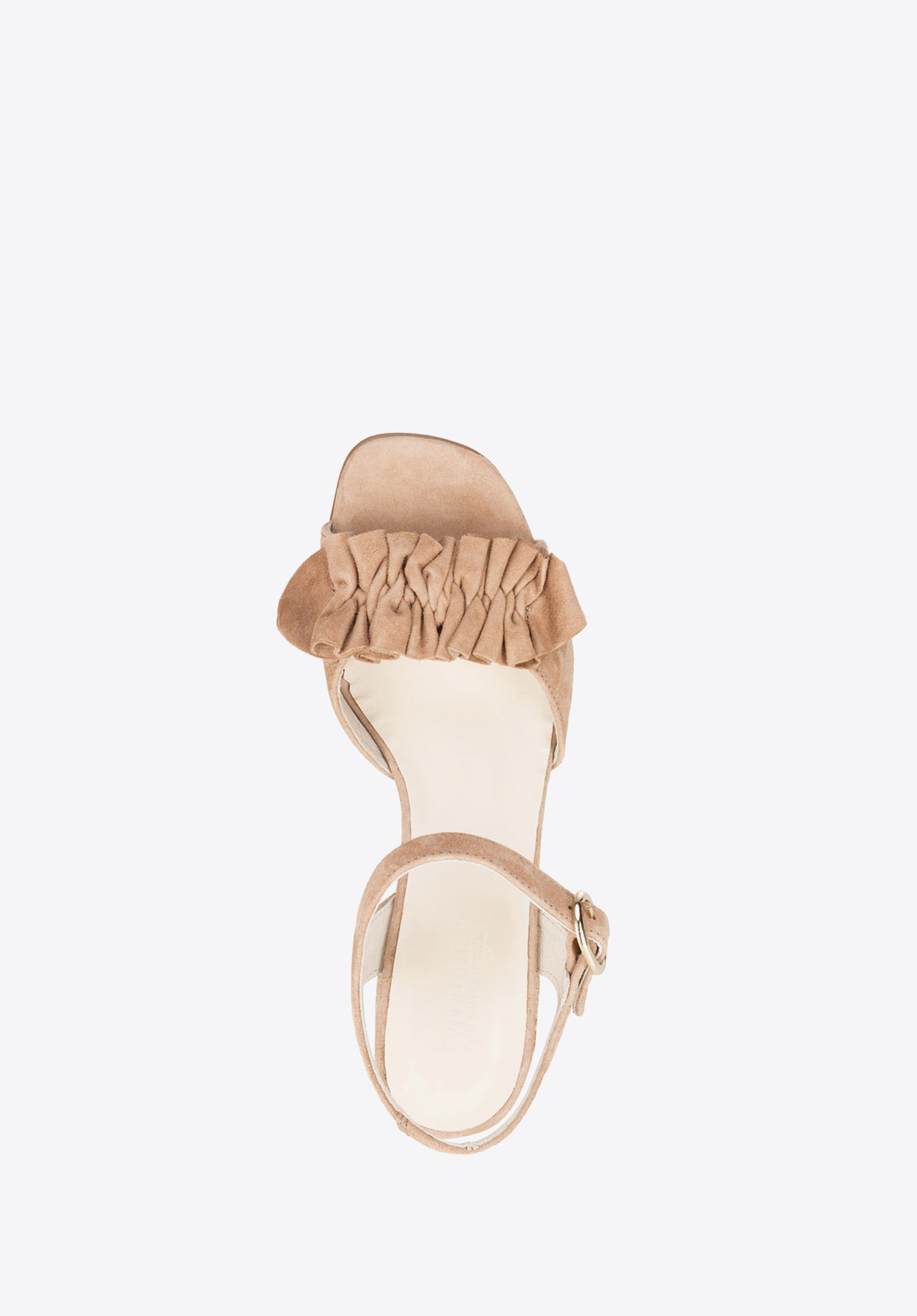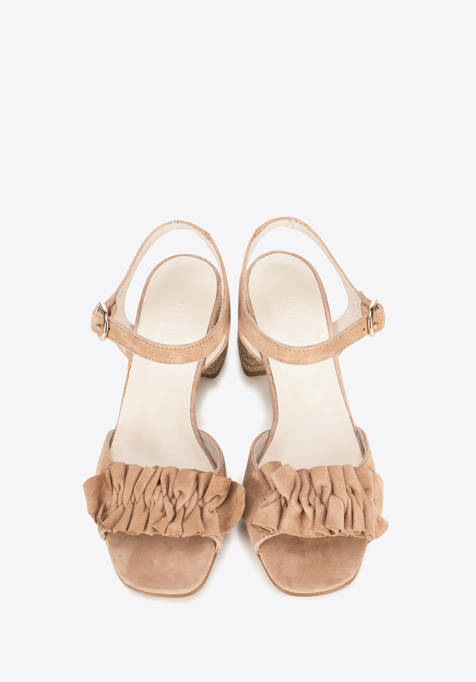 Elevate your summertime outfit with these attractive sandals. Available in beige, red and black shade, they rest on a mid block heel and are adorned with the suede ruffles on the toe strap. This pair will team perfectly not only with lightweight summer dresses but also with shorts. Our advice: rope effect block heel completes this summer design.