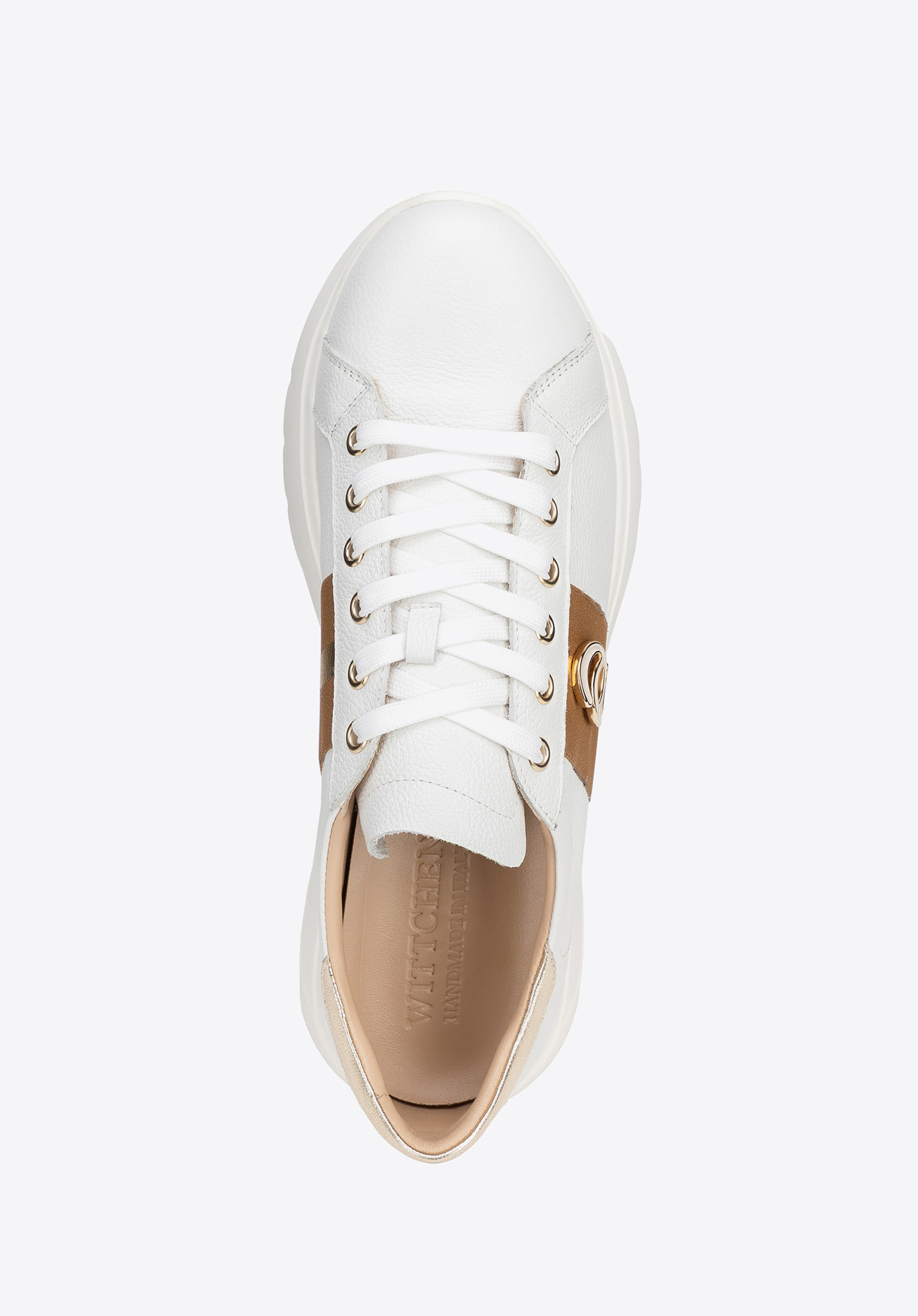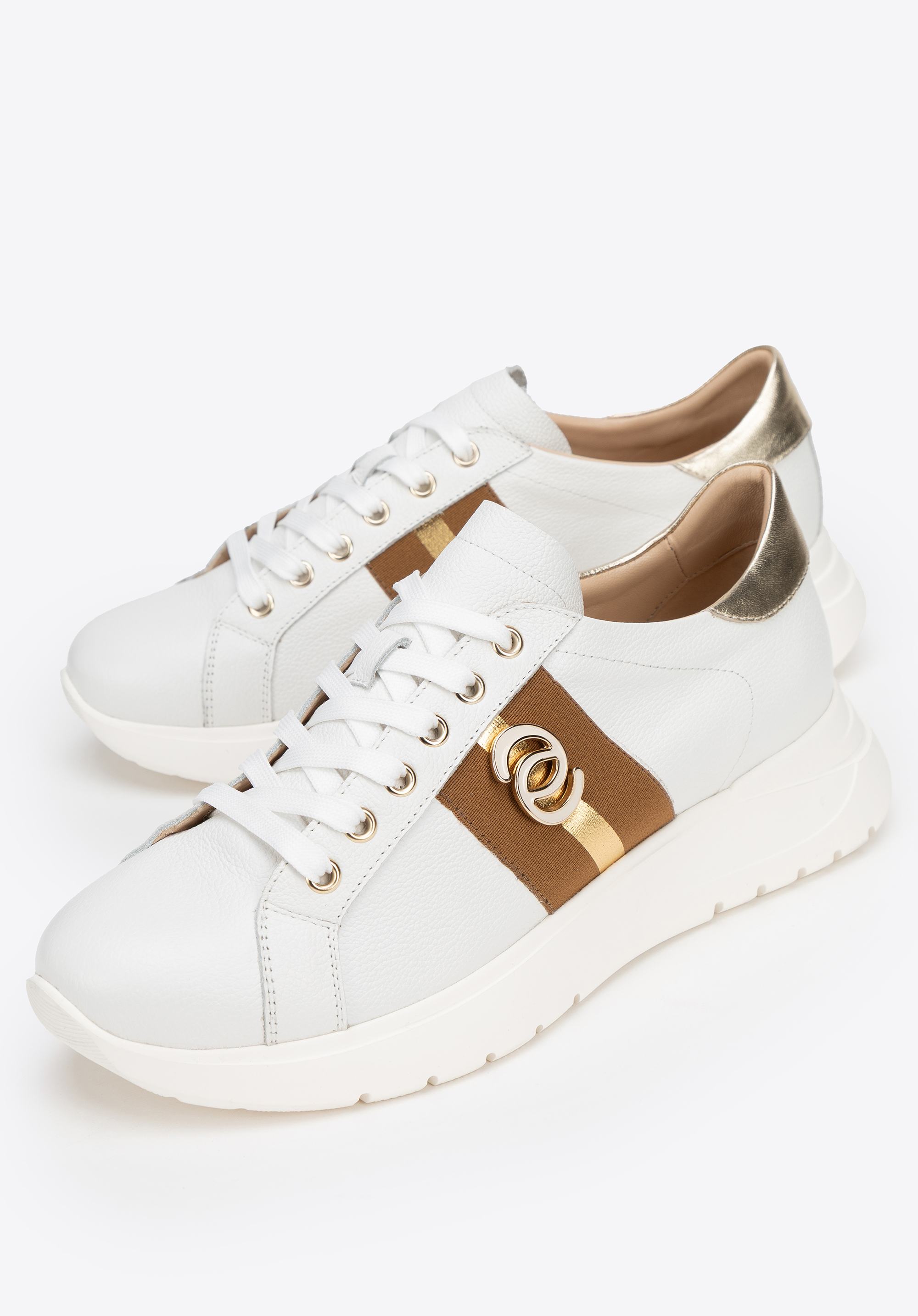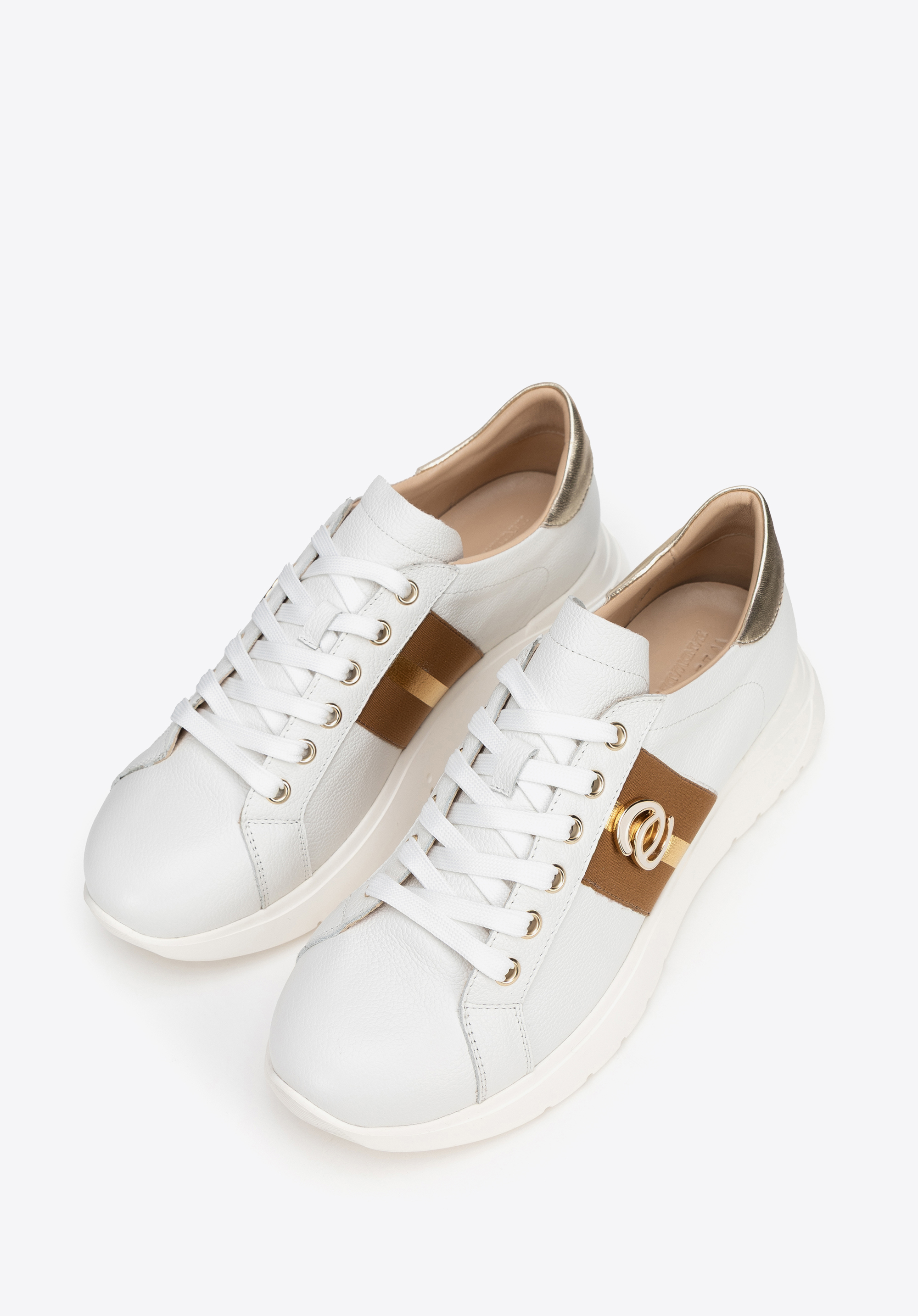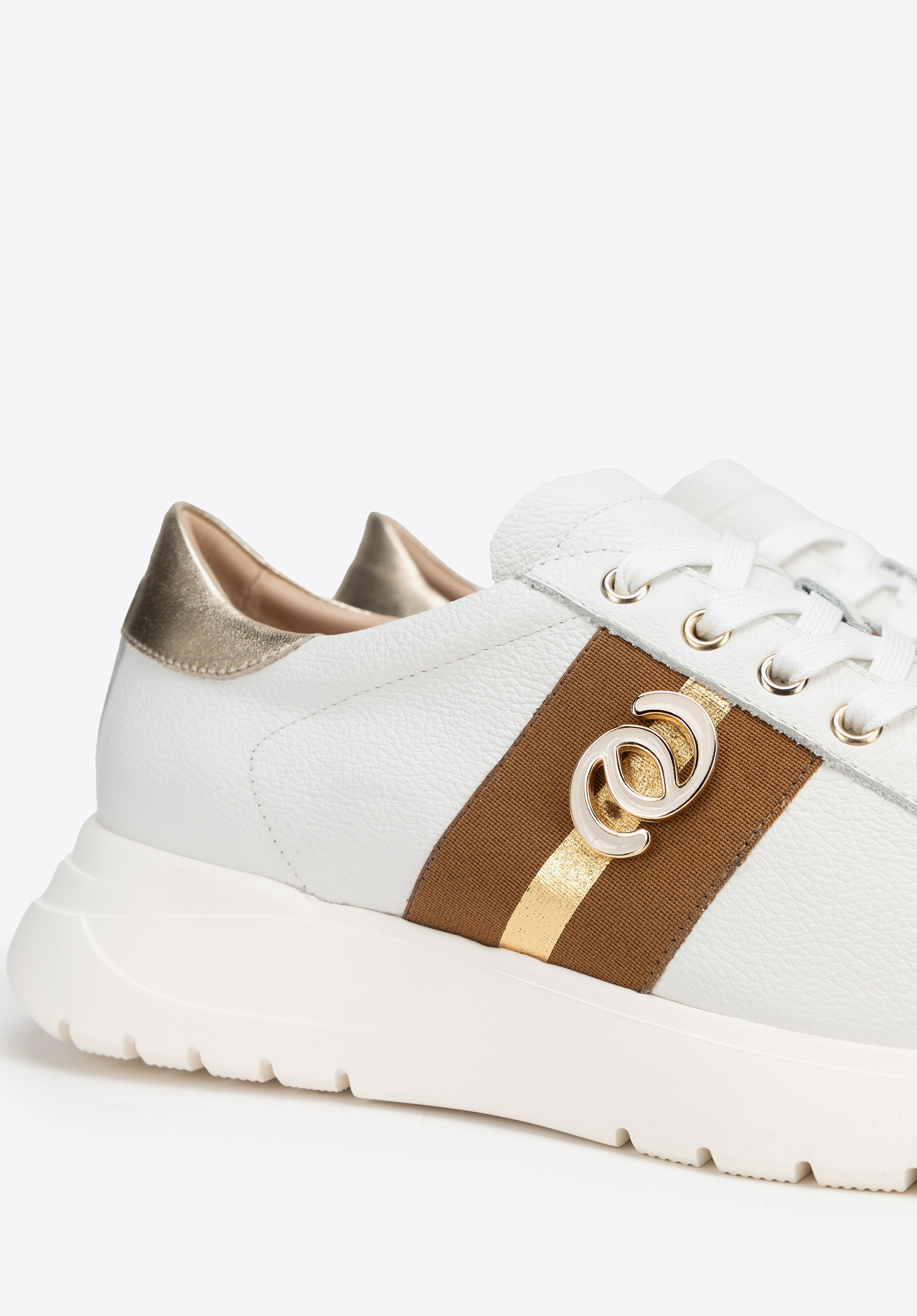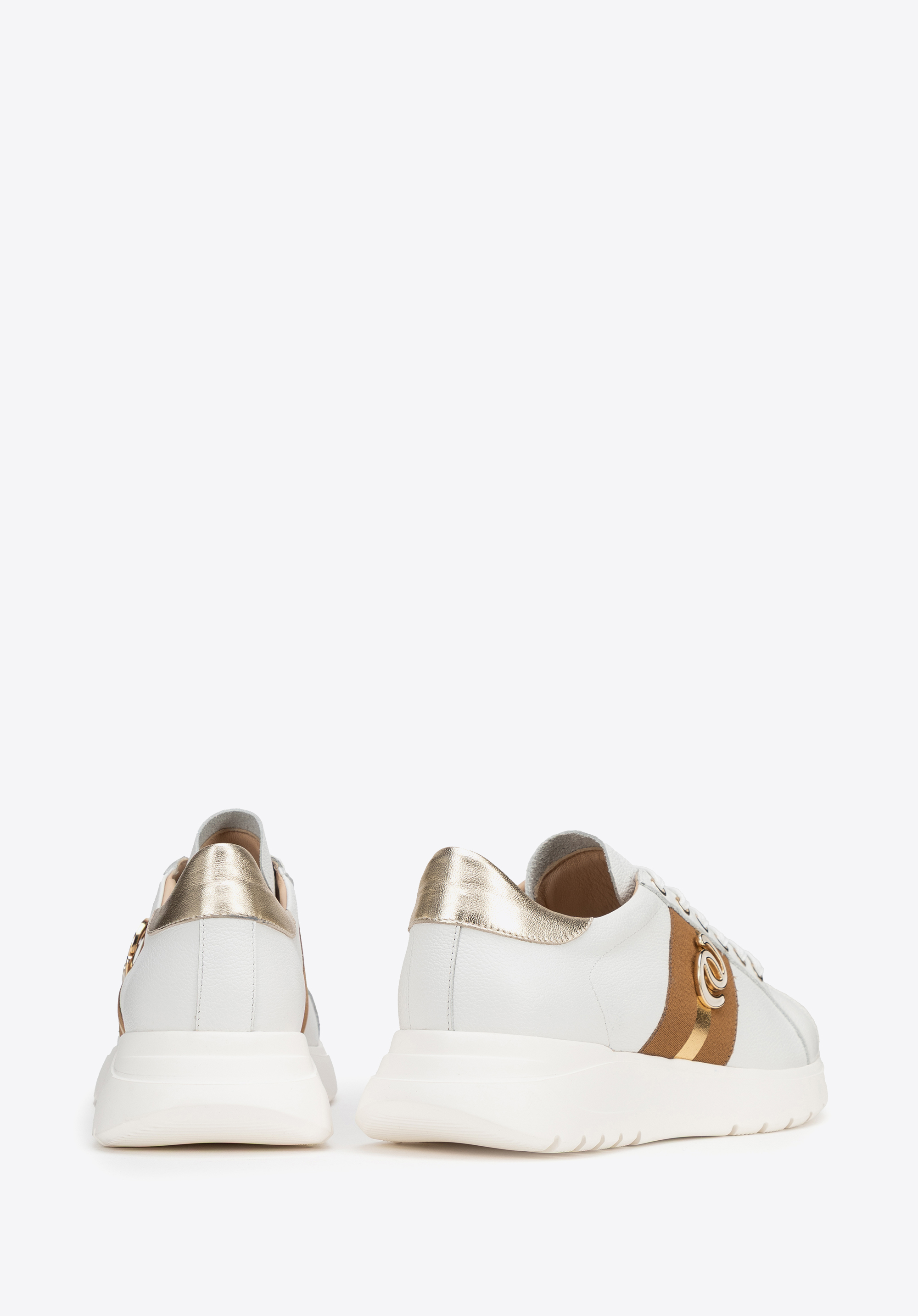Indulge in luxury and comfort with these unique trainers! Made from leather, they feature shiny gold features. The metallic accents add a touch of flair, while the chunky rubber sole enhances the contemporary look and delivers all-day comfort. The leather lining and insole wrap your feet in softness, guaranteeing comfort throughout the day. Stylish and practical – these shoes will elevate any outfit.