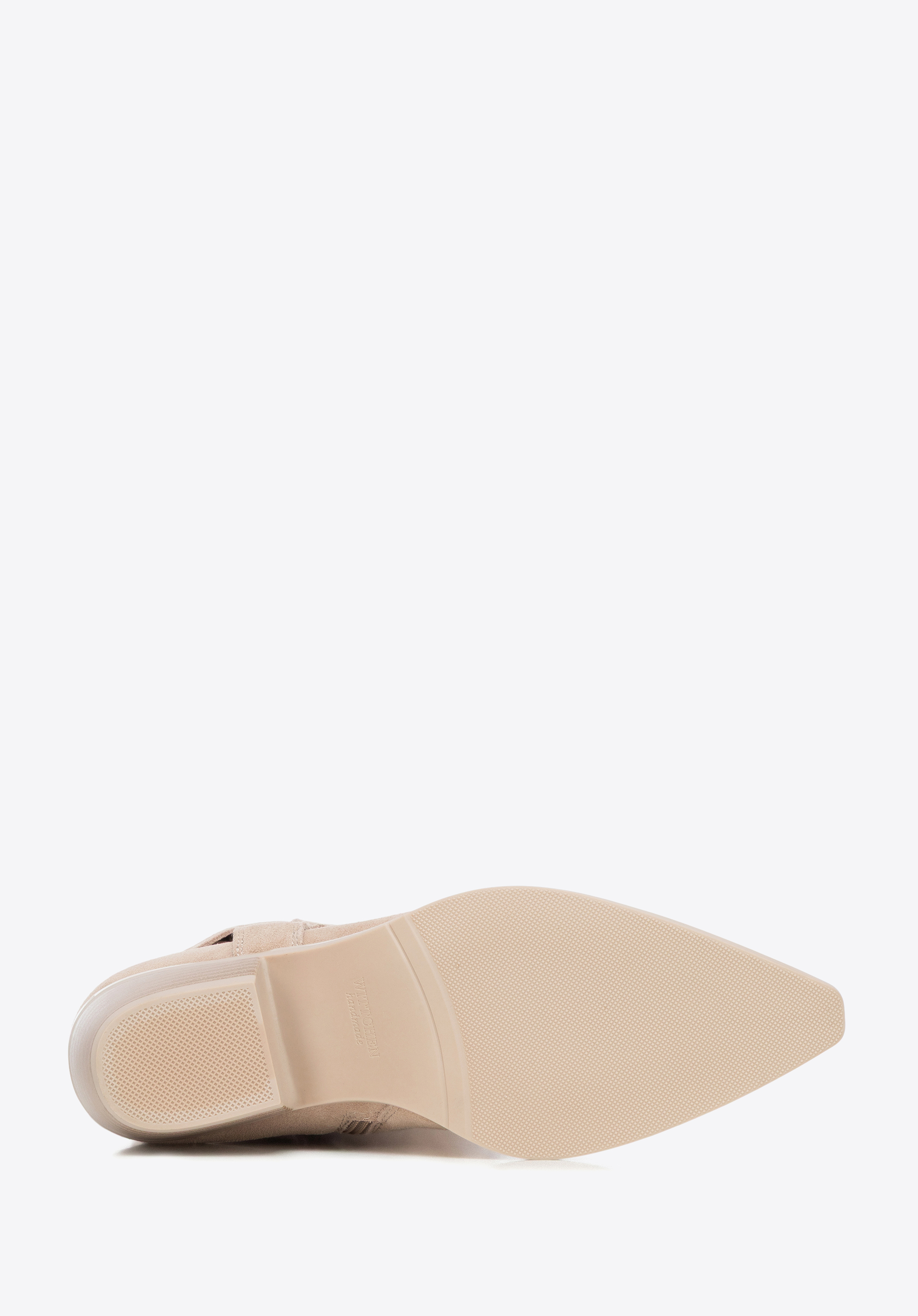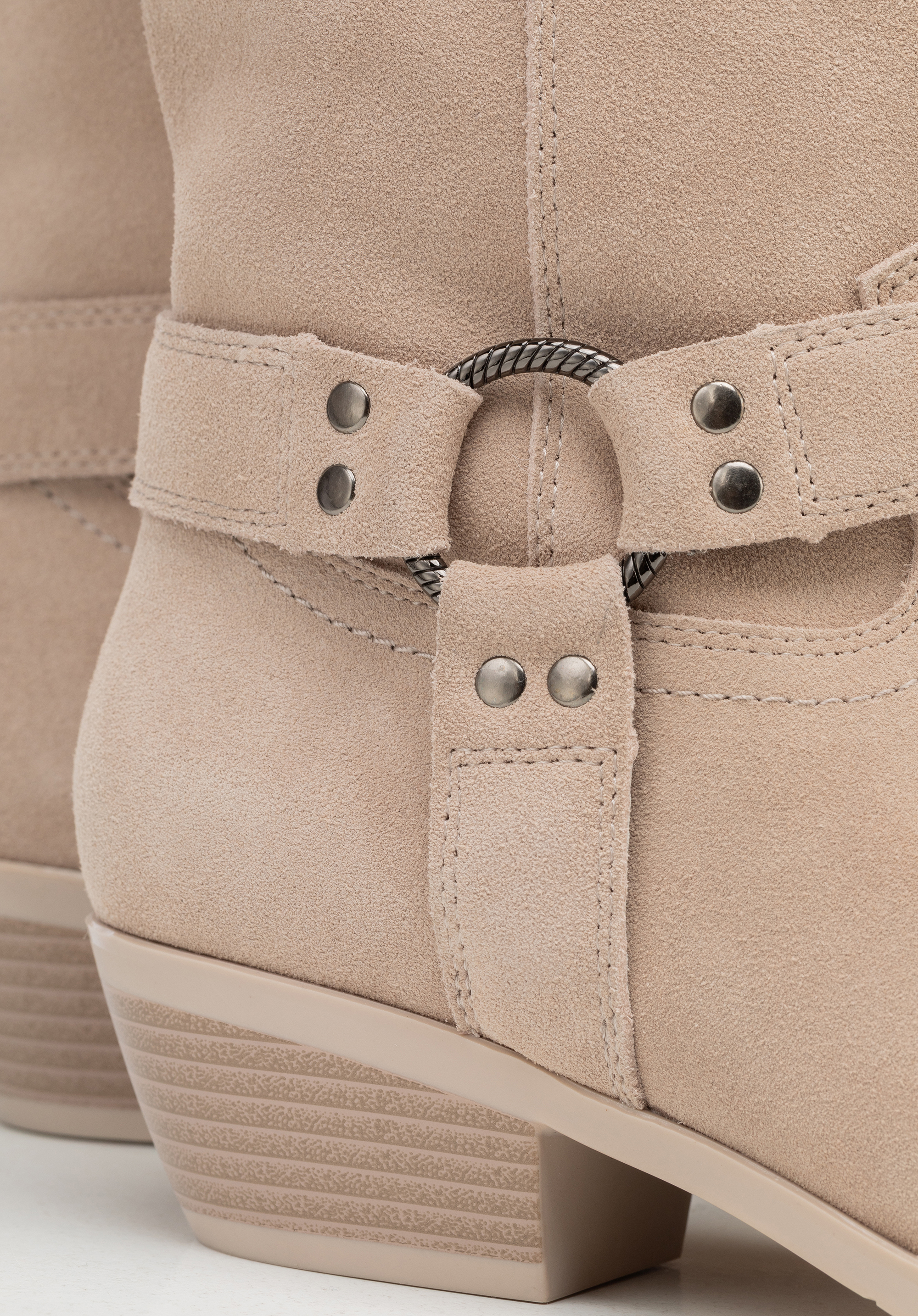 Stylish, tall and full of character – these women’s cowboy boots combine classic design with modern detailing. Made from natural suede, they impress with their soft texture and refined finish. A pointed toe adds lightness and elegance to the silhouette, while the sturdy block heel ensures all-day comfort and stability. The decorative strap with metal details on the outer side highlights the boots’ distinctive style, giving them a unique character.