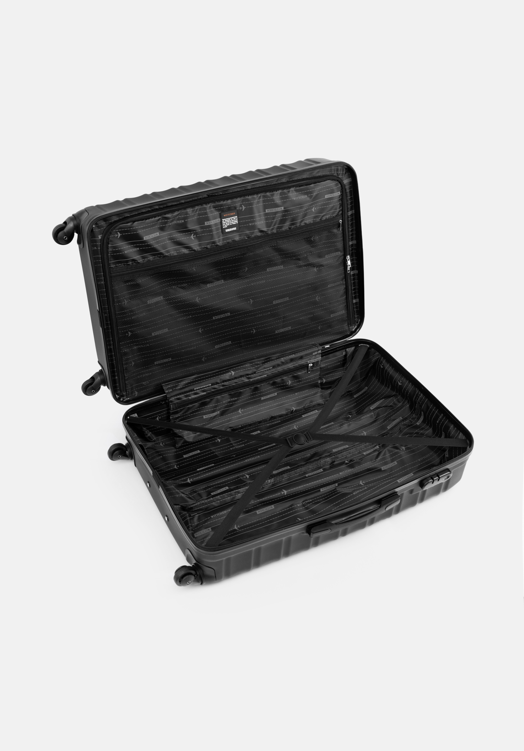 - Interior: The suitcase is divided into two functional compartments. The first, secured with elastic straps, adjusts to the size of your luggage, ensuring stability and preventing items from shifting. The second compartment, zipped, is perfect for storing smaller items.