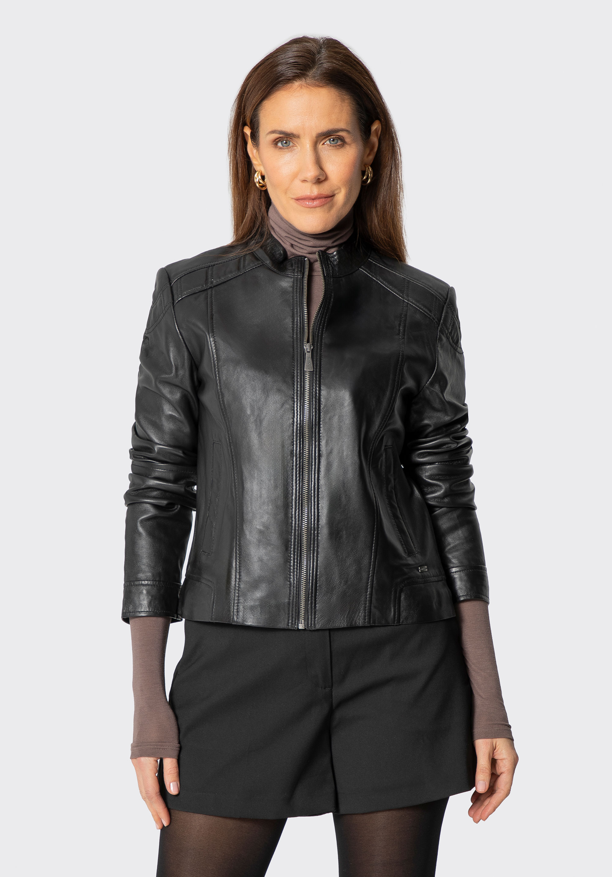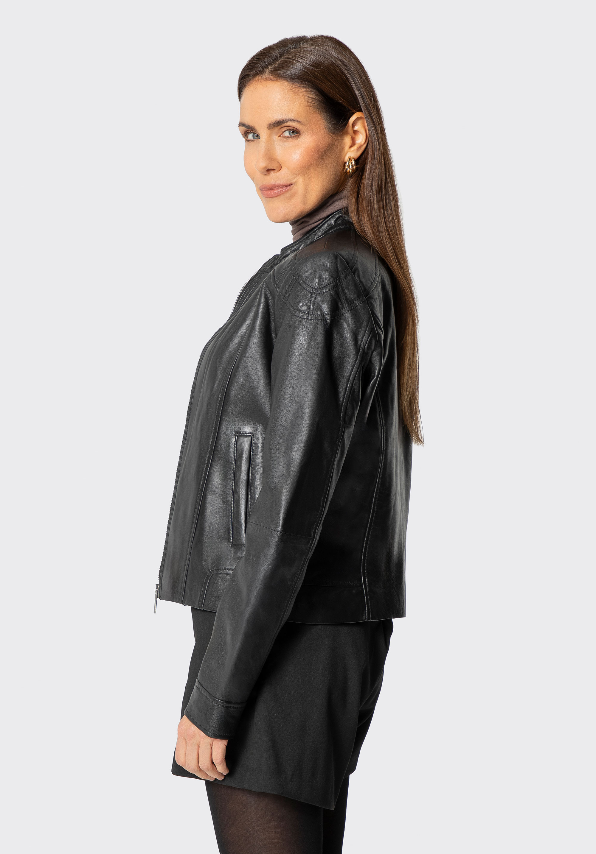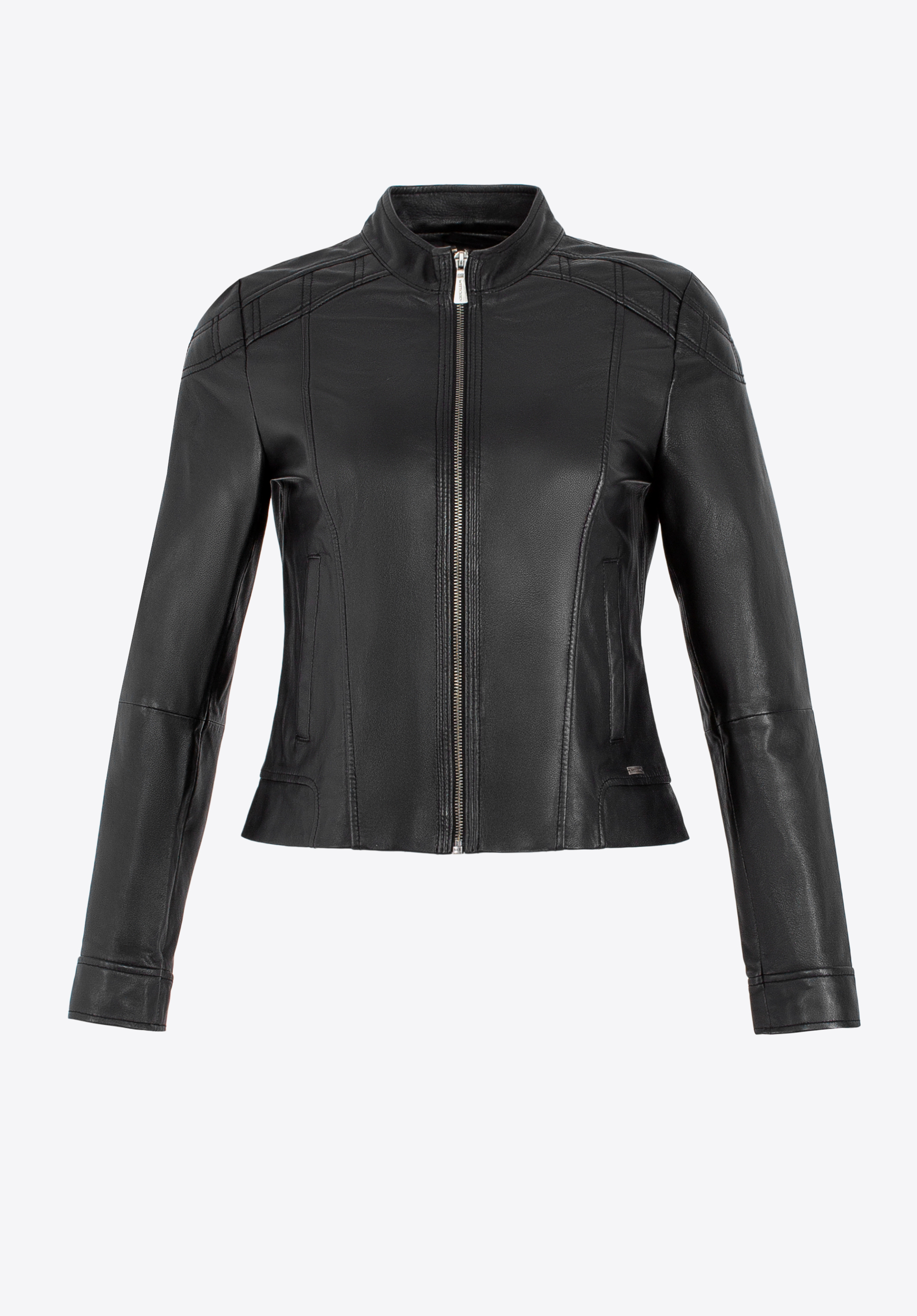 Luxury at its finest. This exceptional jacket made of natural sheep leather is the essence of classic style with modern accents. The tailored cut, subtle stitching on the shoulders, and eye-catching details make it the perfect choice for women who value high quality and an elegant look. The shorter, fitted cut accentuates the figure, while the classic collar adds a sophisticated touch to the overall design.
