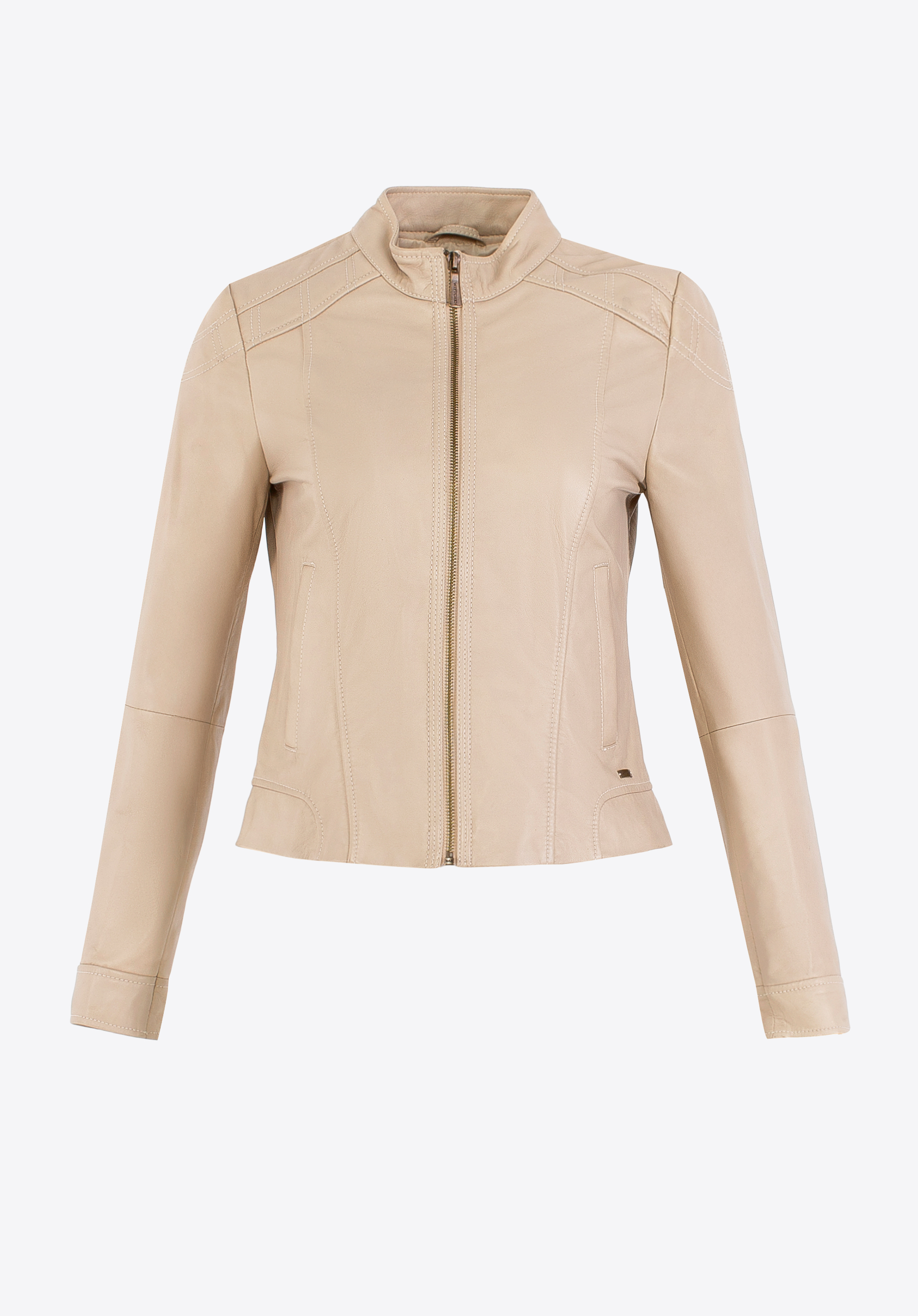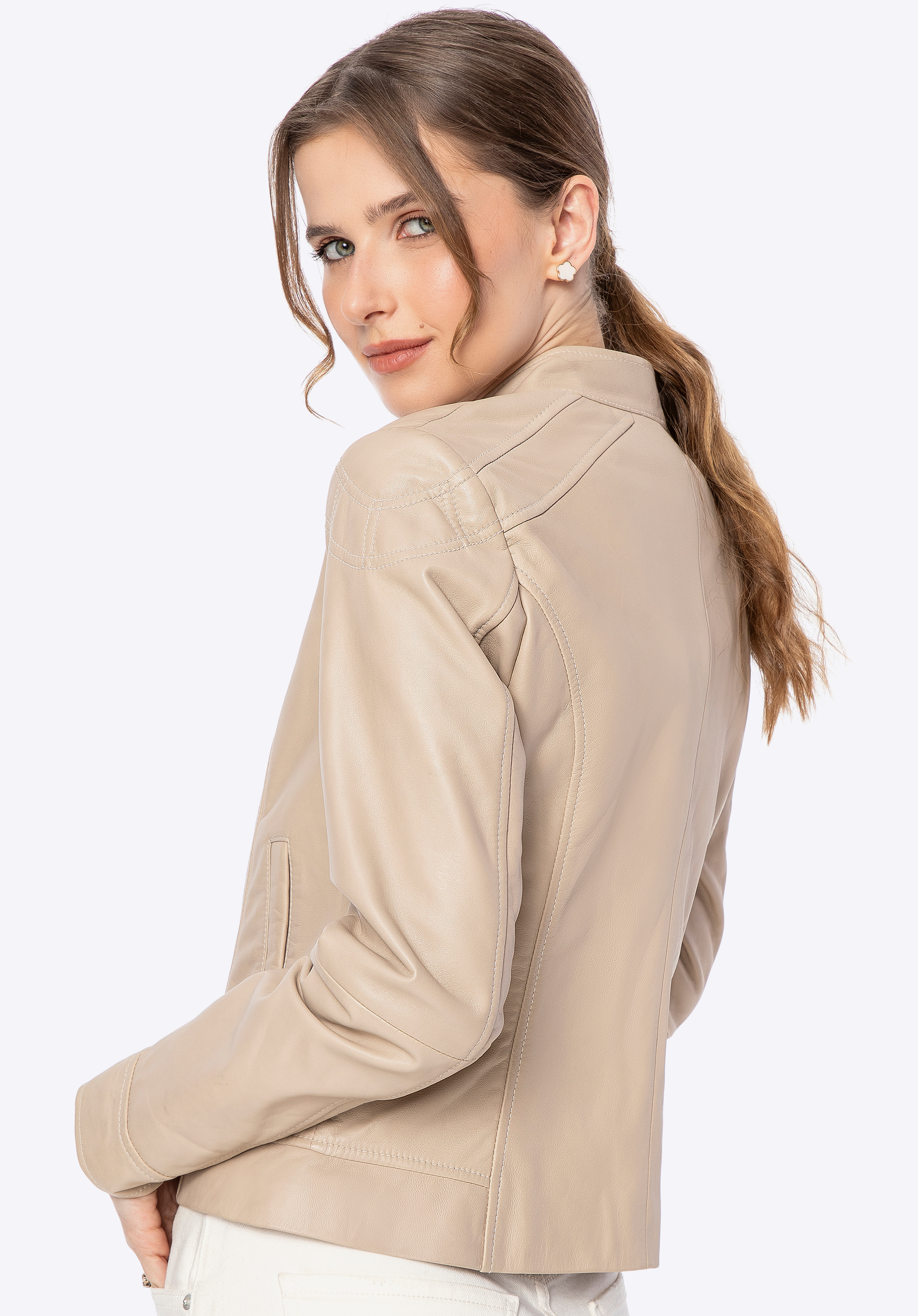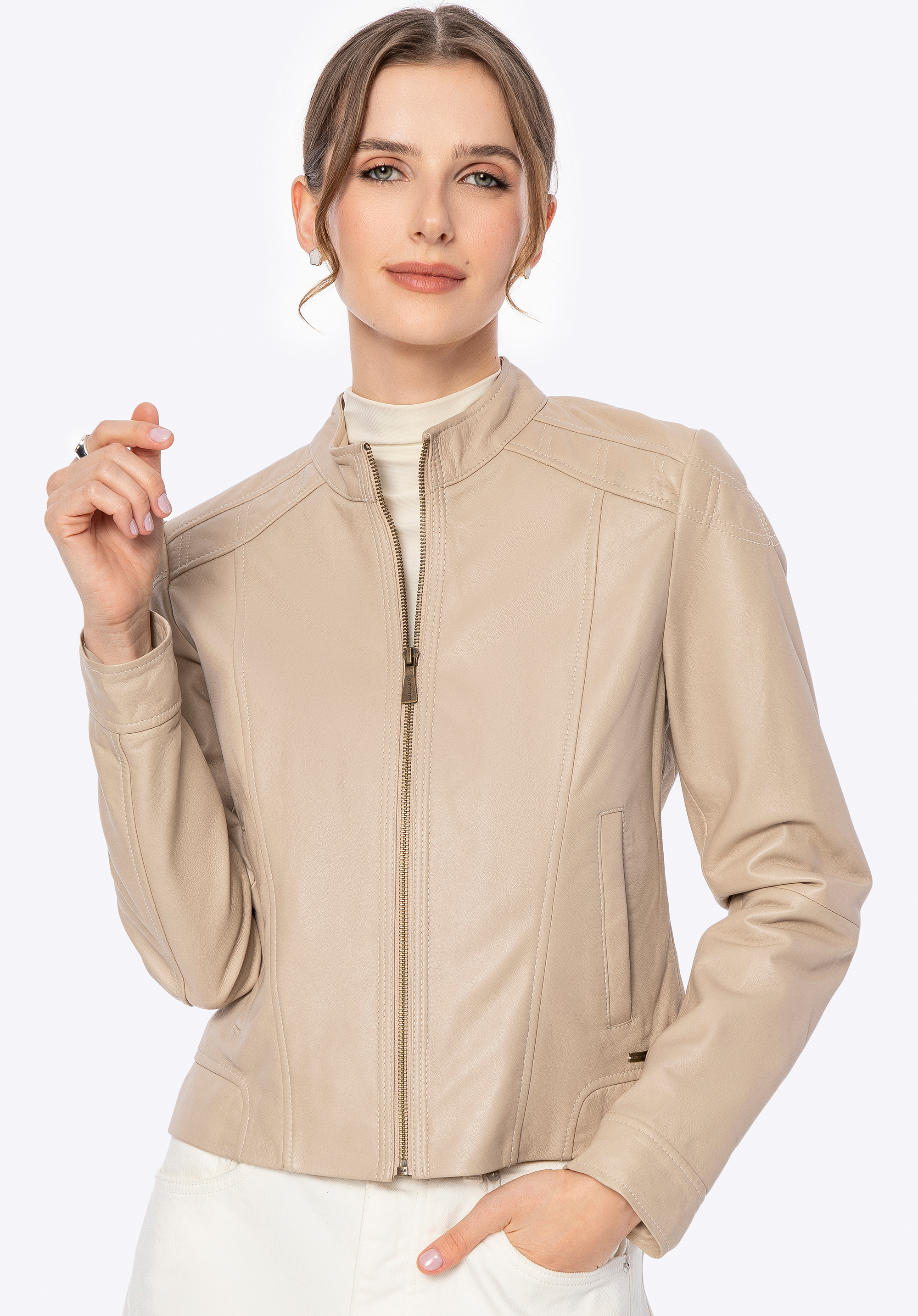 Luxury at its finest. This exceptional jacket made of natural sheep leather is the essence of classic style with modern accents. The tailored cut, subtle stitching on the shoulders, and eye-catching details make it the perfect choice for women who value high quality and an elegant look. The shorter, fitted cut accentuates the figure, while the classic collar adds a sophisticated touch to the overall design.