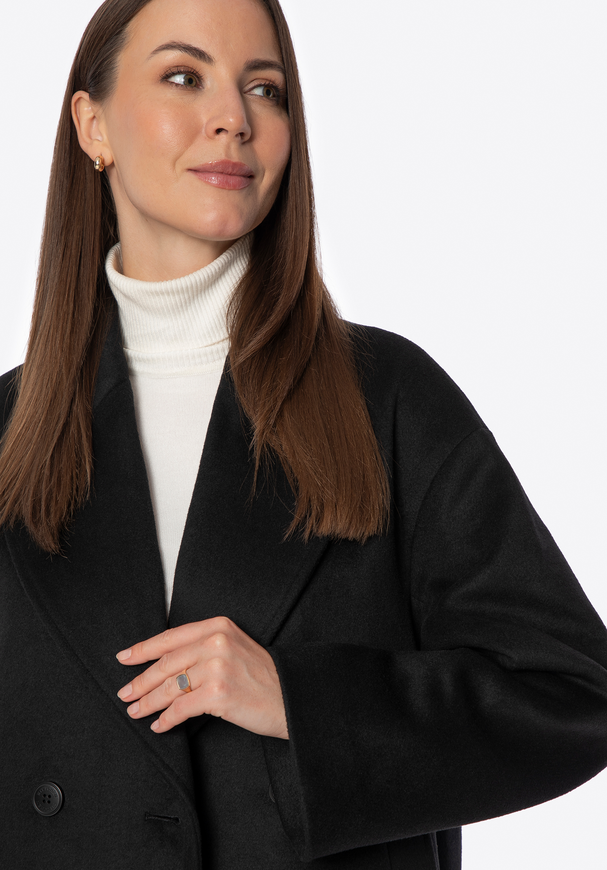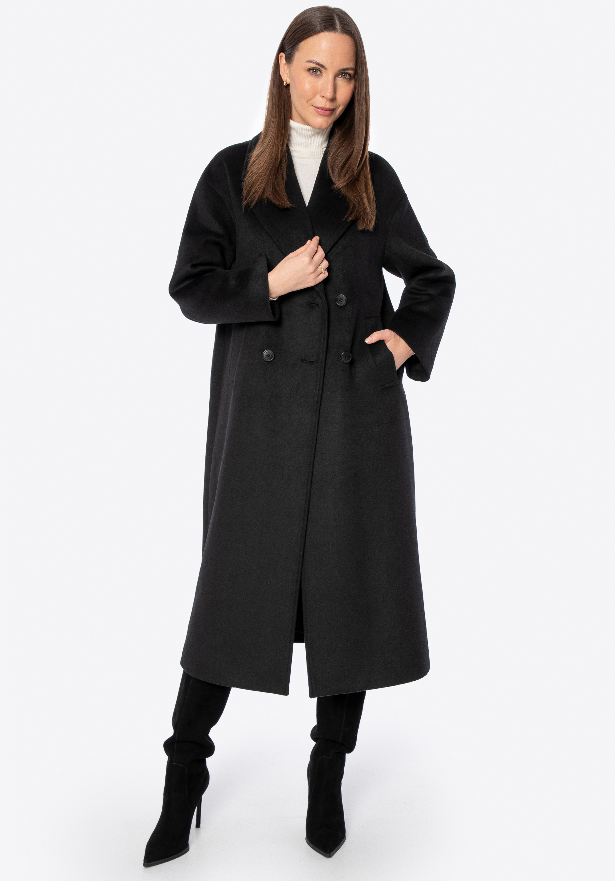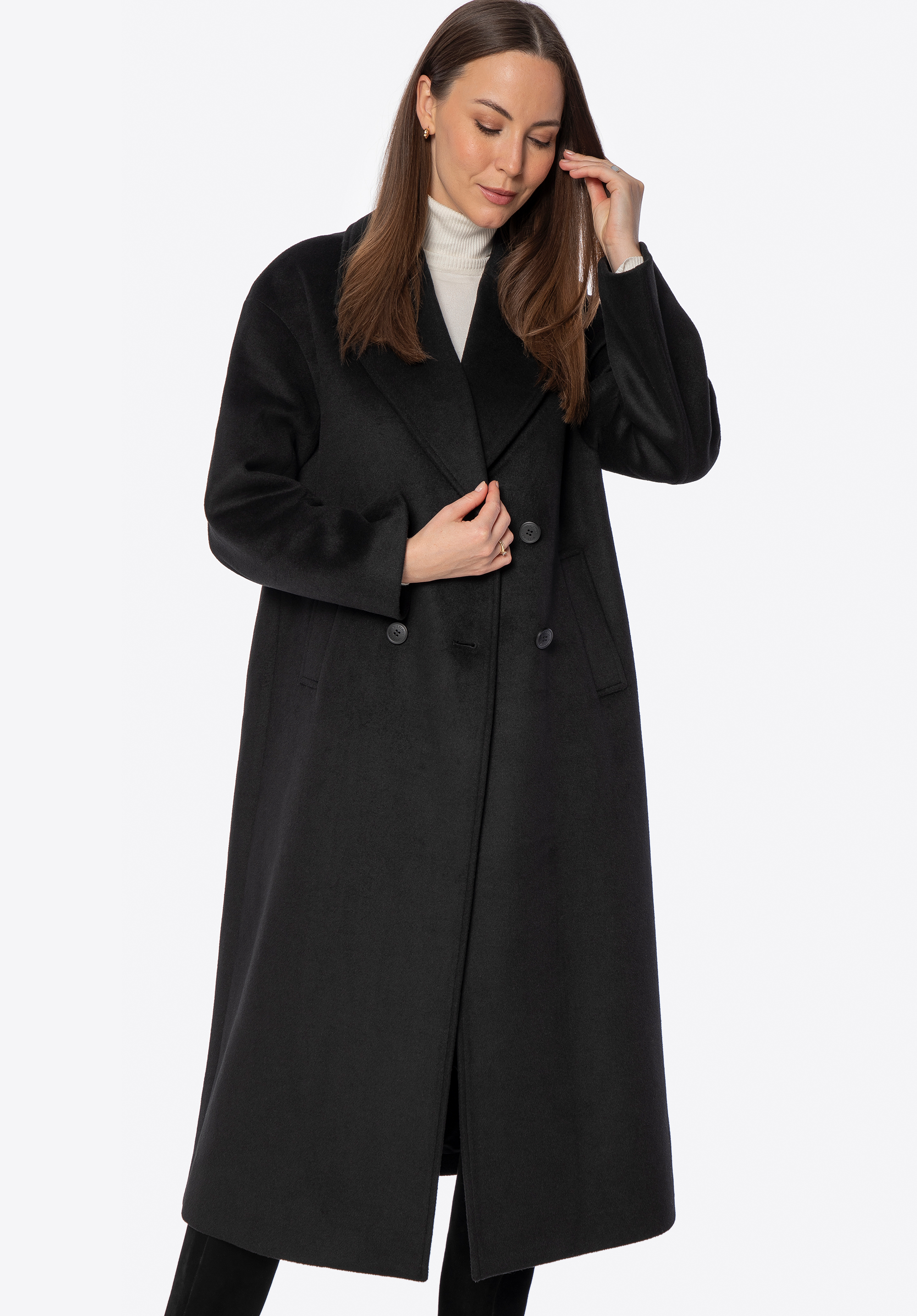 - Double-breasted button fastening: A timeless and elegant touch that adds structure and character to the coat.