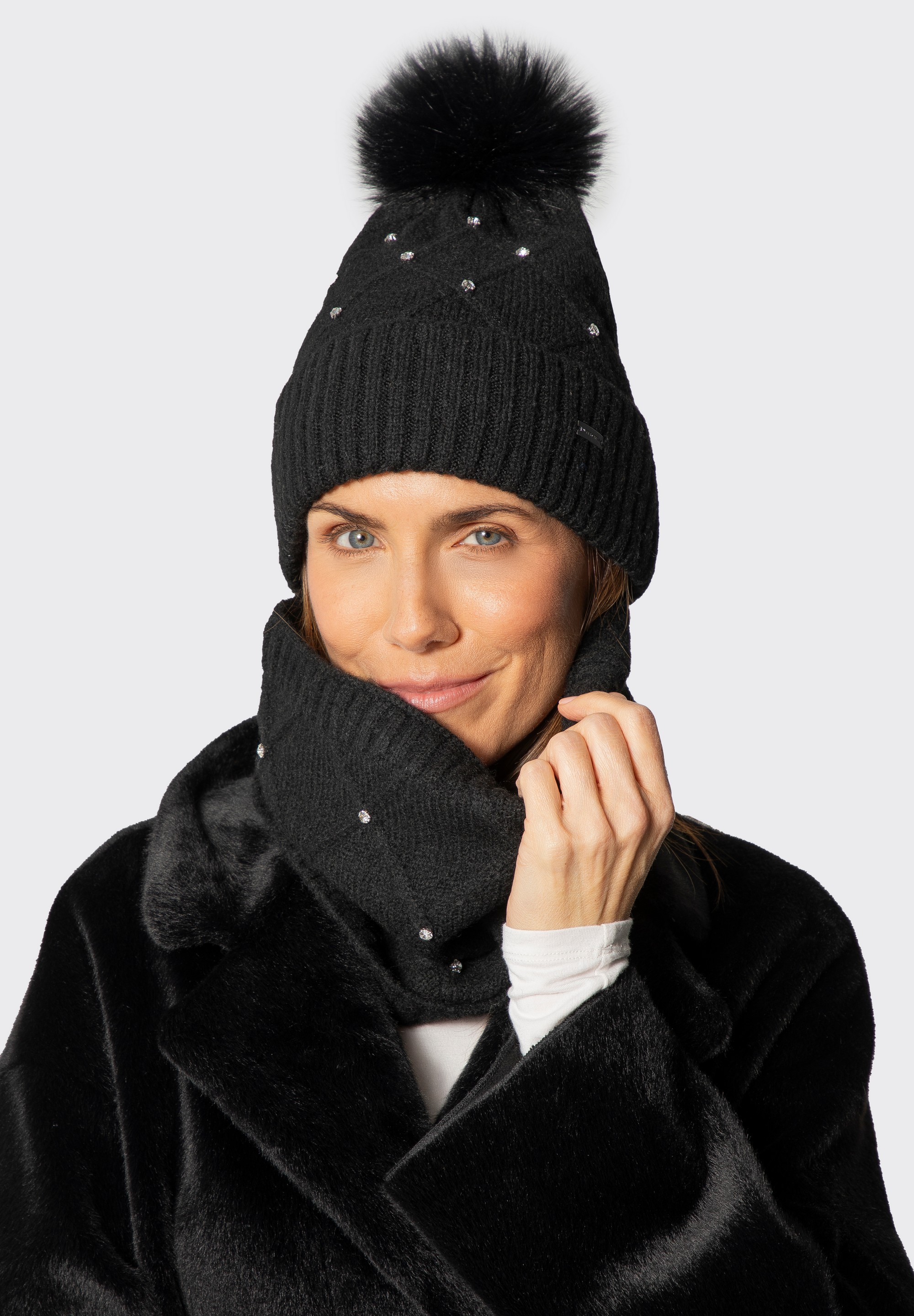 Our advice: This set is a great match for classic coats, quilted jackets or chunky knits. The hat features a soft polyester pom-pom and decorative synthetic crystal accents to add a feminine sparkle, while the snood with its textured knit offers extra warmth and comfort.