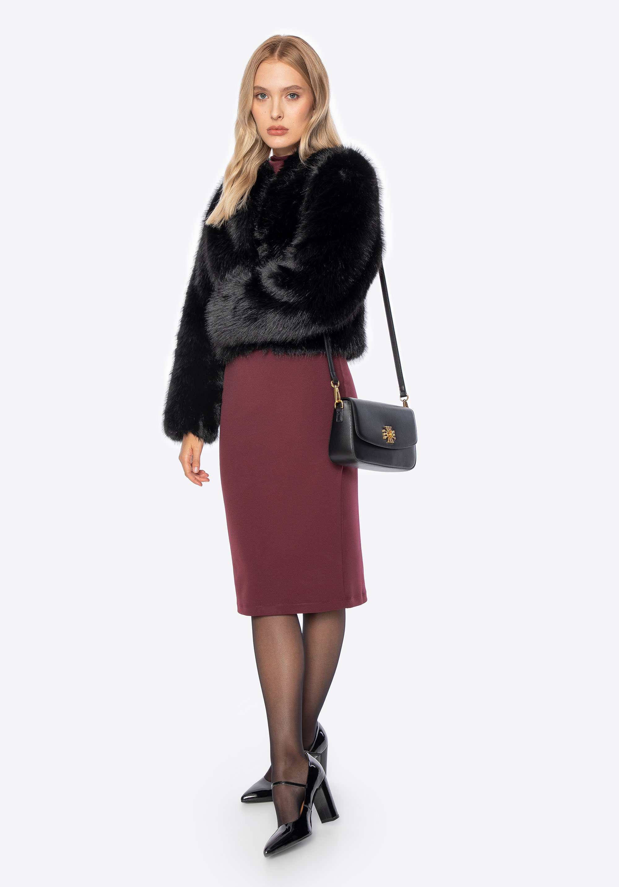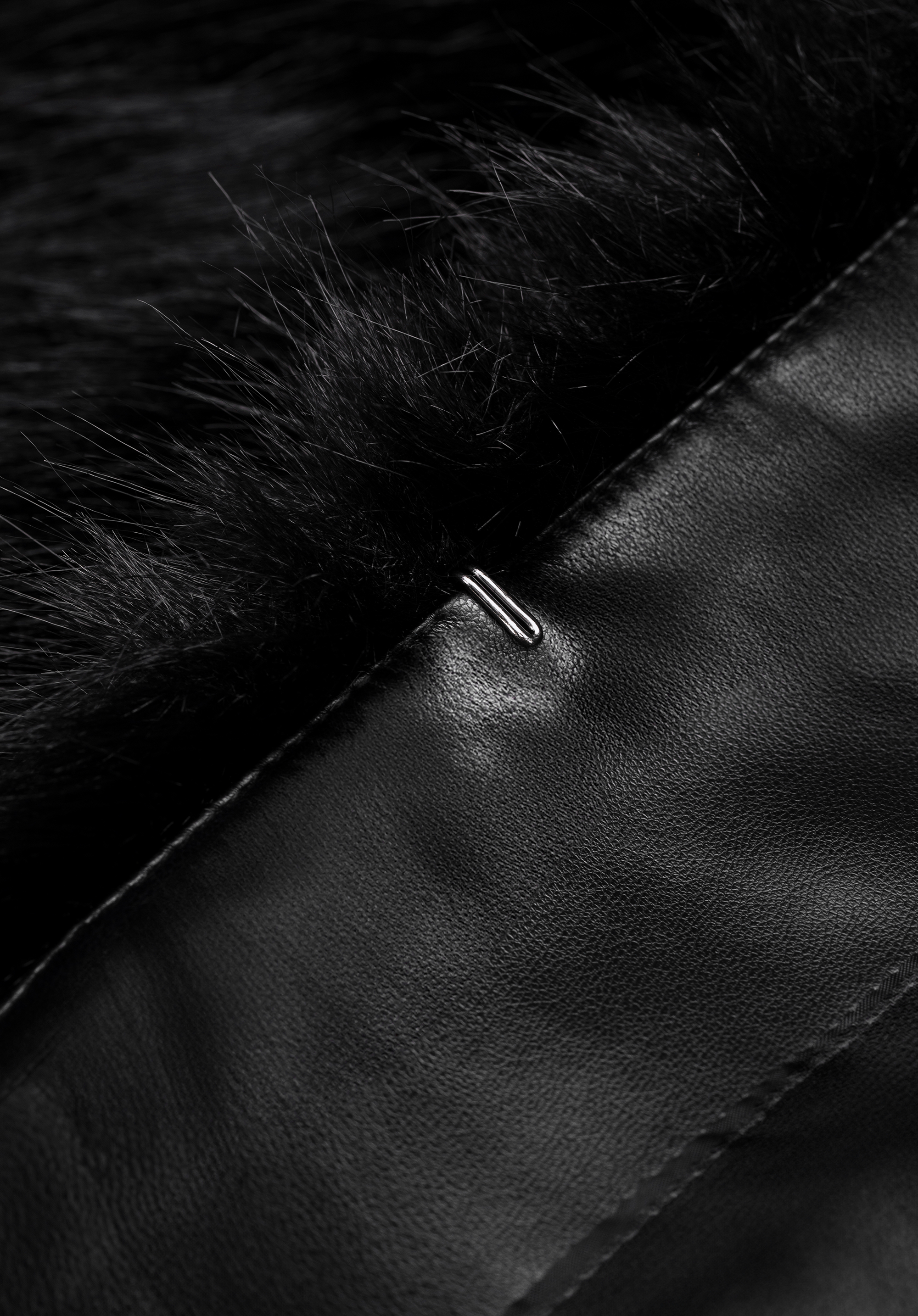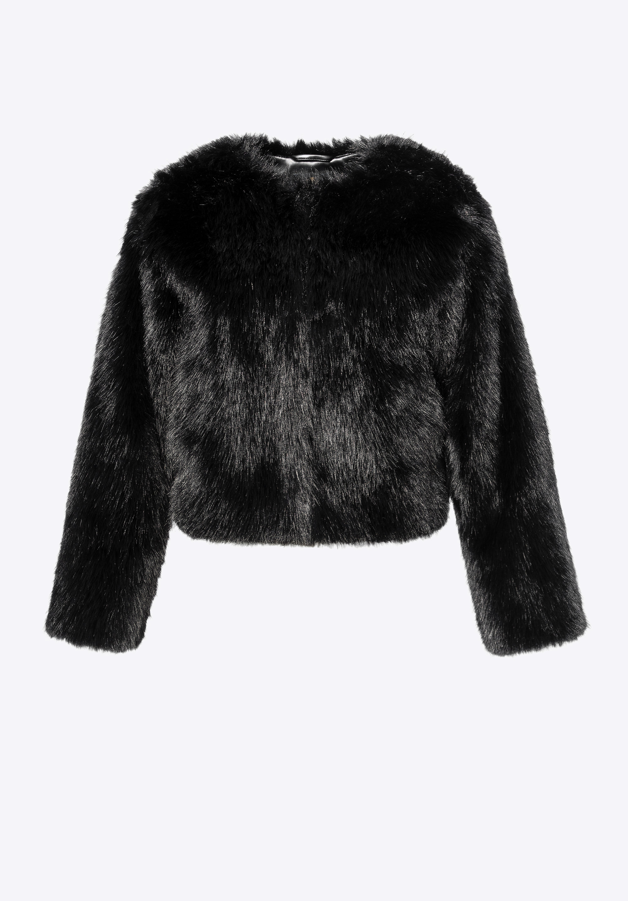 Full of style and feminine charm – this short women’s jacket made of faux fur is a must-have for lovers of urban elegance with a twist. Its soft, fluffy texture turns heads, while the bomber-inspired cut gives it a trendy and effortlessly stylish vibe. The jacket fastens with discreet hooks for a minimalist finish, and the round neckline adds a delicate touch of finesse. Two side pockets combine practicality with everyday comfort.