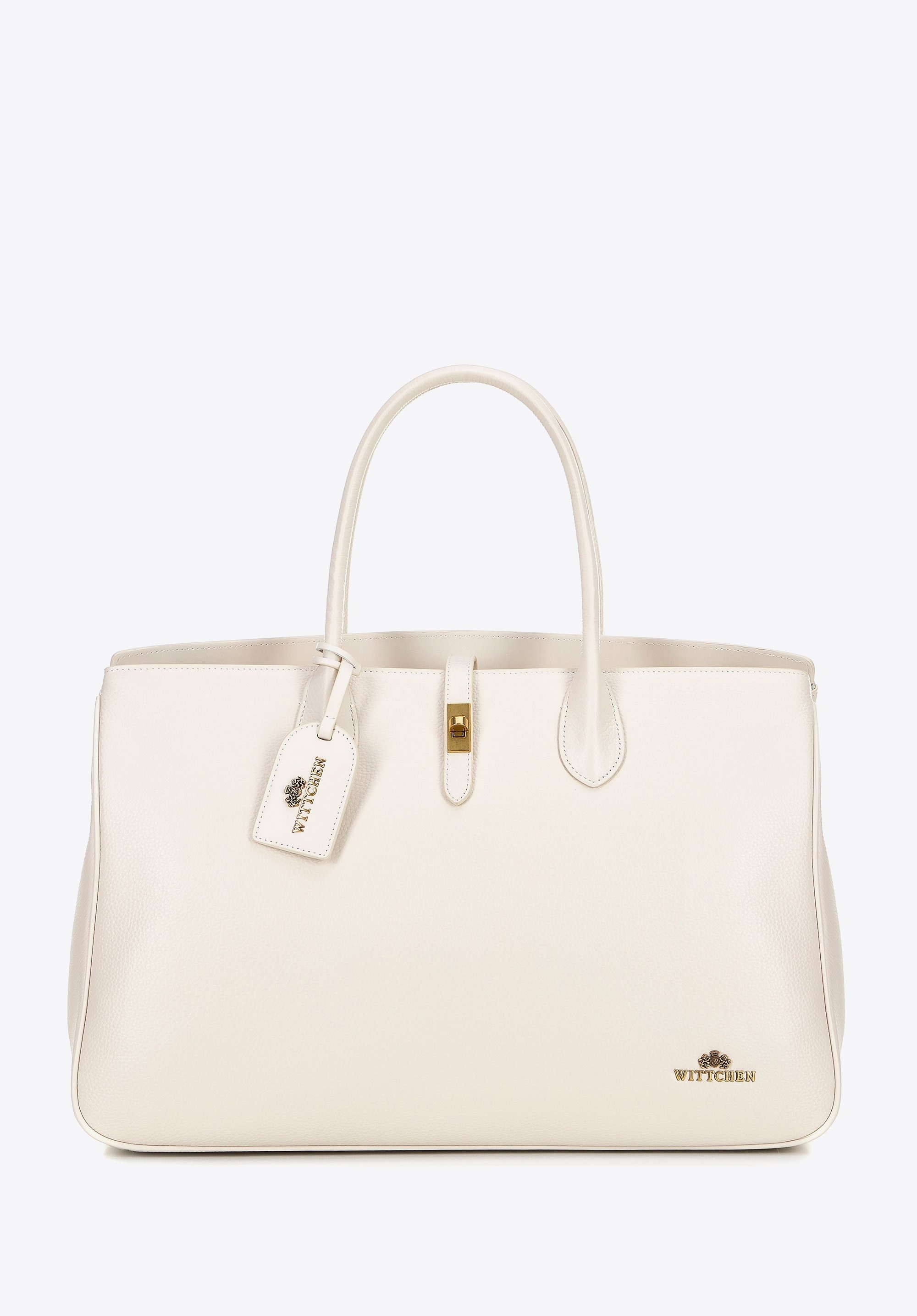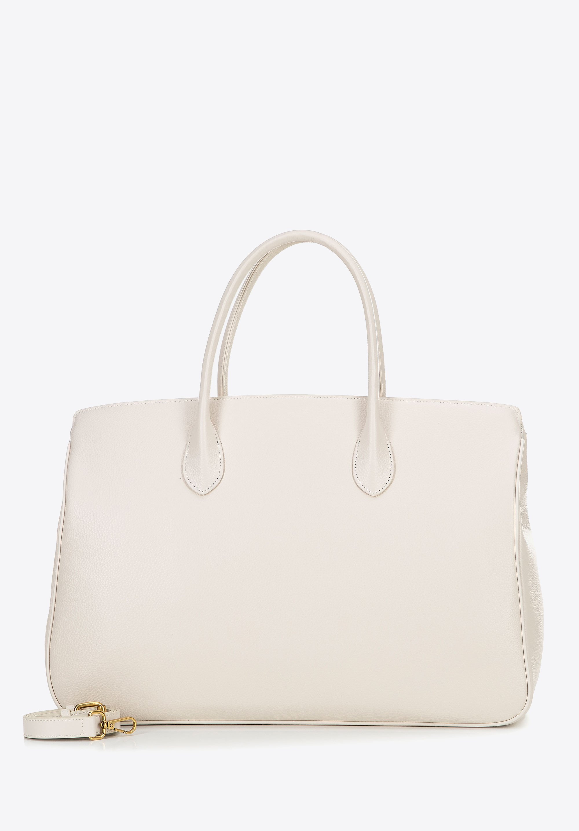 This elegant structured handbag crafted from natural leather with a microfibre strap blends timeless design with everyday practicality. It features two spacious compartments and fastens securely with a zip closure and buckle strap, keeping your belongings safe. Inside you’ll find a zipped pocket and a dedicated electronic device compartment (up to 23 × 33 cm, 15”). It’s the perfect choice for anyone seeking a roomy yet elegant everyday handbag.