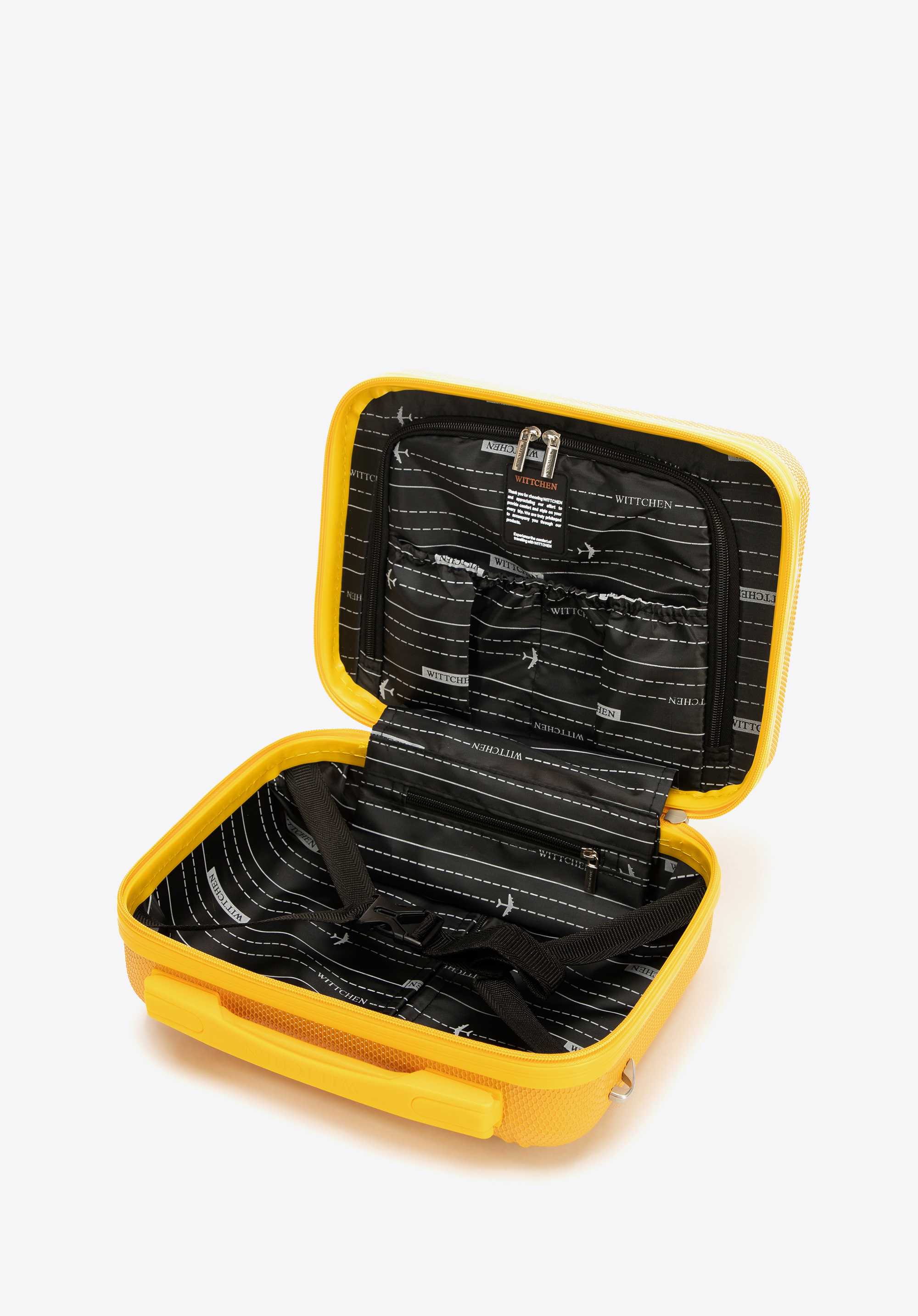 - Cosmetic case: Featuring a top handle, a detachable and adjustable shoulder strap, plus an elastic strap for attaching it to the suitcase handle.