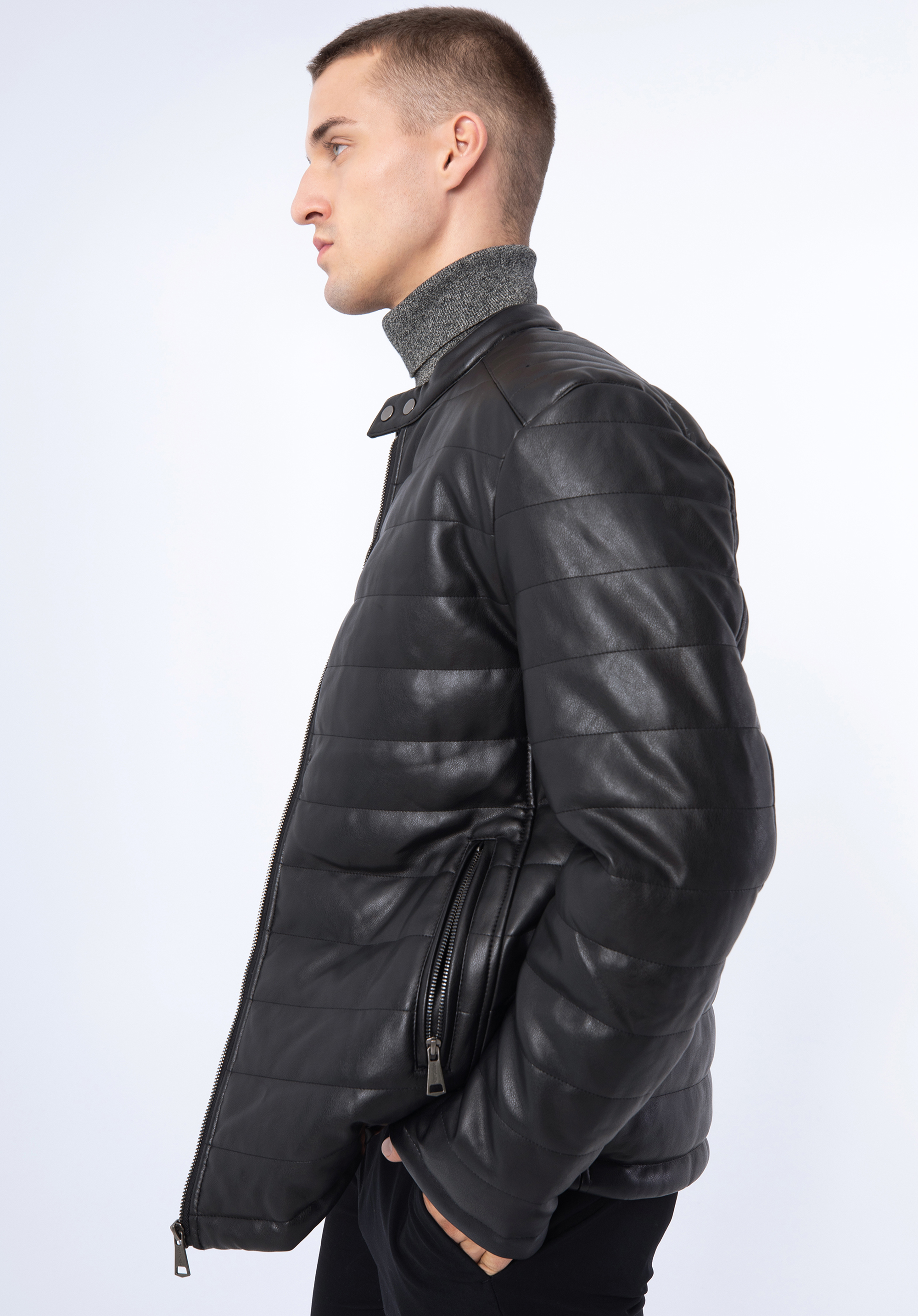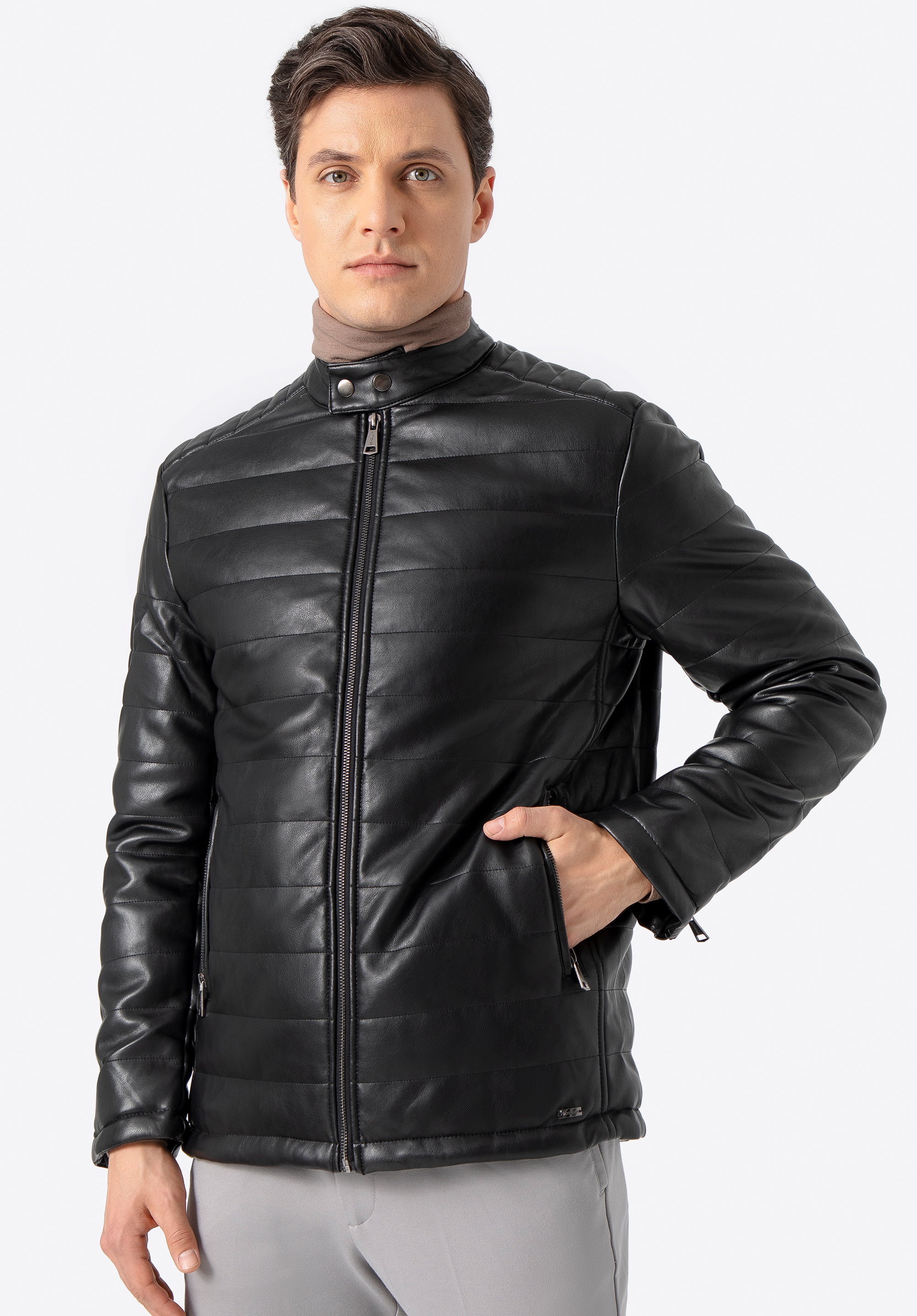 This classic men's jacket will make a stylish update to the modern gentleman's wardrobe. Finished with a quilted design, a short stand collar with double snap closure and two zipped hand pockets, this premium quality faux leather jacket boasts incredibly dapper style. The combination of a comfortable cut and quality of craftsmanship provides excellent protection on colder days. This garment will team perfectly with many masculine outfits. This is sure to be an enduring addition to your outdoor favourites. Men's quilted faux leather jacket is a timeless accessory for every elegant man.