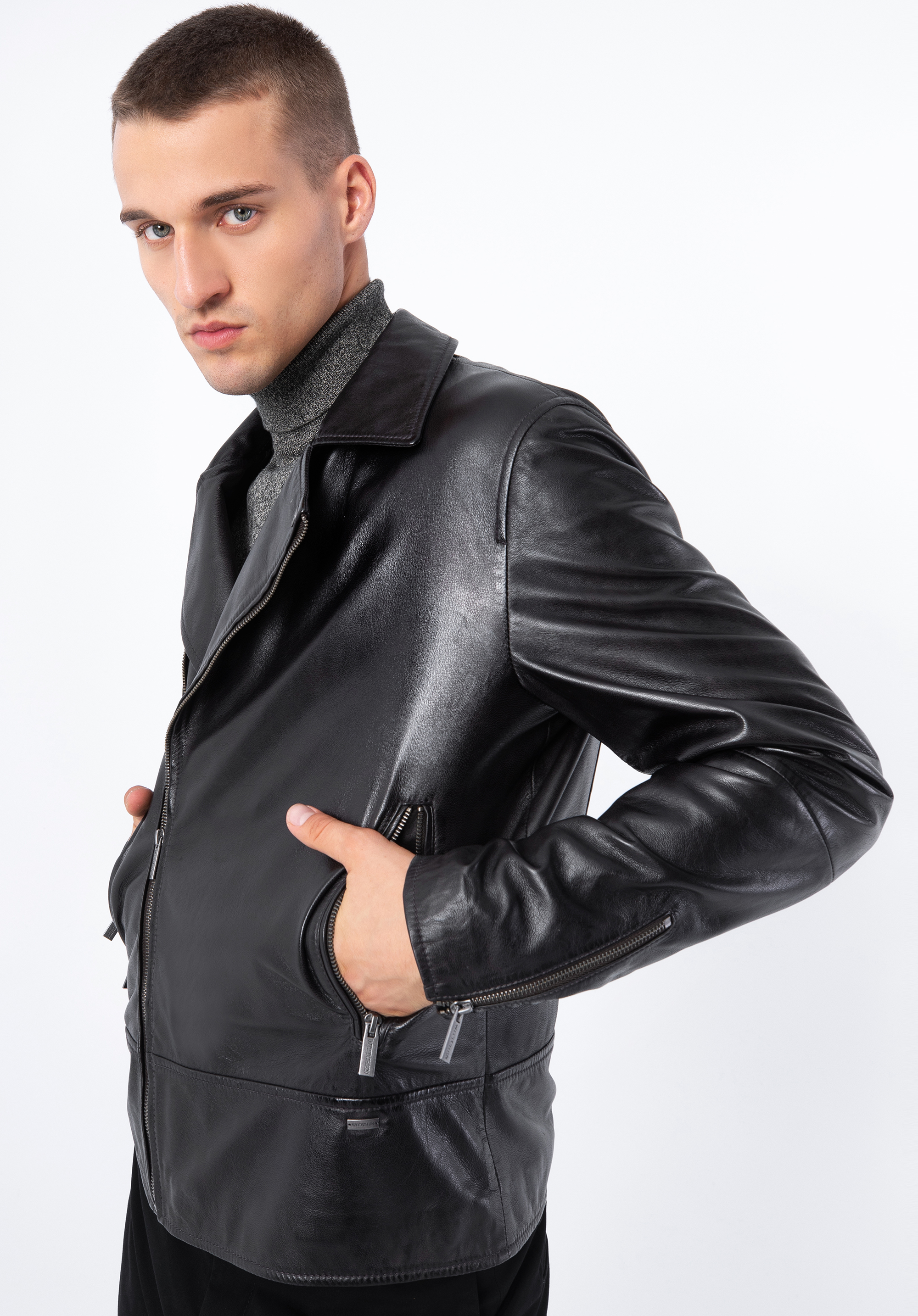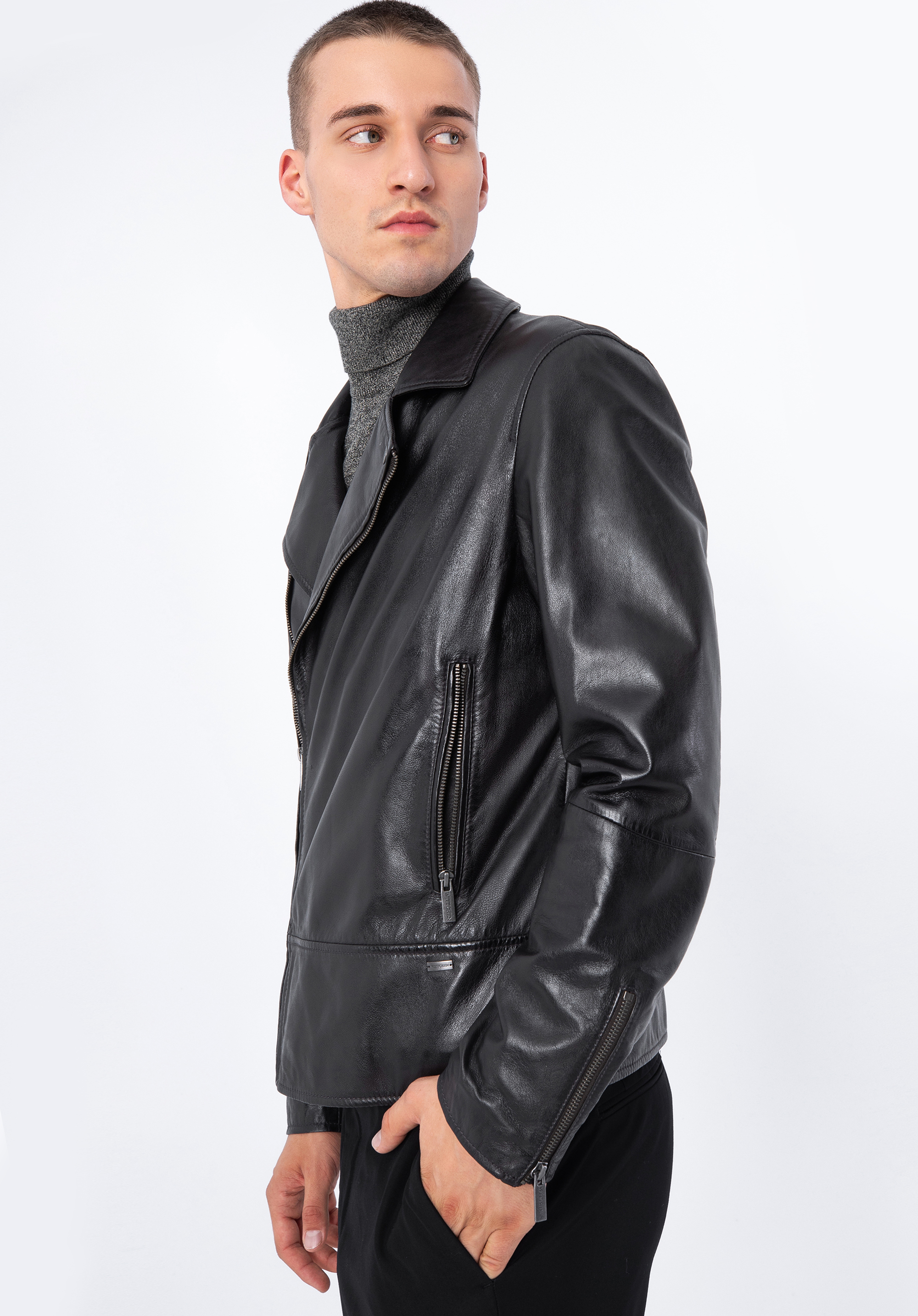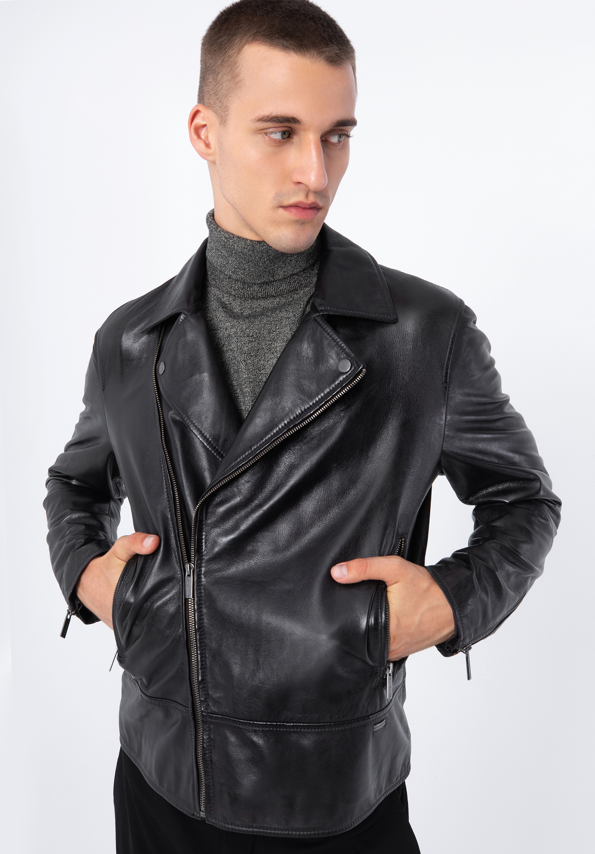 Men's leather biker jacket is bang on trend and a must have addition to your wardrobe. Timeless design with a turn down collar, asymmetric zipper and gleaming studs will add a touch of rock'n'roll vibe to your wear. Crafted from soft sheepskin leather, this jacket has been designed with seam detailing and zipped sleeves. This motor jacket is just what you need to add some extra flavor to your favourite outfits. A classic men's jacket is perfect for everyday use from spring to autumn as well as during colder months of summer.