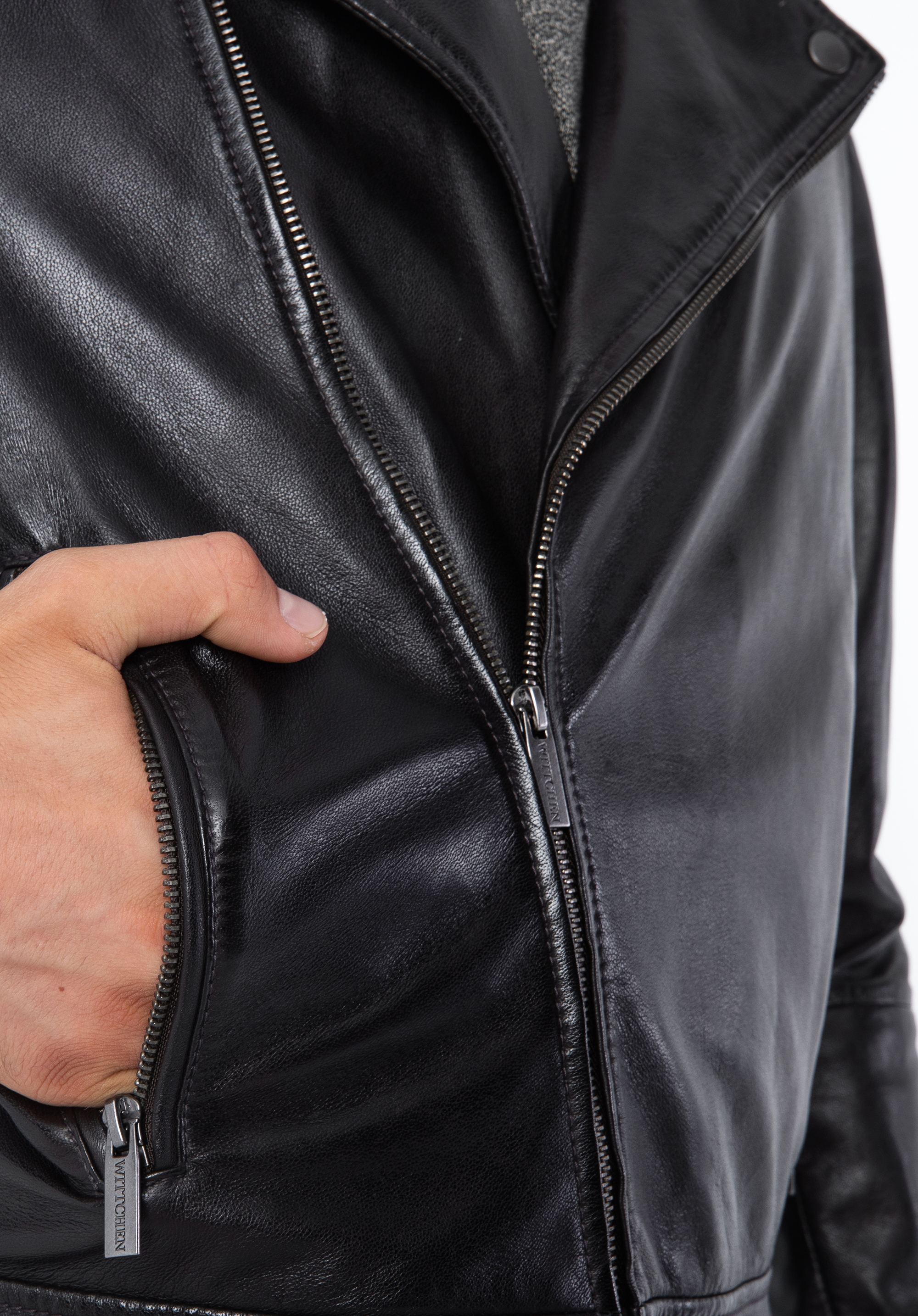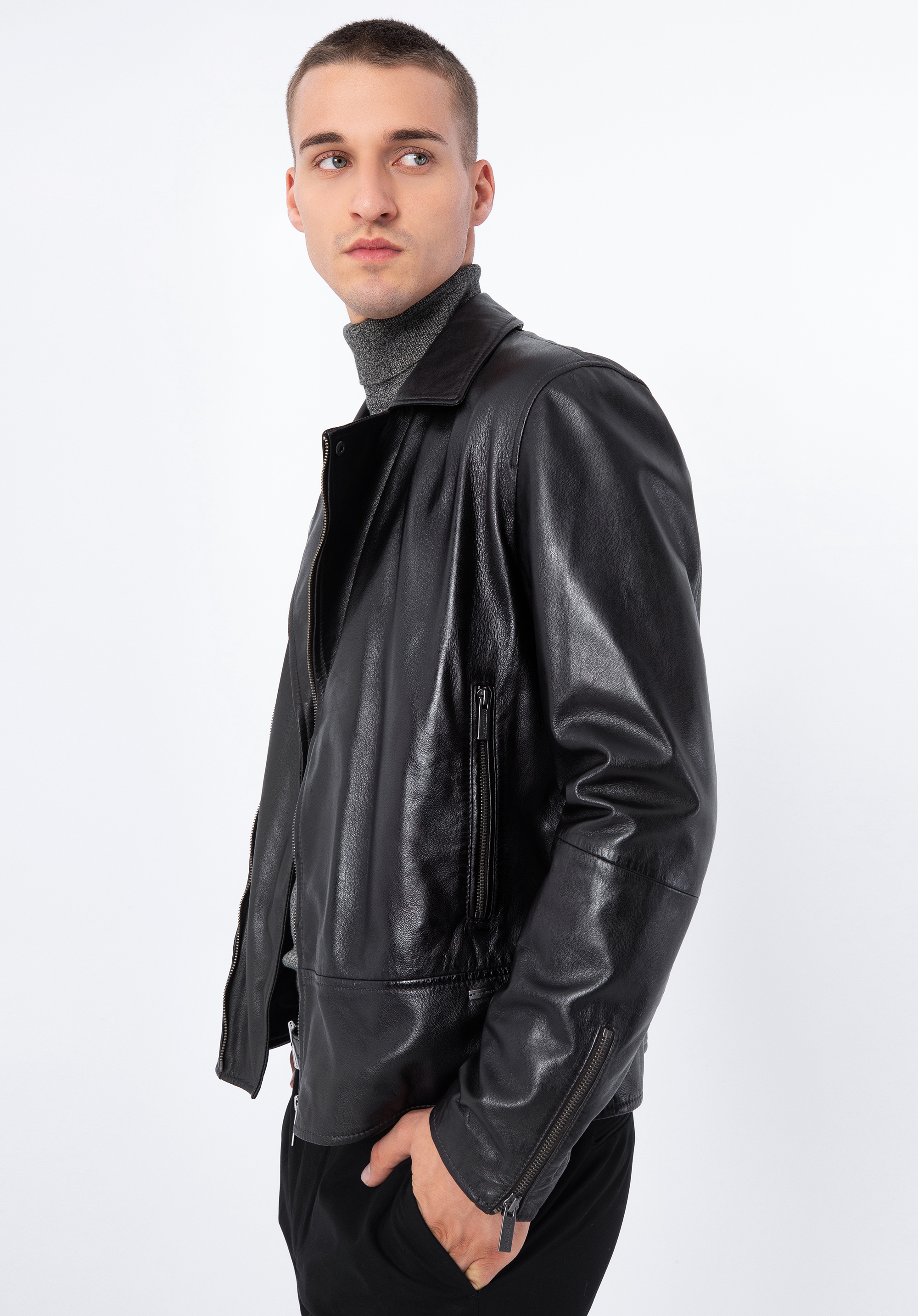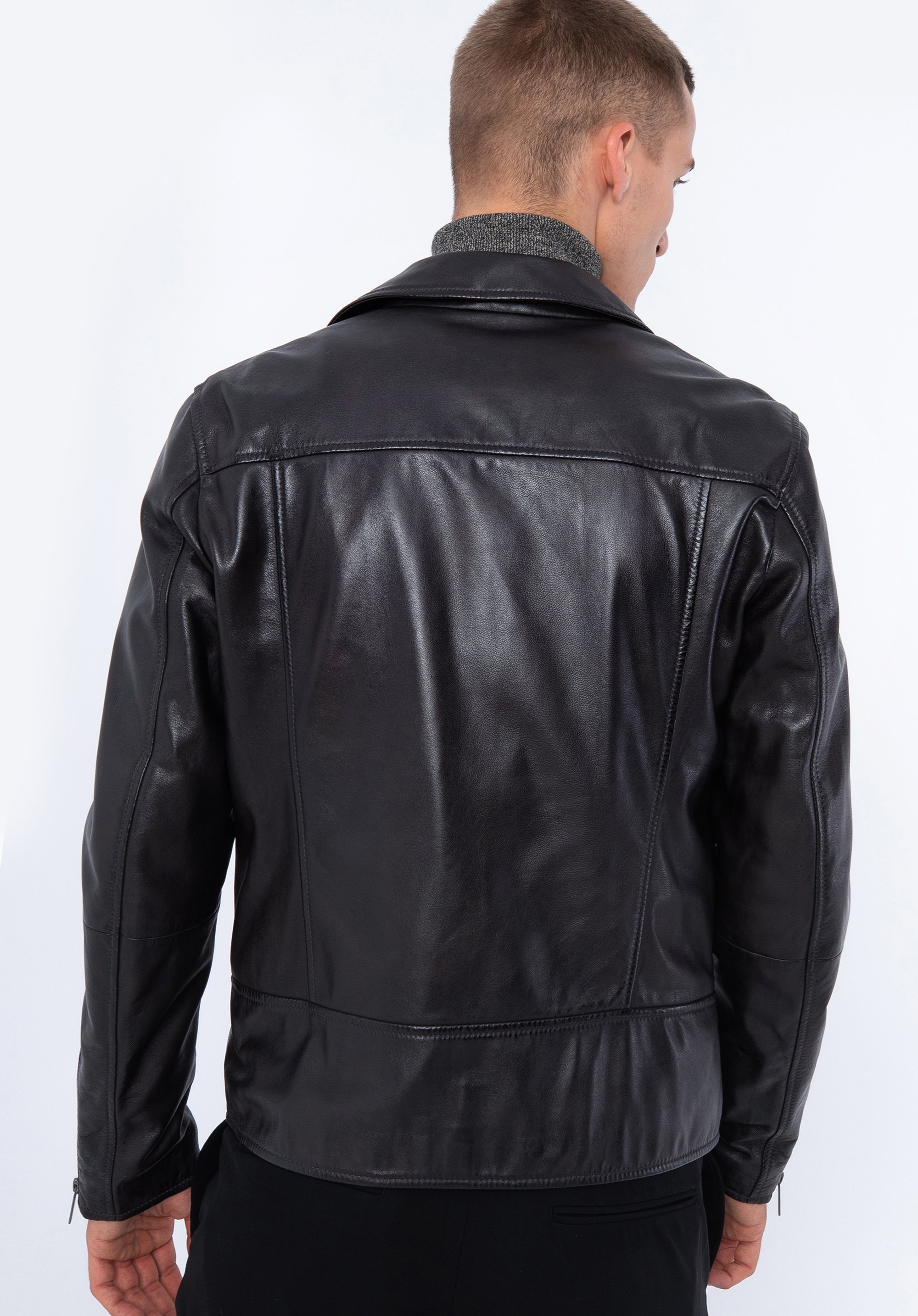 Men's leather biker jacket is bang on trend and a must have addition to your wardrobe. Timeless design with a turn down collar, asymmetric zipper and gleaming studs will add a touch of rock'n'roll vibe to your wear. Crafted from soft sheepskin leather, this jacket has been designed with seam detailing and zipped sleeves. This motor jacket is just what you need to add some extra flavor to your favourite outfits. A classic men's jacket is perfect for everyday use from spring to autumn as well as during colder months of summer.