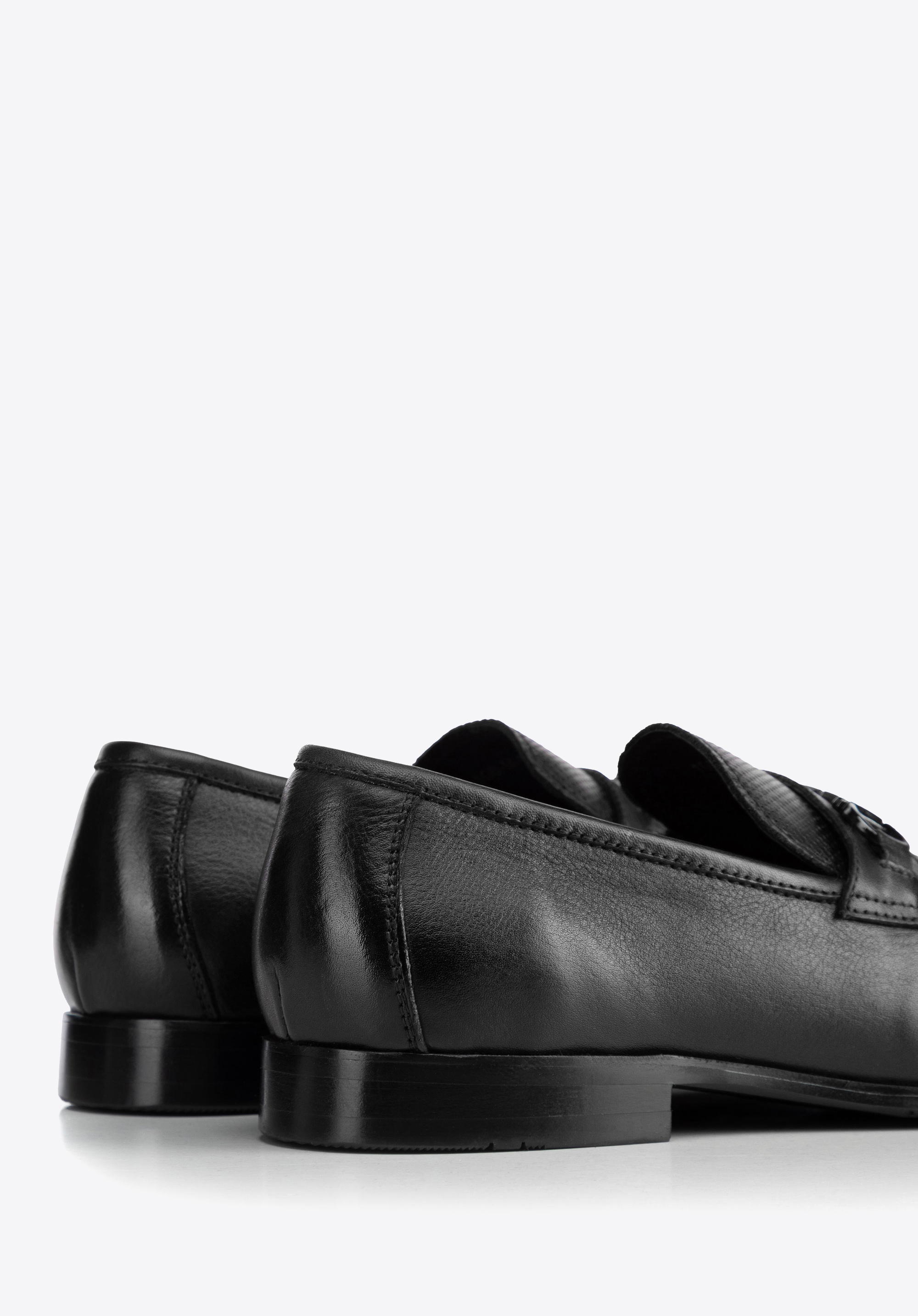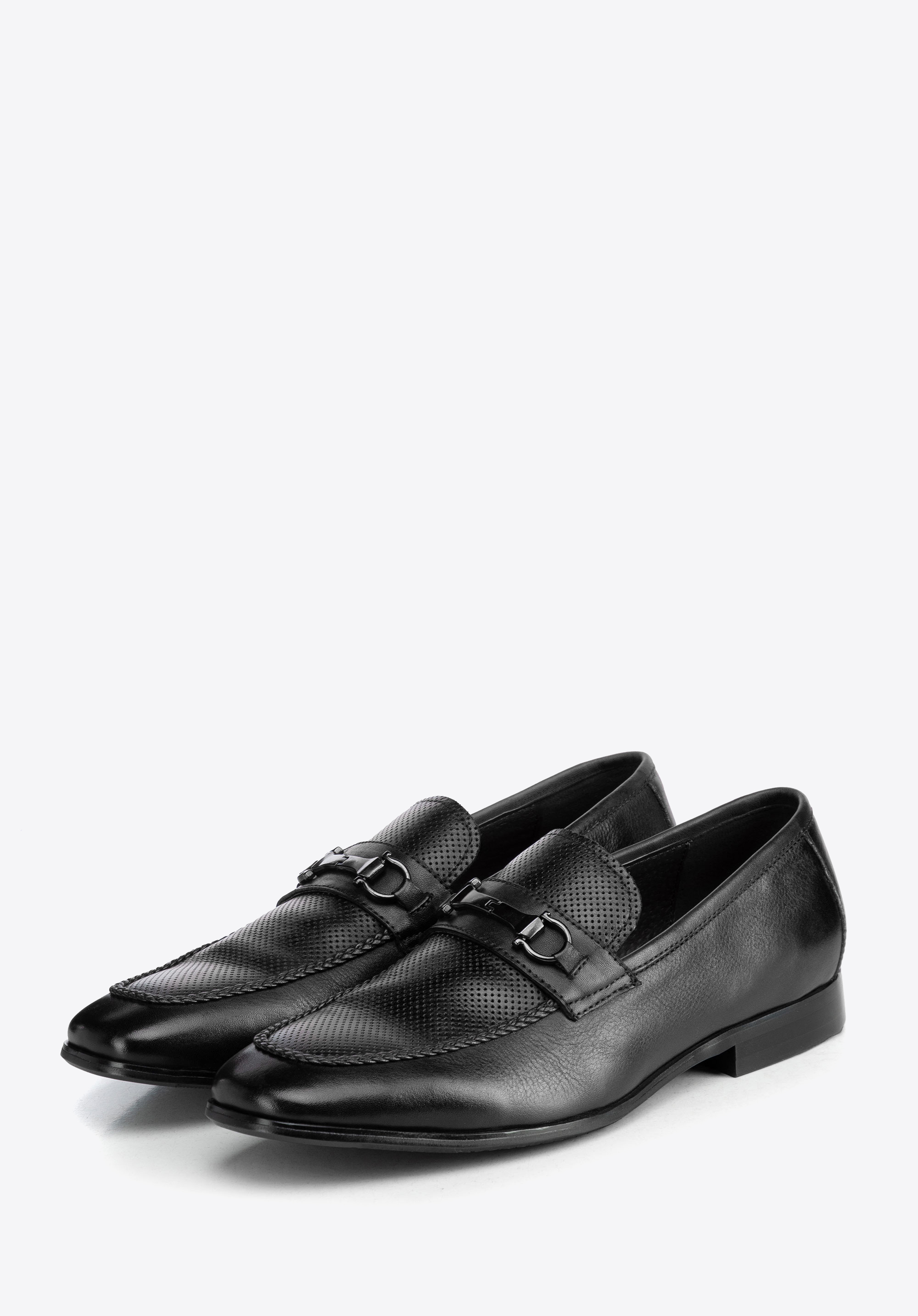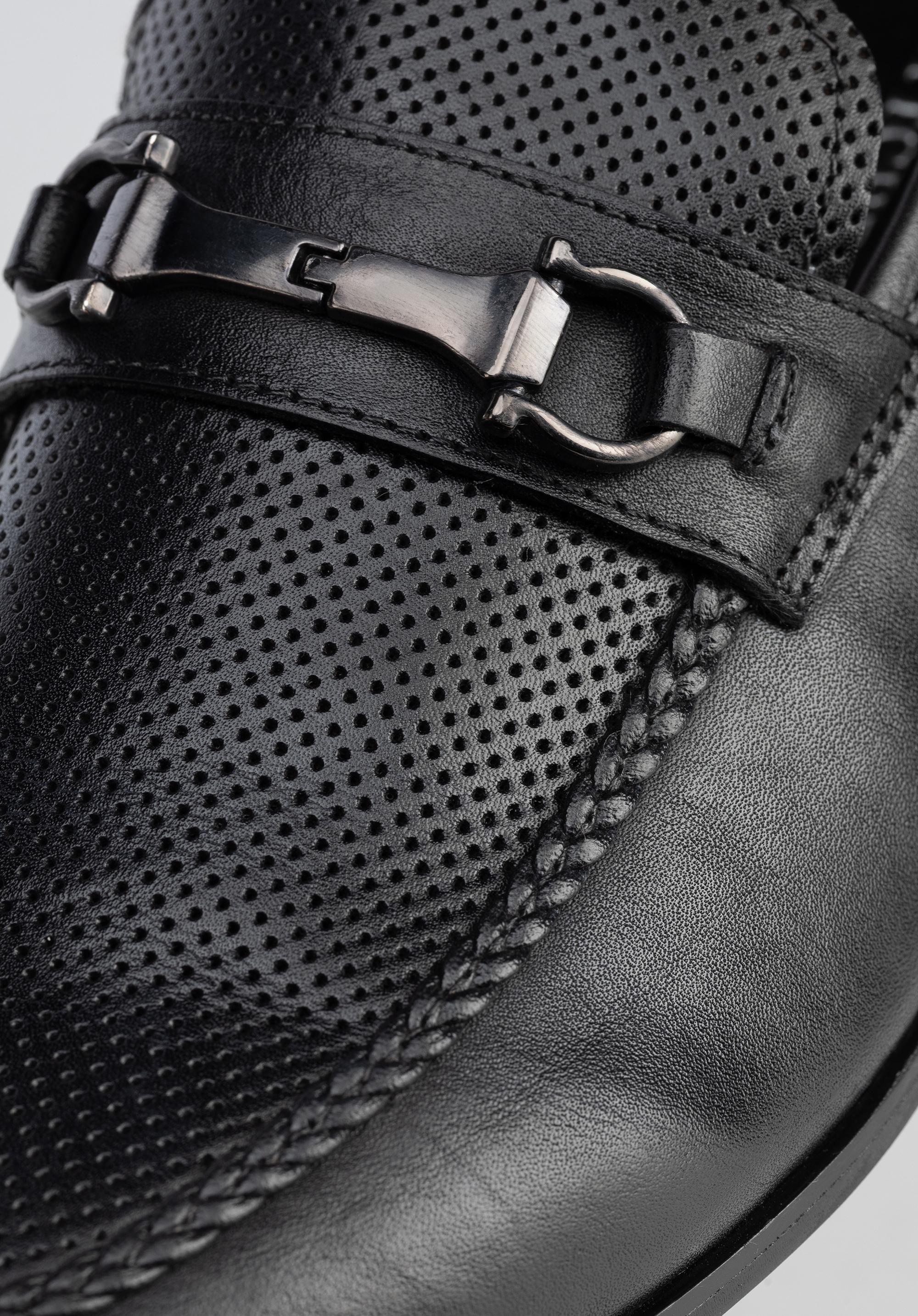 Timeless and elegant – these moccasins, crafted from natural leather, combine classic style with refined detailing. Featuring decorative perforations, a woven stitch on the vamp, and a strap with a metal buckle, they offer a sophisticated twist on a traditional silhouette. The lightly rounded square toe, leather insole, and durable rubber sole make them a comfortable choice for both everyday wear and special occasions.