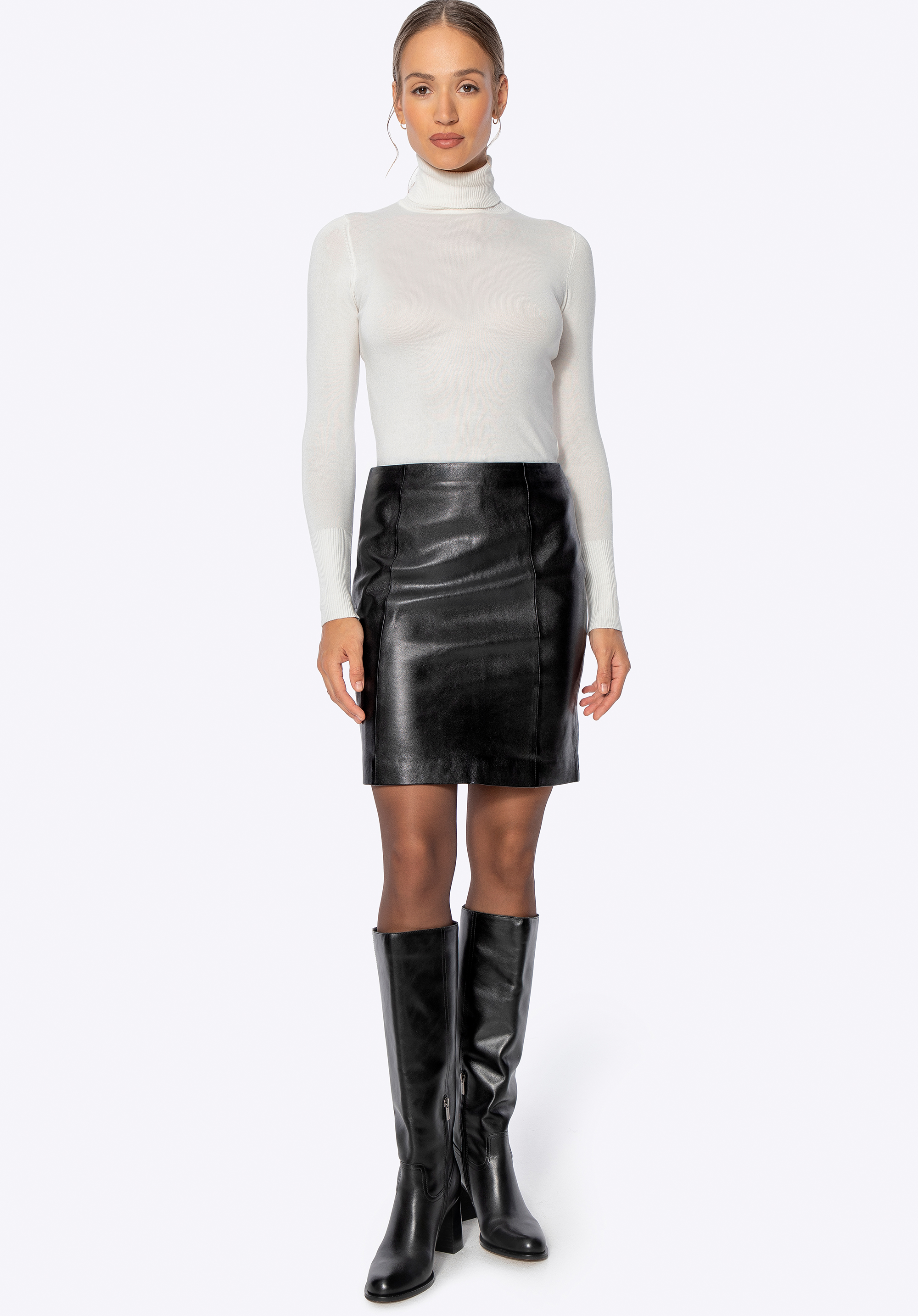 This natural sheepskin leather skirt combines luxury, timeless style and a flattering cut. The fitted silhouette subtly enhances the figure, while the slightly high waist shapes the waist and balances the proportions. Vertical seams at the front create a slimming effect, and the classic back slit allows full freedom of movement. A discreetly placed side zip ensures easy dressing, while carefully crafted finishing details highlight the skirt’s elegant character. The above-the-knee length adds a modern touch and a hint of feminine flair.