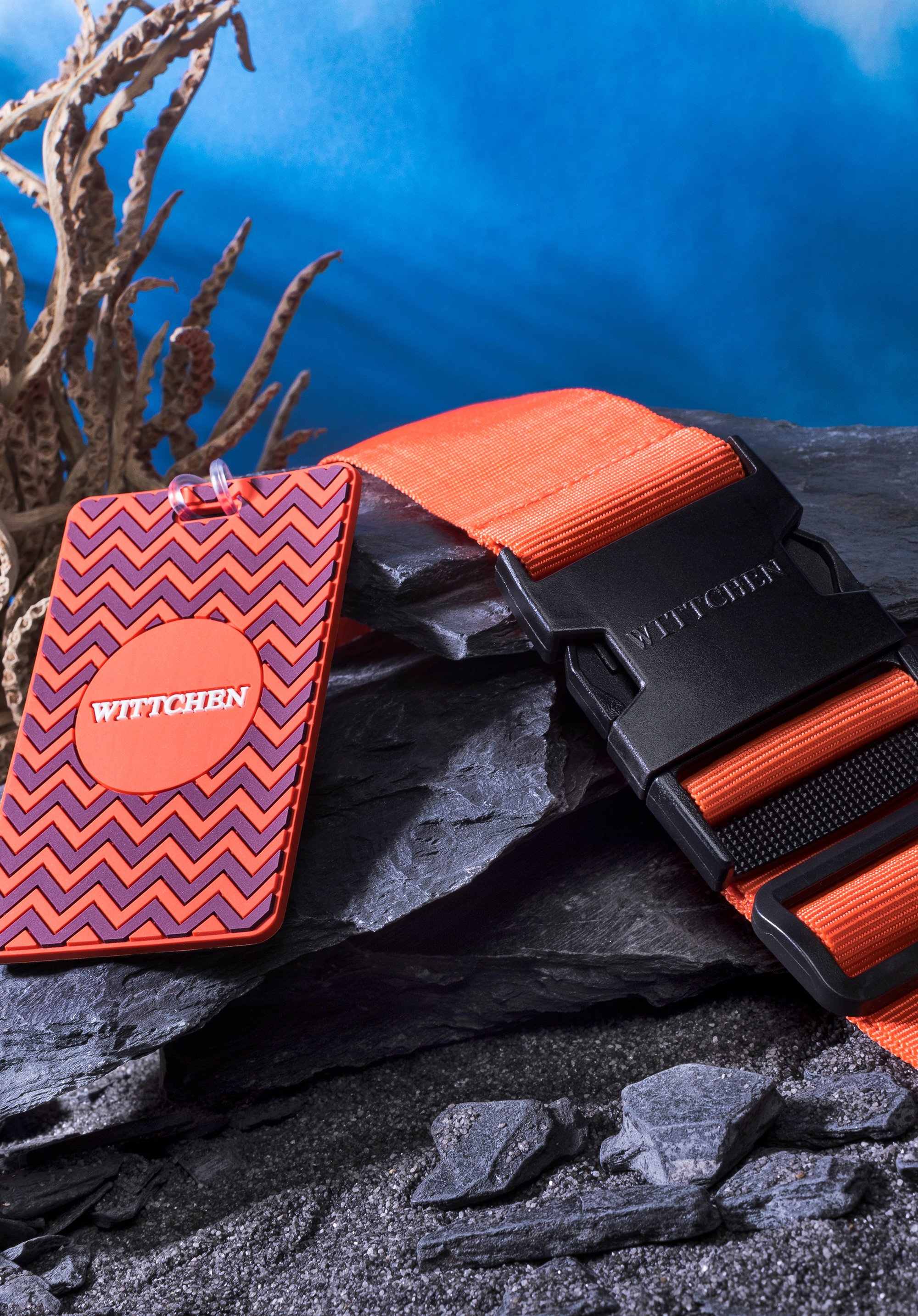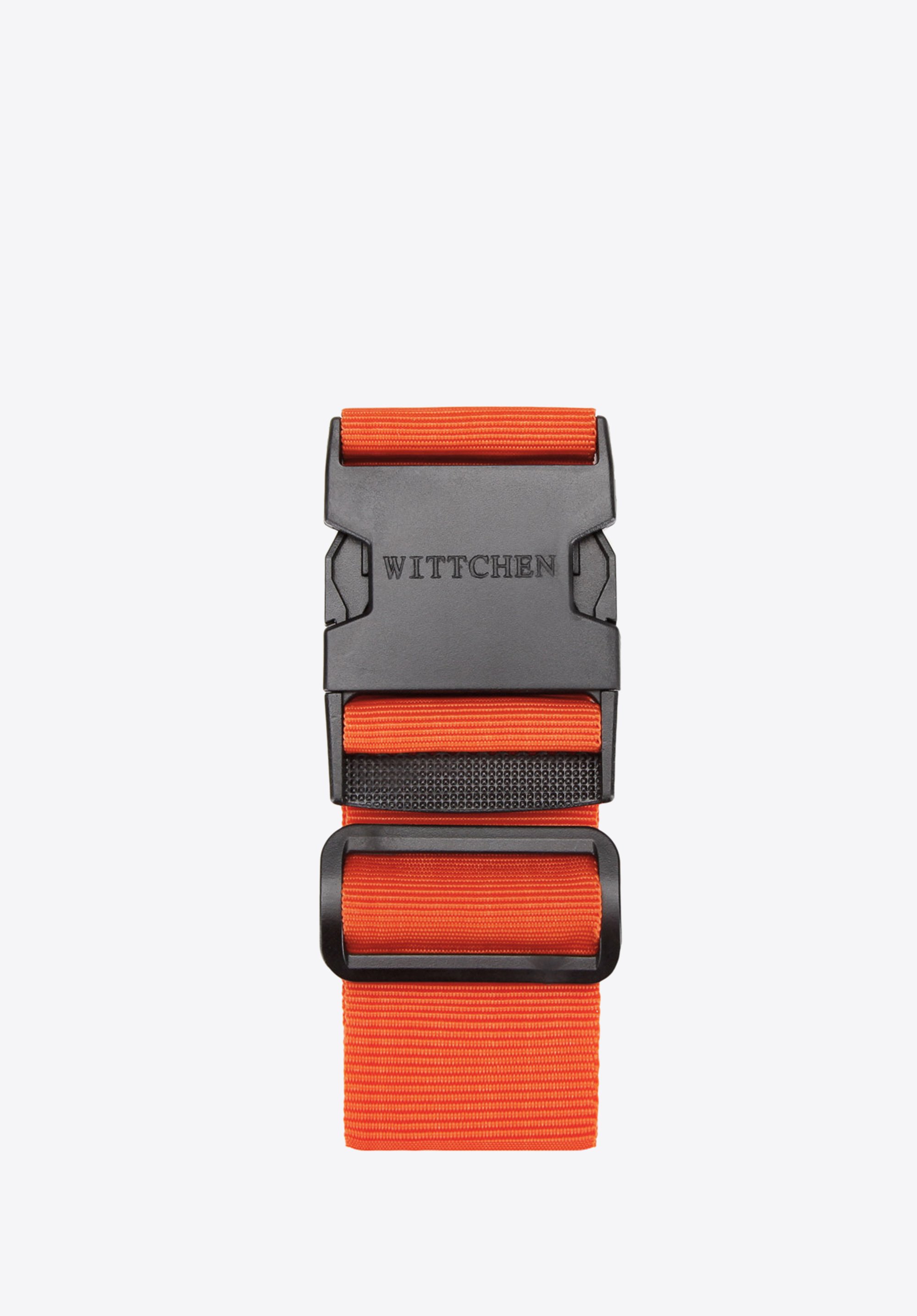 Luggage strap made from durable polyester. This sturdy closure strap protects your luggage in the travel and keeps your belongings in good condition. It adjusts to fit different size of luggage. This accessory is available in a wide variety of colours: green, purple, orange, red, blue, dark purple and multicoloured with branded monograms.