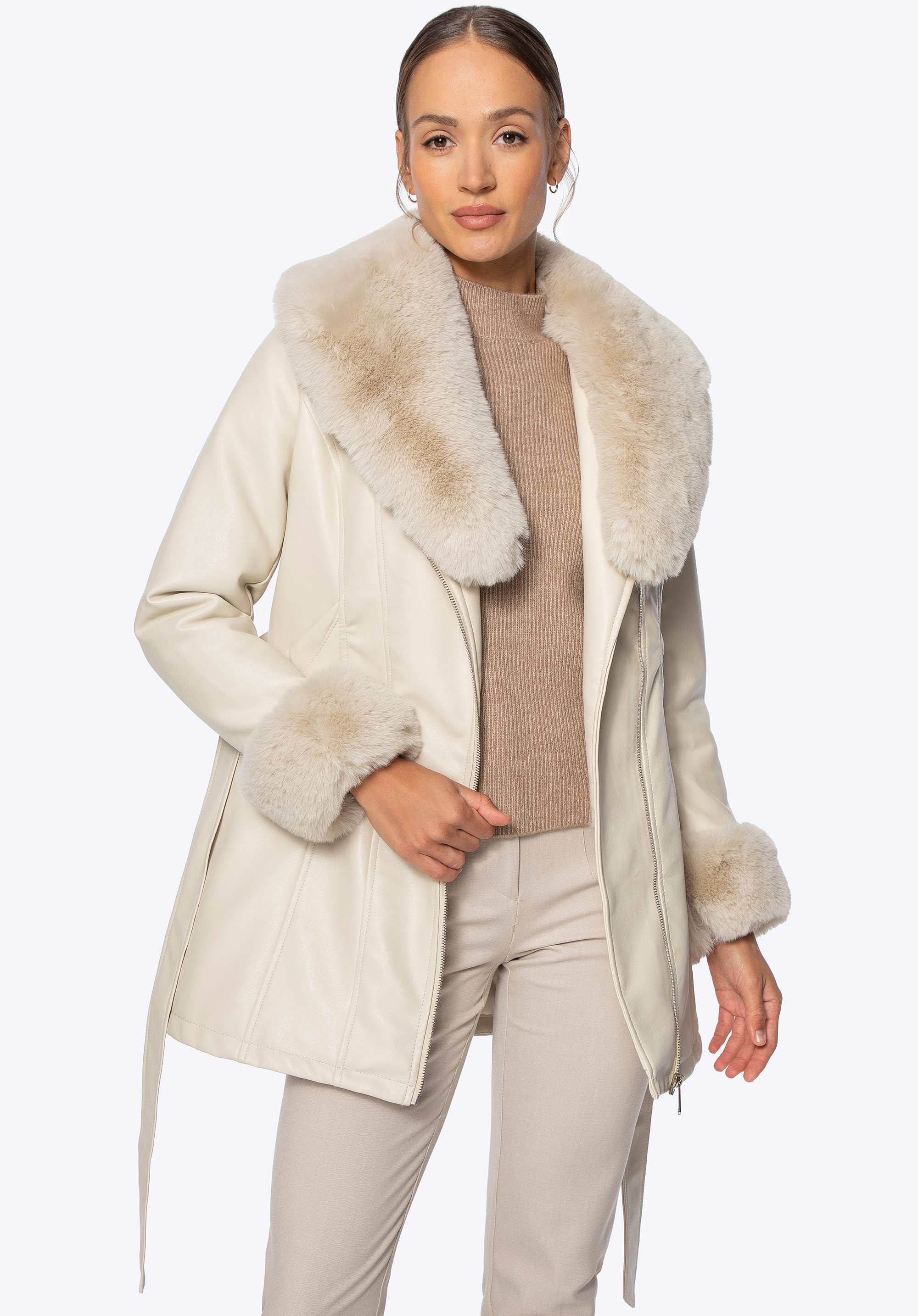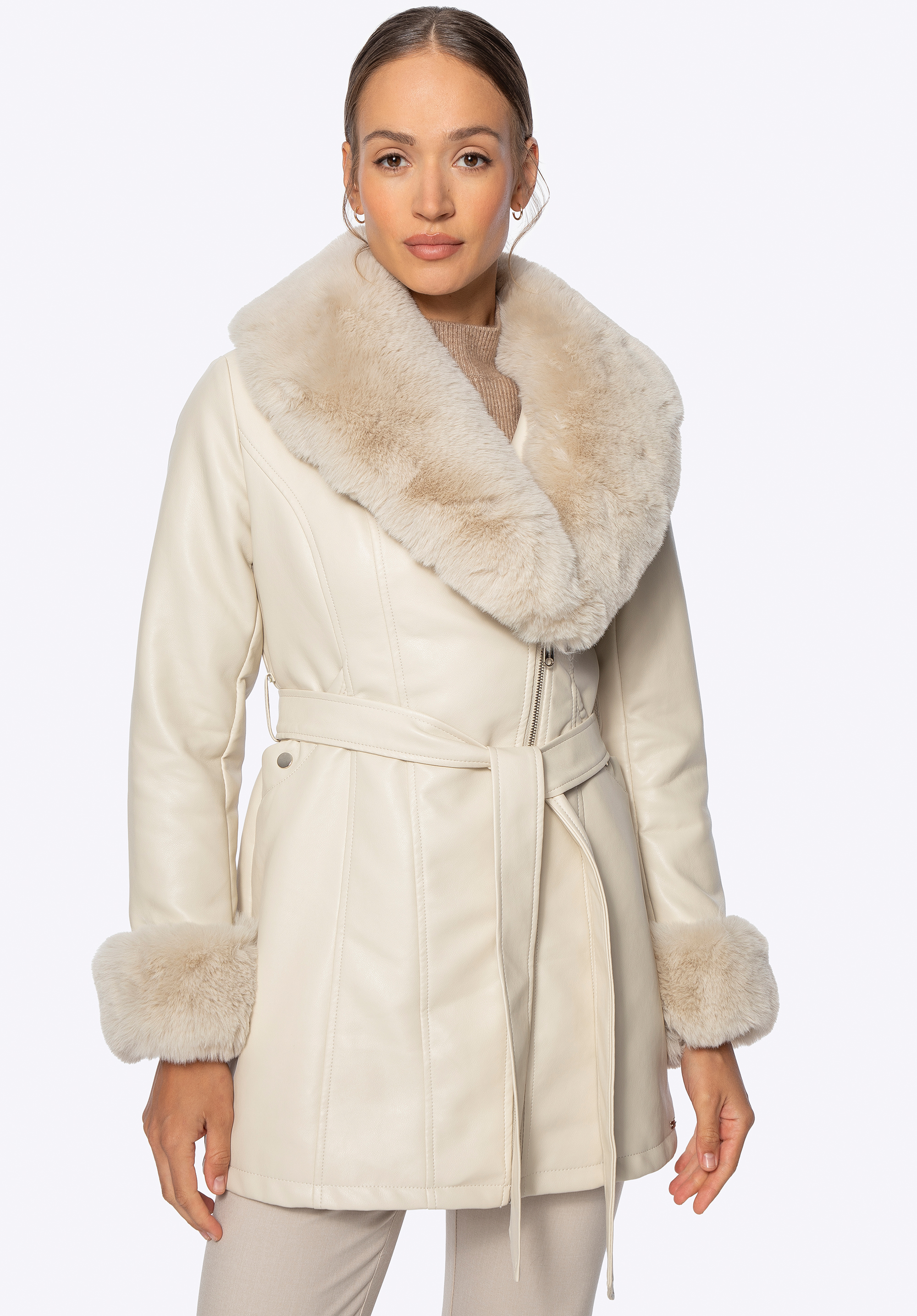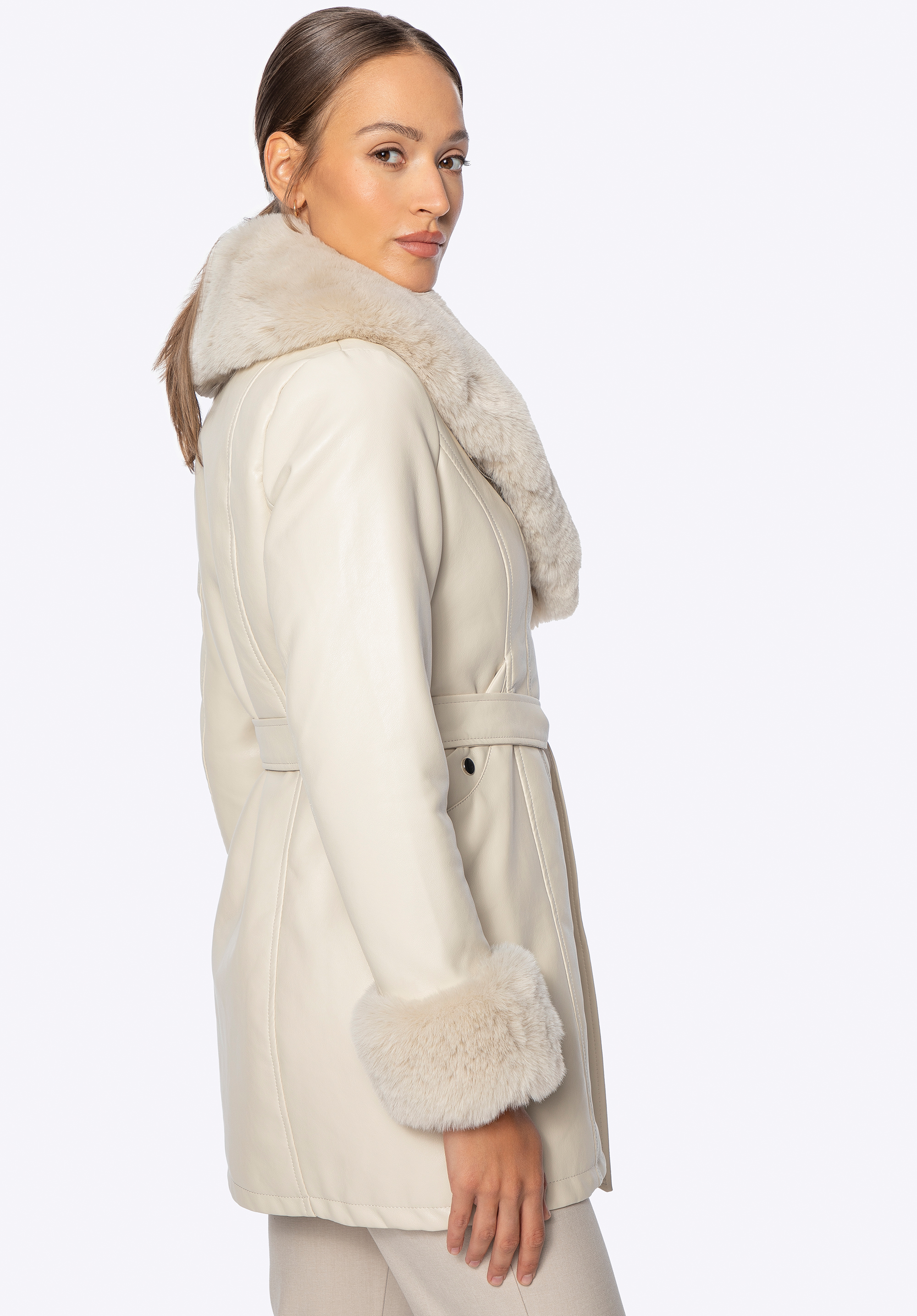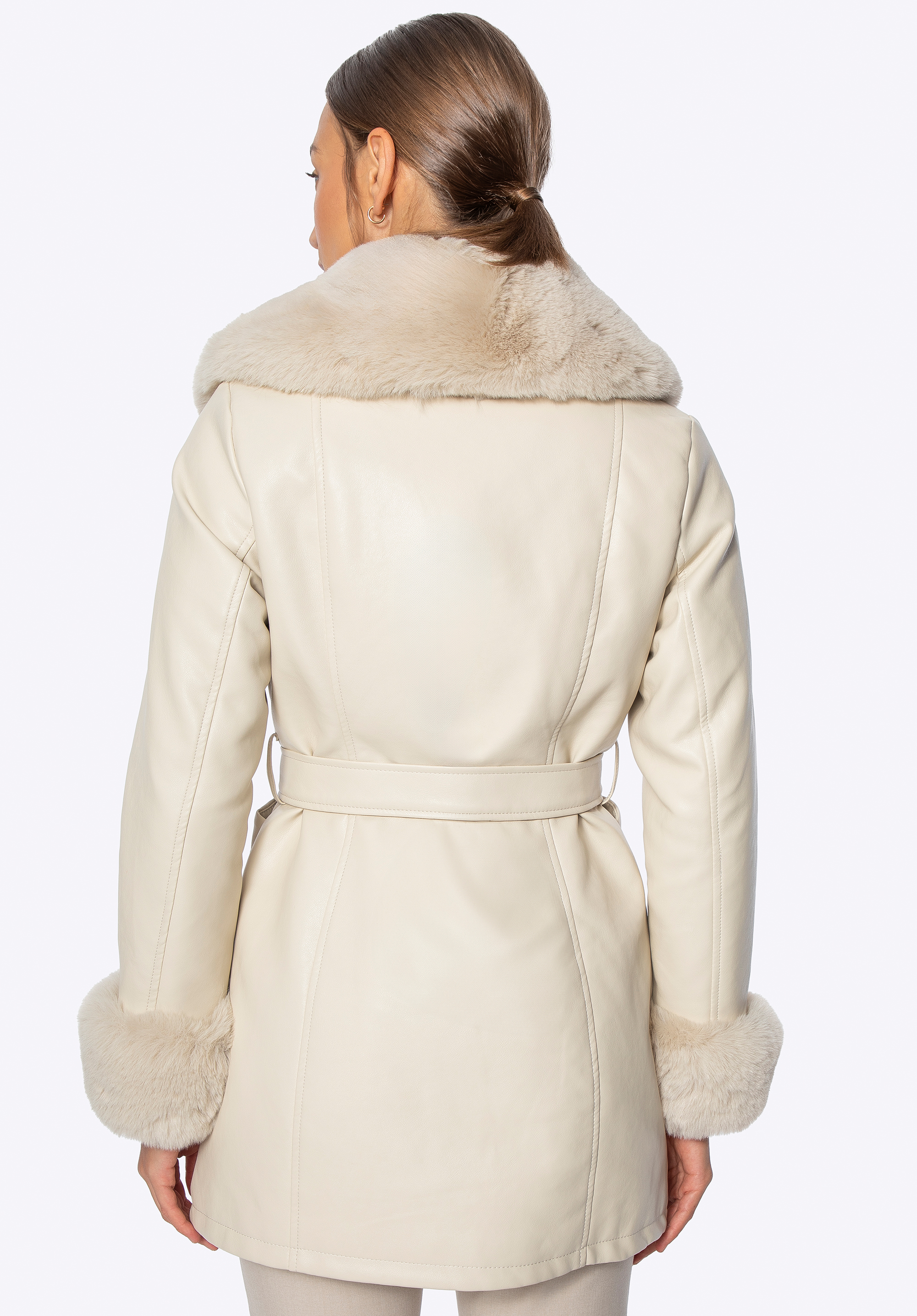 Women’s faux leather coat with faux fur collar and cuffsColour: cream