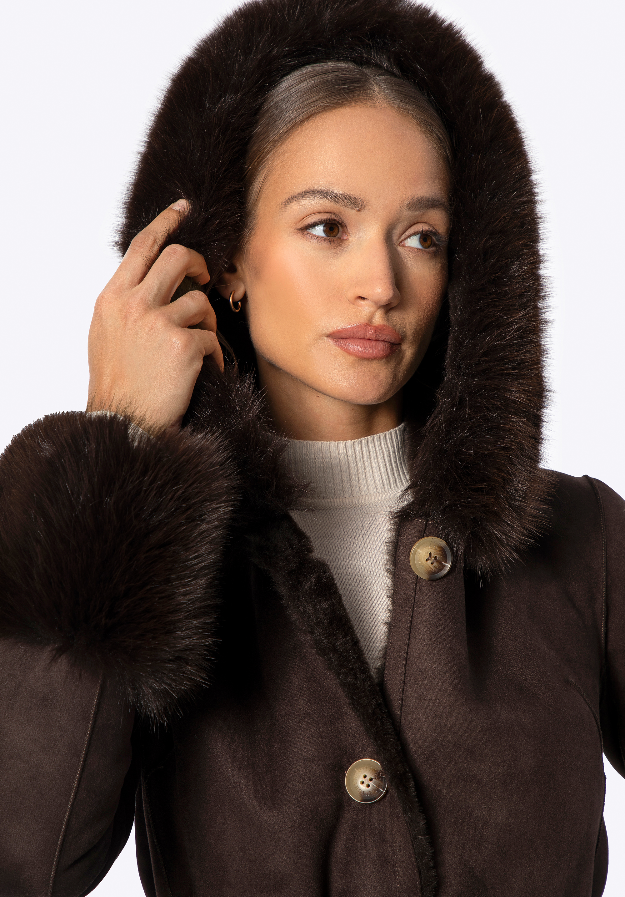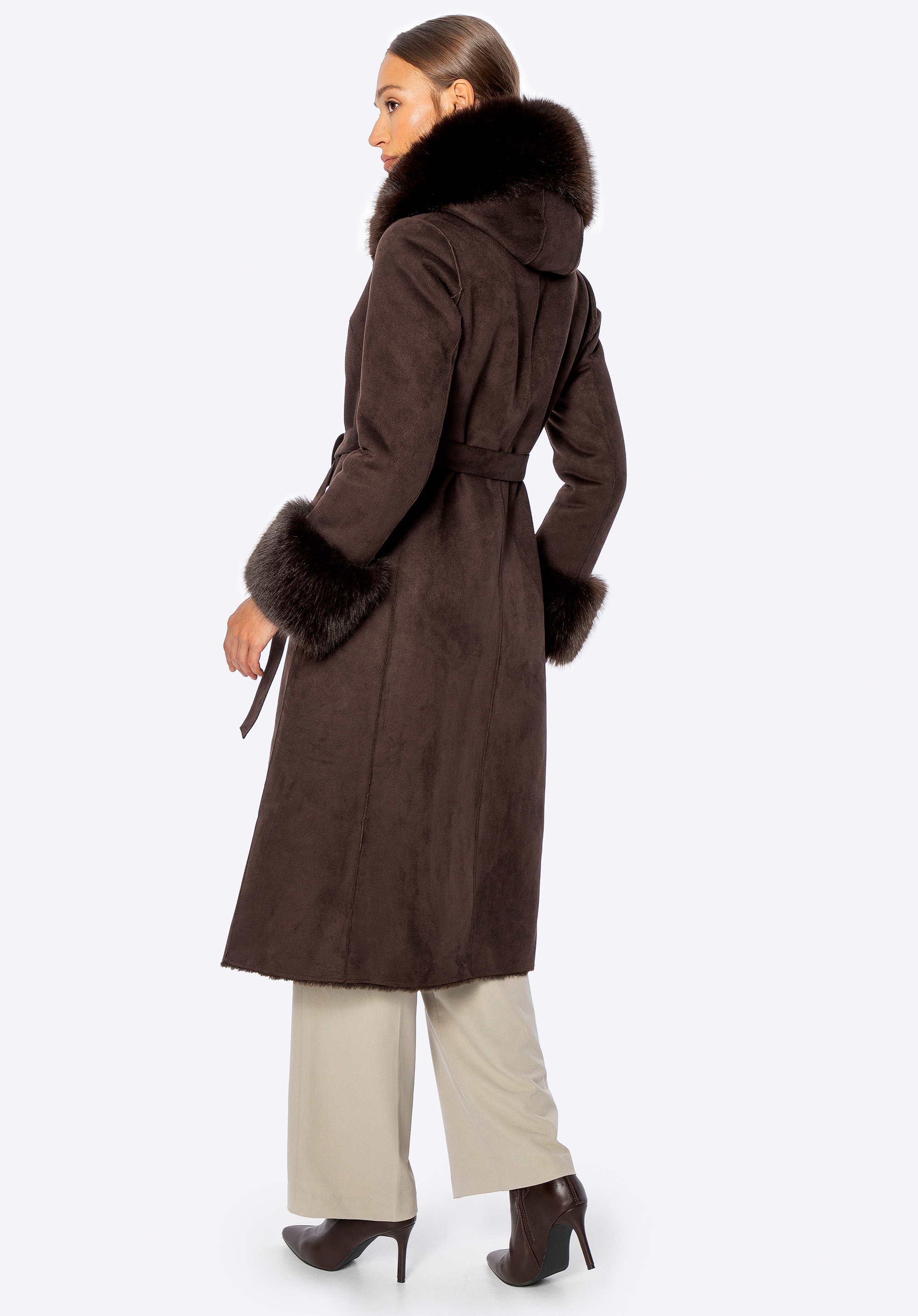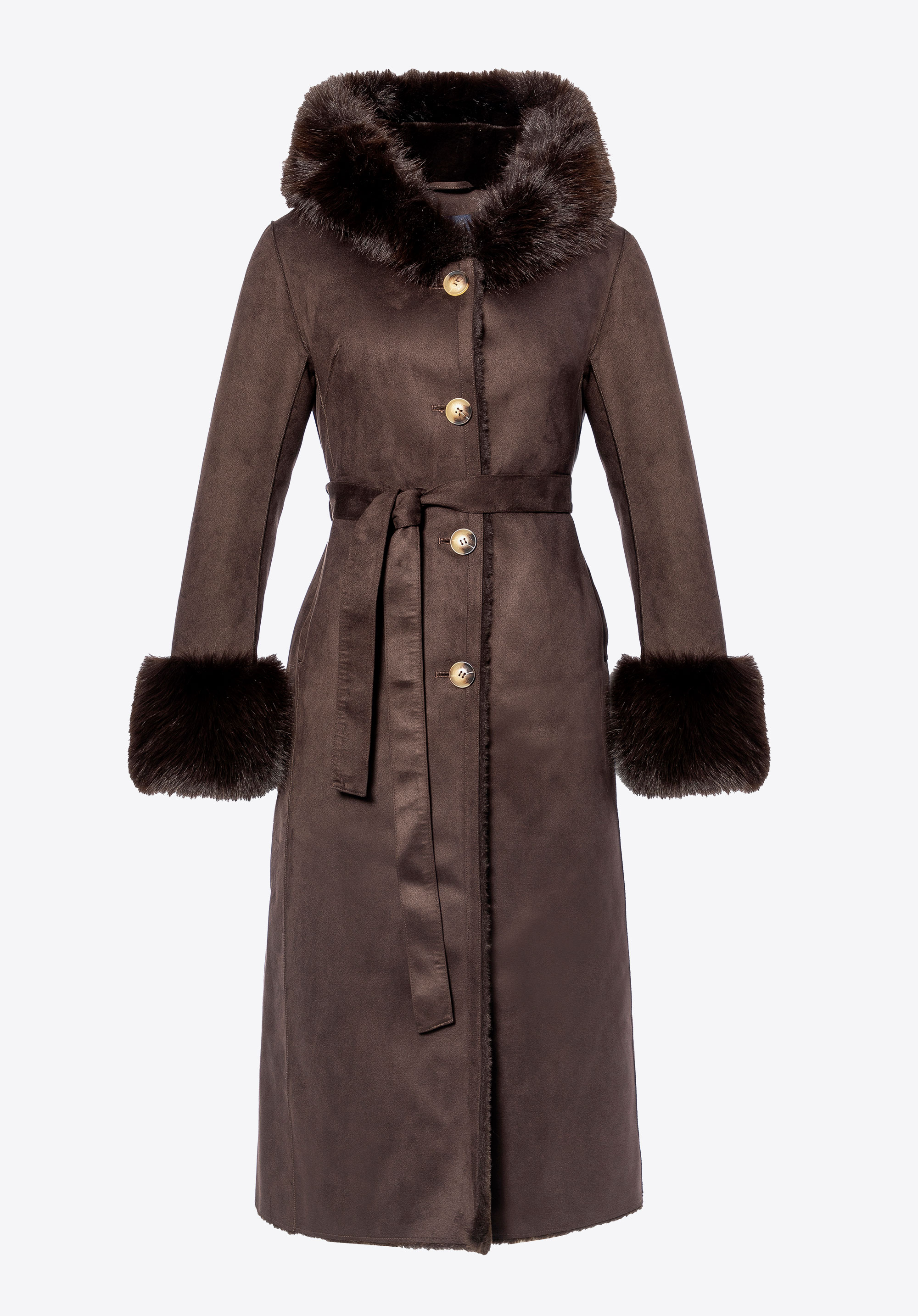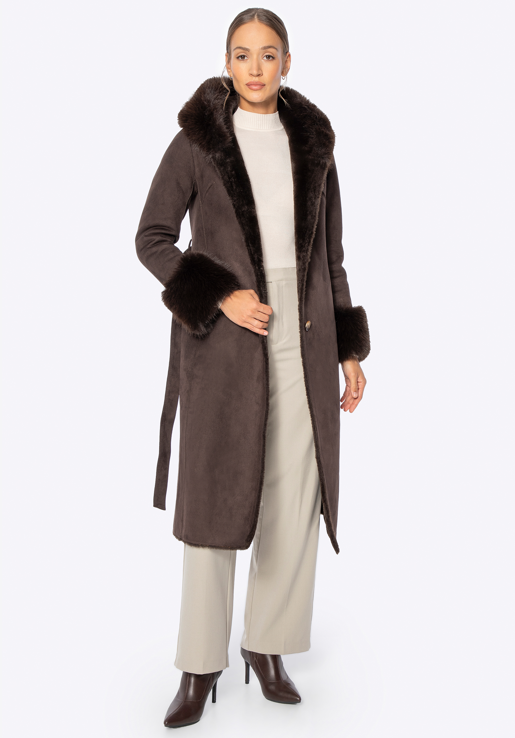 Women’s coat with faux fur collar and cuffsColour: brown