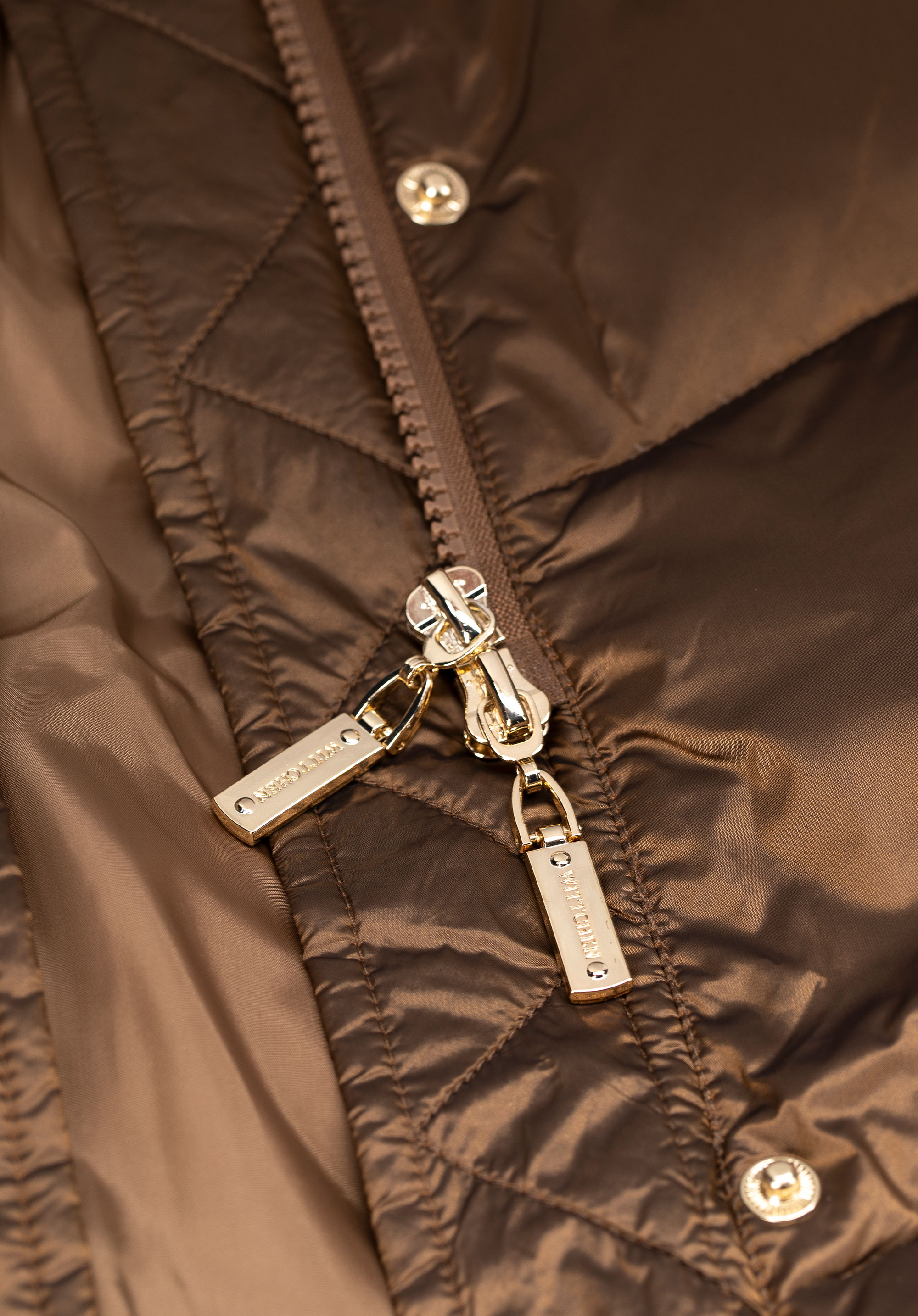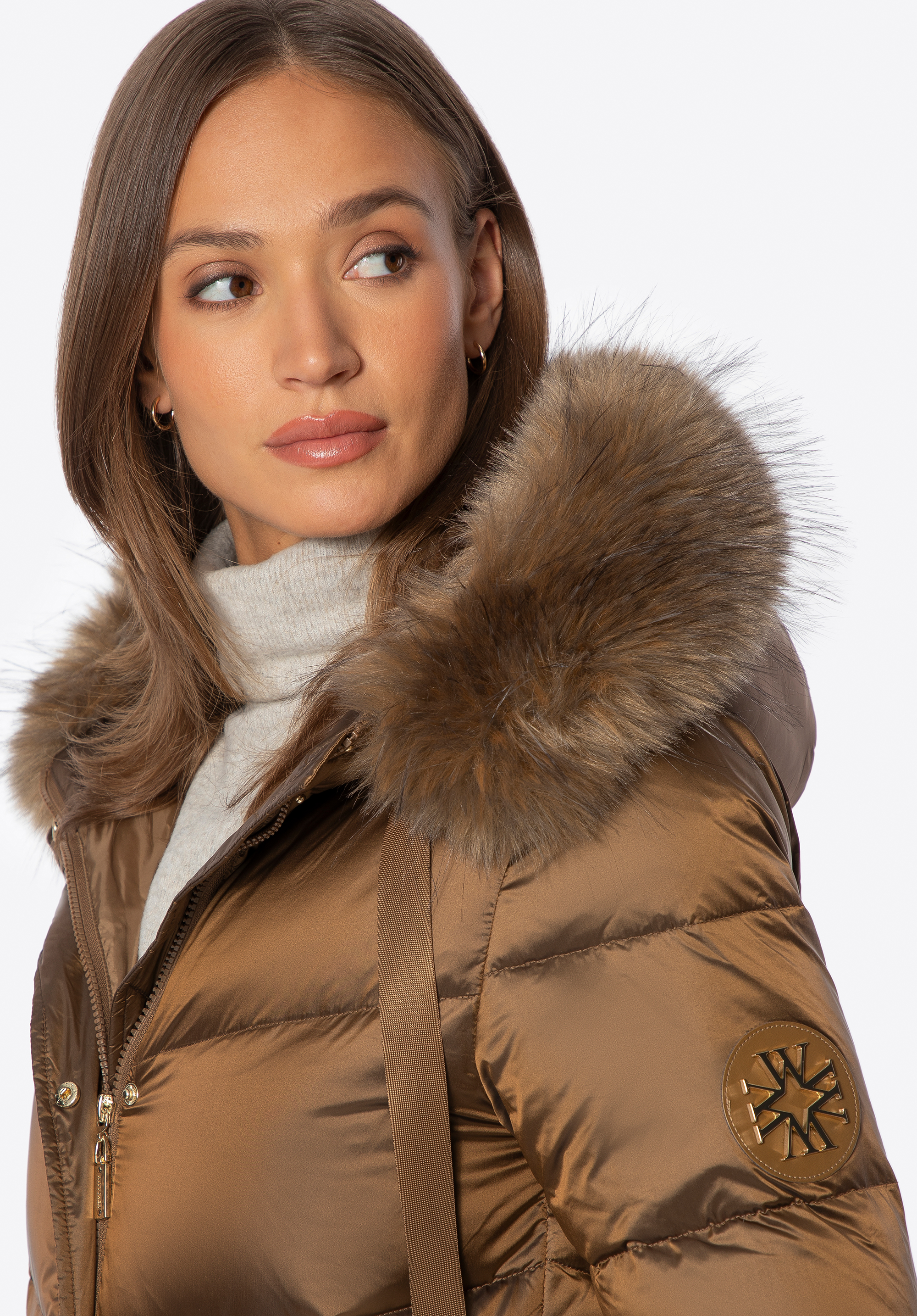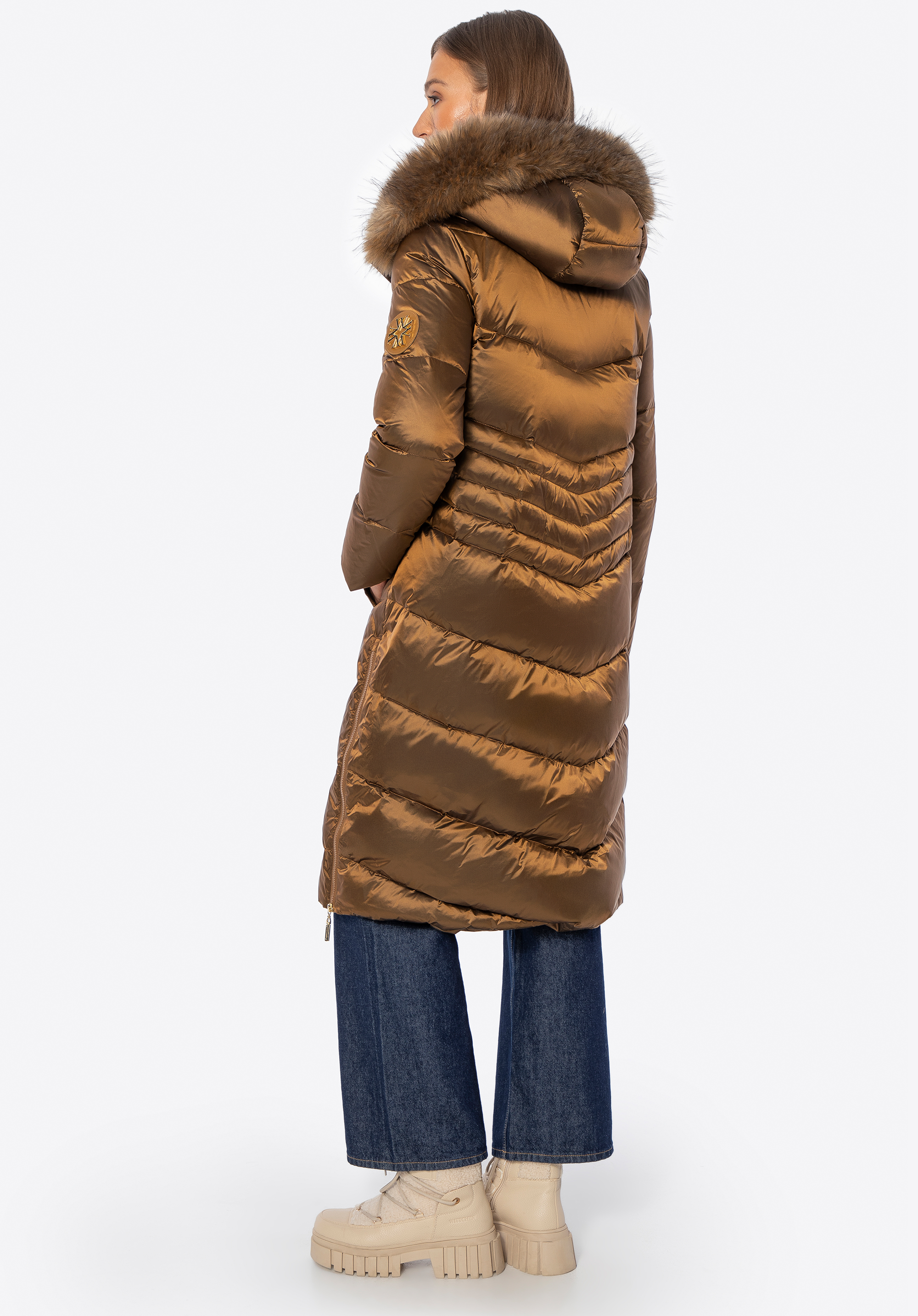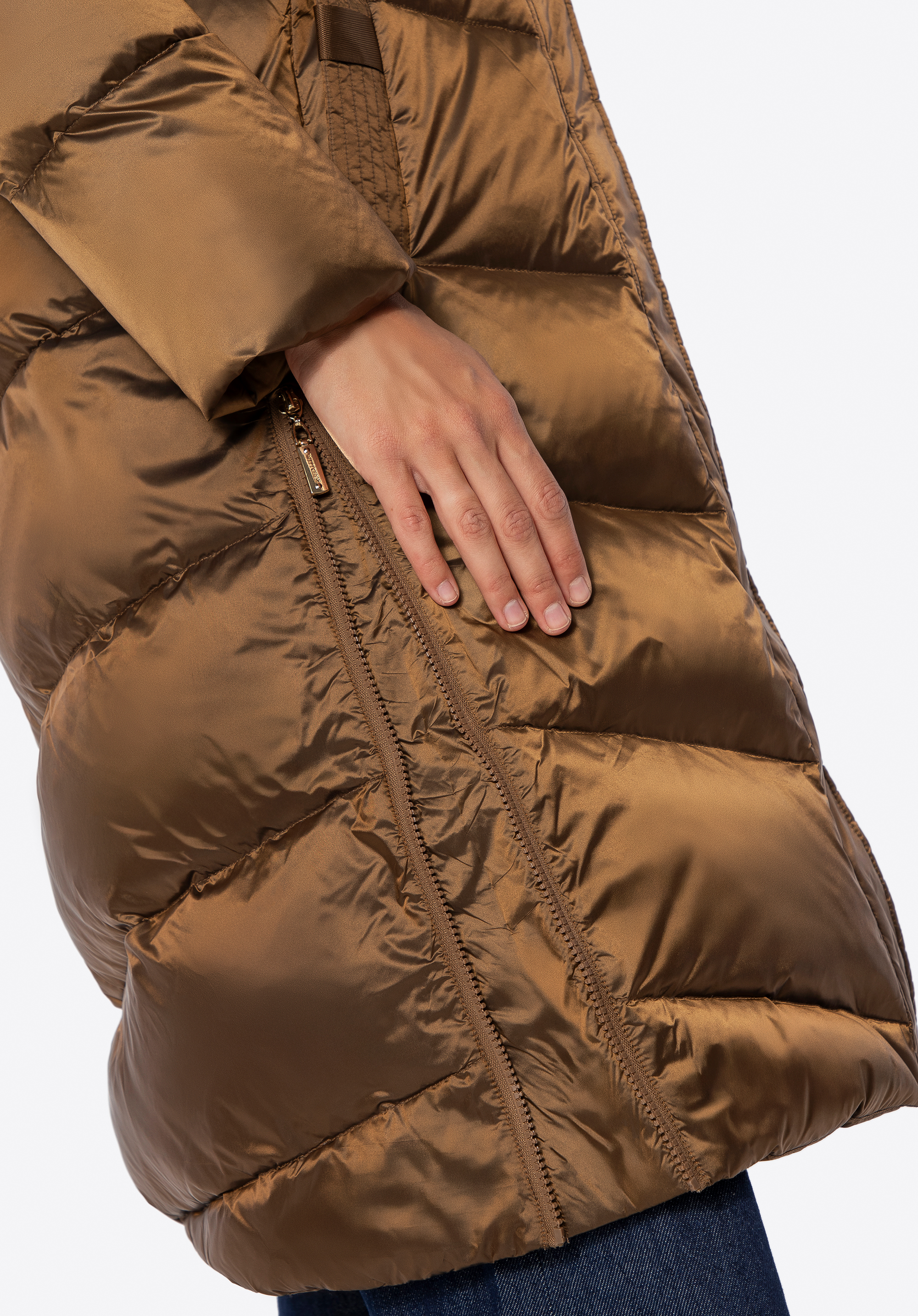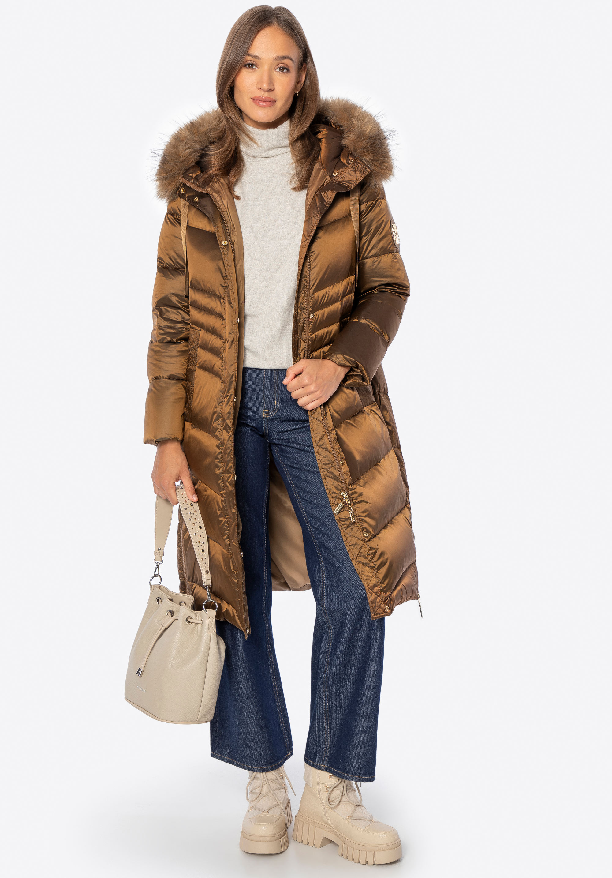 This women’s coat is the essence of elegance and functionality on colder days. Designed for women who refuse to compromise on comfort or style, it offers the perfect blend of natural warmth, weather resistance and timeless design. The outer layer crafted from nylon effectively shields you from the wind, while the natural down and feather filling ensures outstanding thermal insulation. This makes the coat exceptionally comfortable – perfect for both everyday wear and more refined outfits.