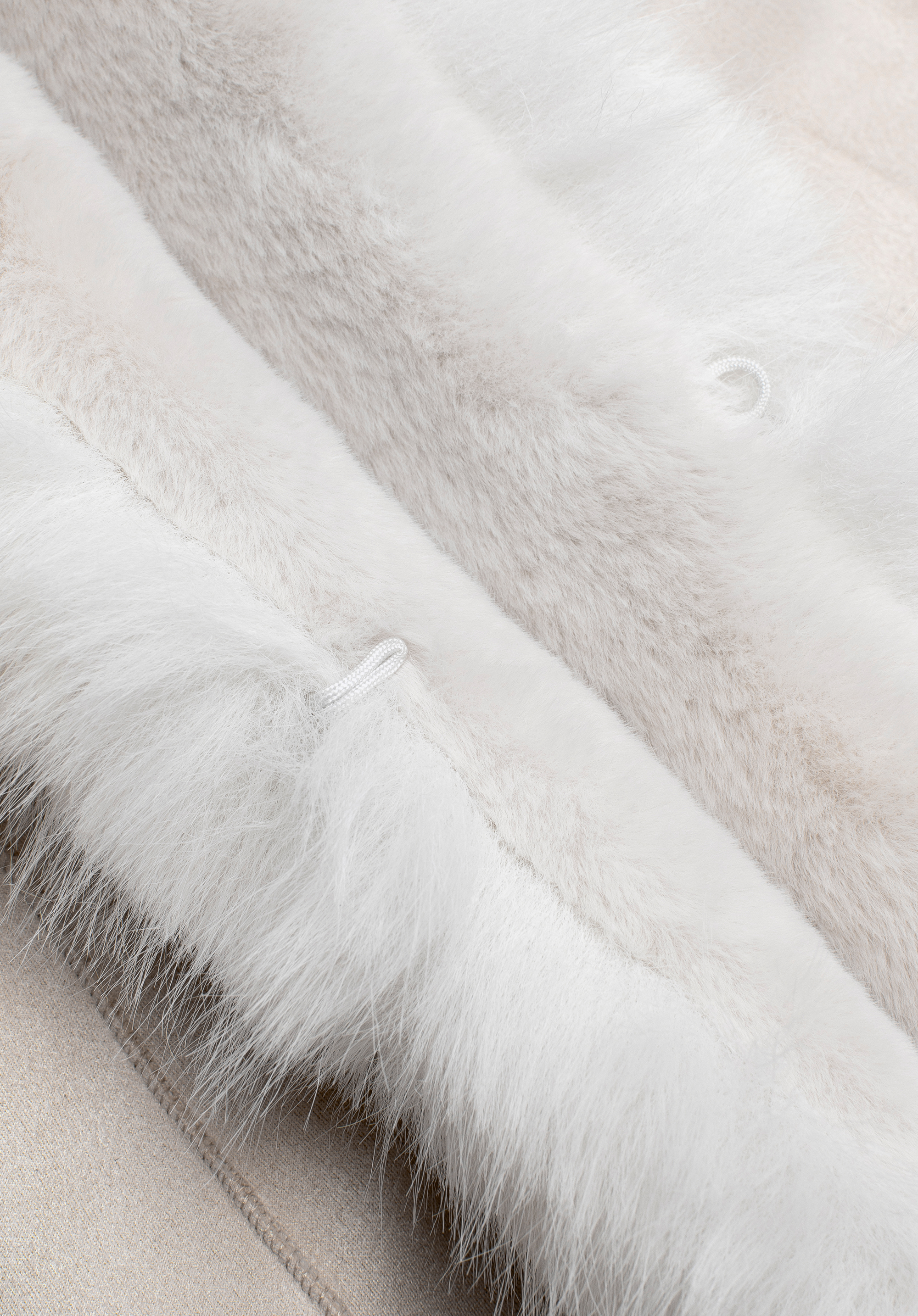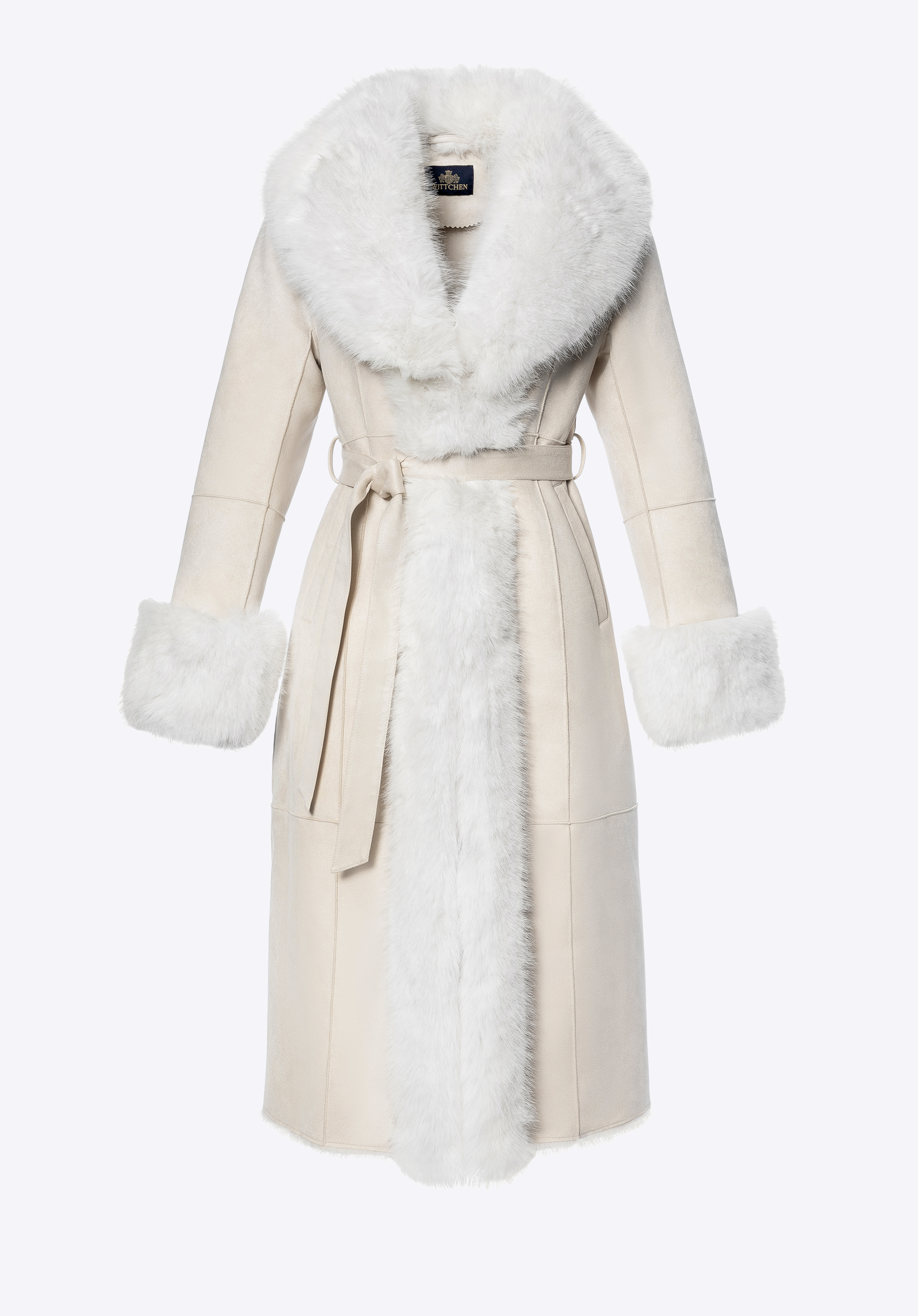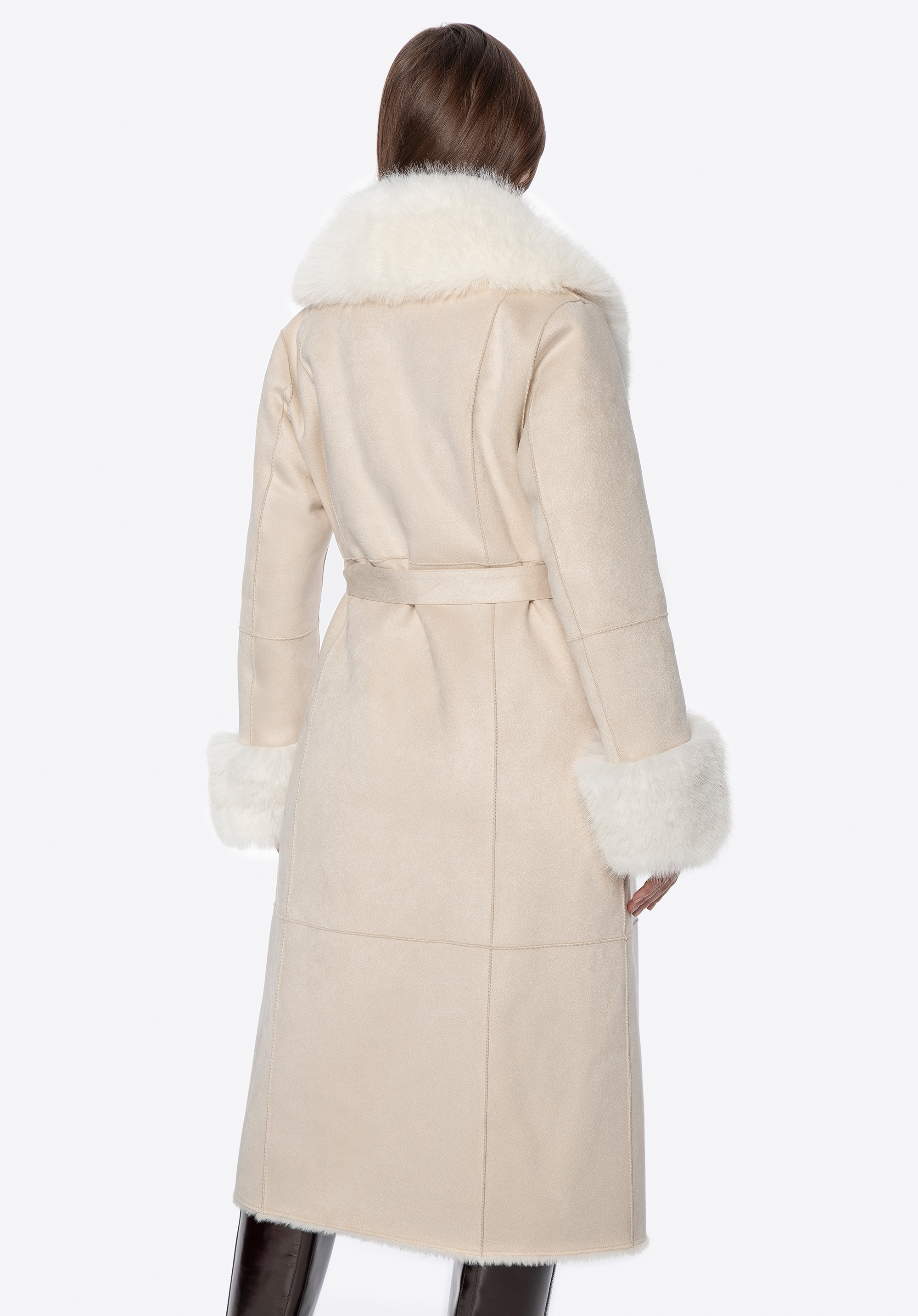 This long coat is the perfect blend of feminine elegance and winter practicality. Made from a soft yet wind-resistant fabric, it offers reliable protection against cold weather. The look is completed with an elegant faux fur trim that runs along the front, collar, and cuffs, adding a touch of softness and refinement to the silhouette. Designed for everyday comfort, it features two side pockets – ideal for warming your hands or storing essentials.