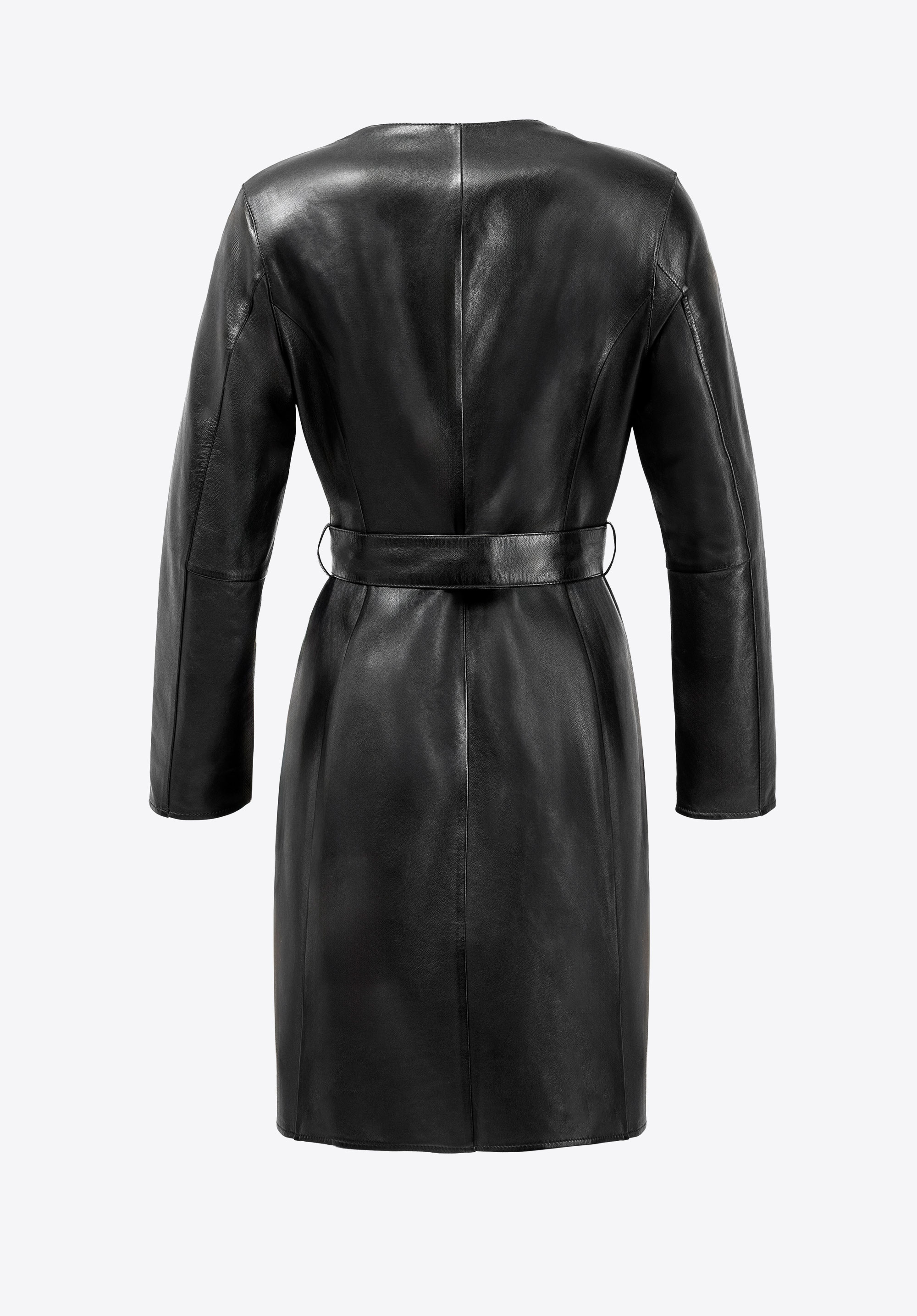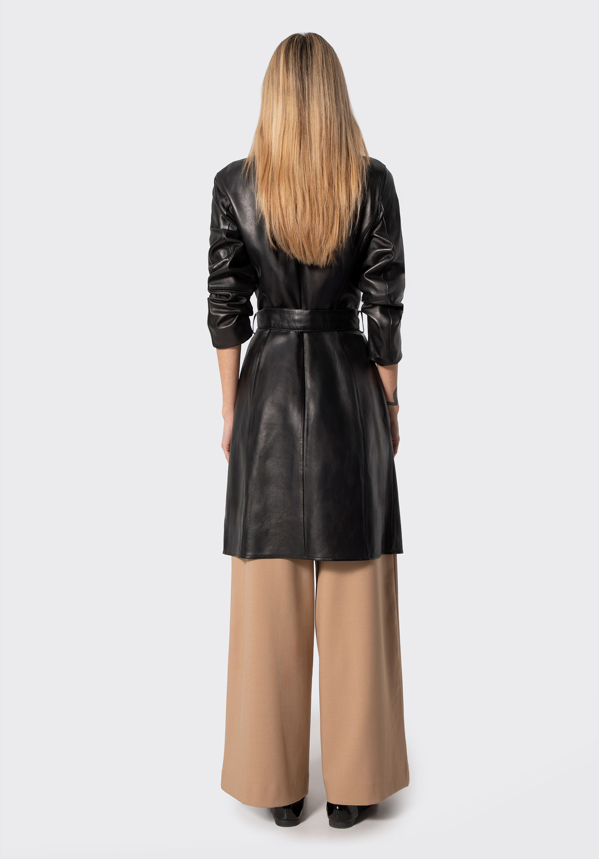 This coat embodies timeless elegance with a contemporary edge. Made from natural sheepskin leather, it's beautifully soft with a subtle sheen that enhances its luxurious quality. The clean, elongated silhouette combined with a tie belt allows you to define the waist and create balanced proportions. This style blends minimalism with refined femininity.