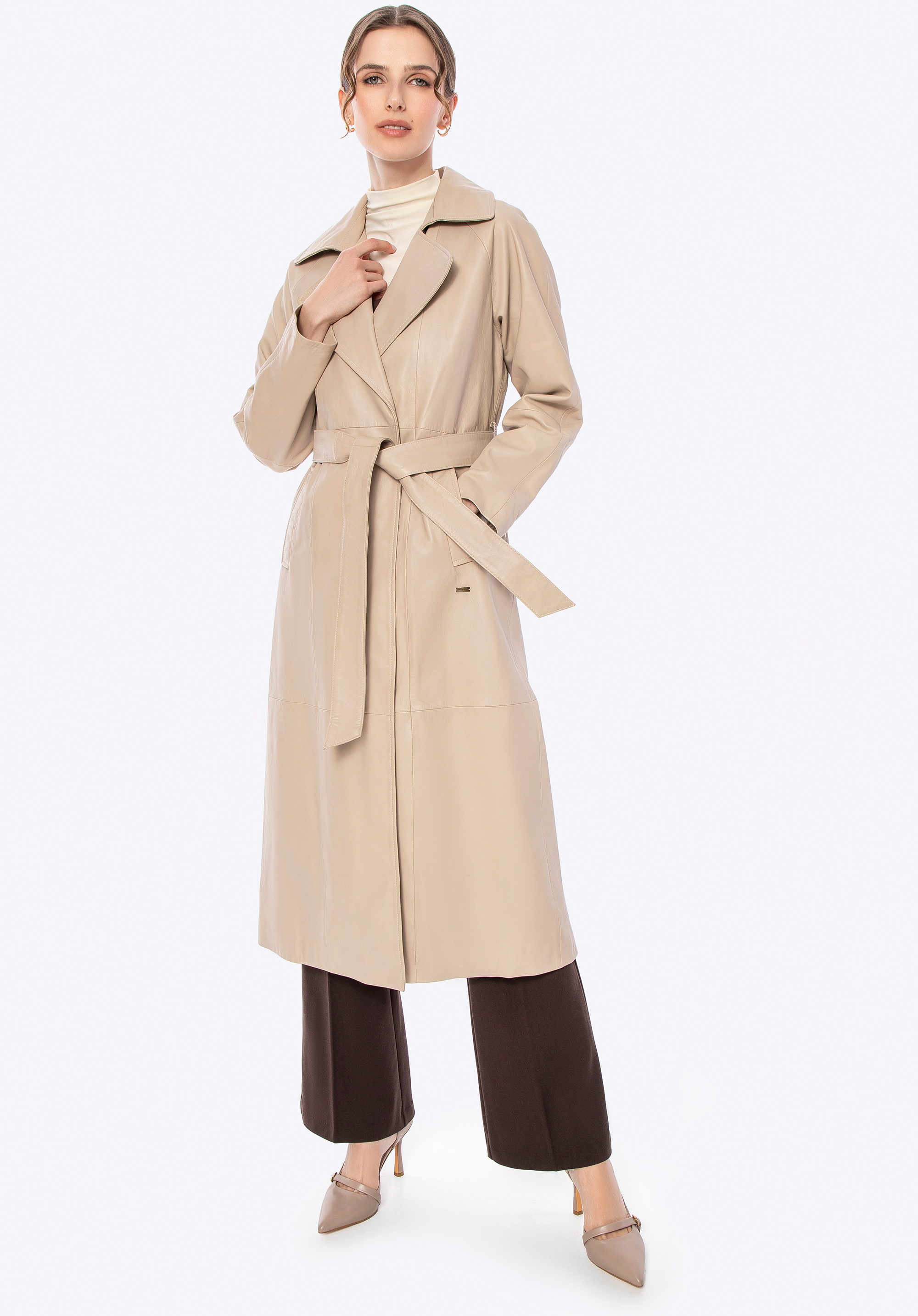 This coat made from natural sheepskin leather is the essence of classic style with a modern twist. Its timeless cut subtly enhances the silhouette, while the belt ensures a perfect fit. A classic collar, discreet metal logo, and vertical pockets blend seamlessly into the minimalist design, creating a coat that exudes elegance and refinement.