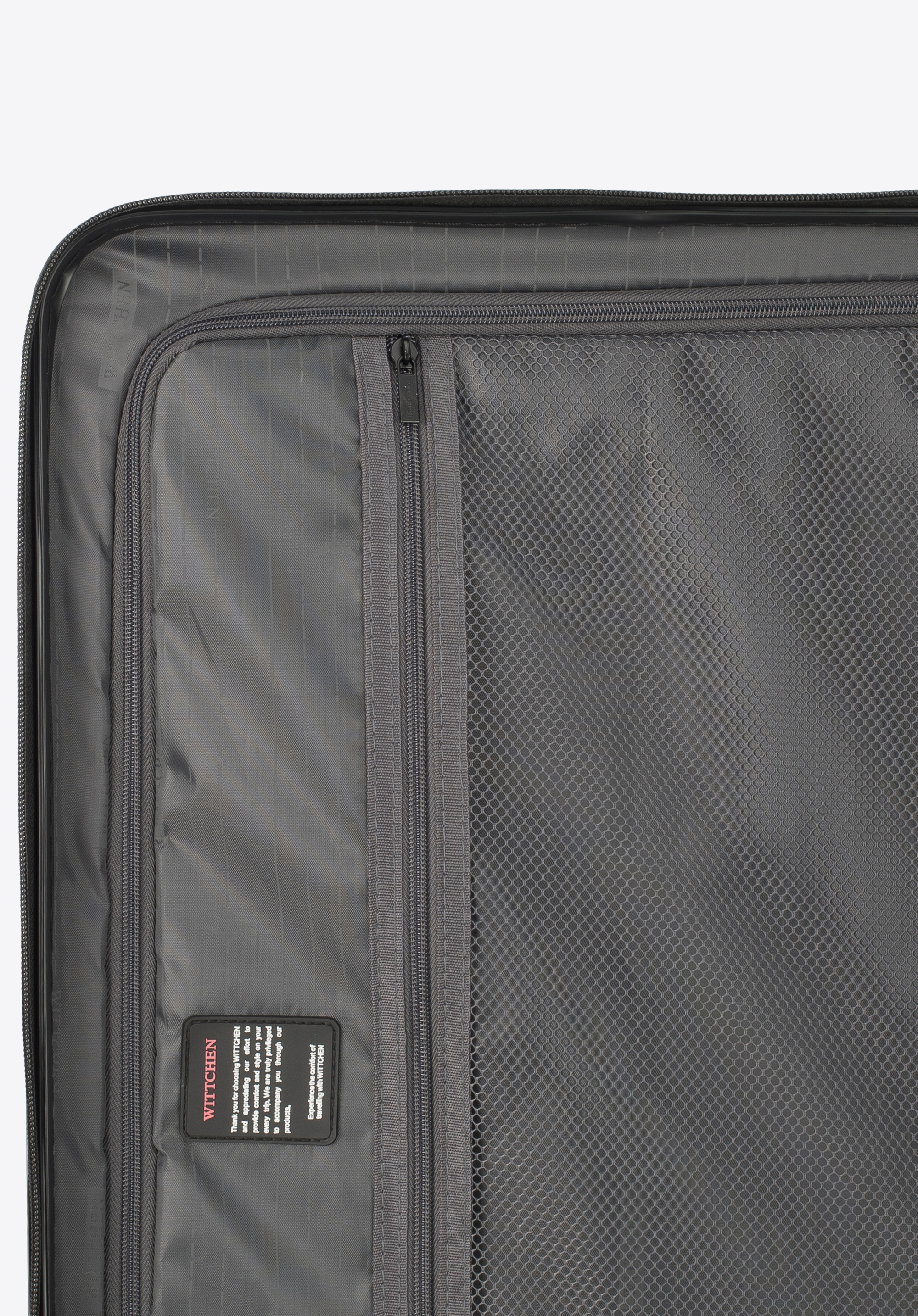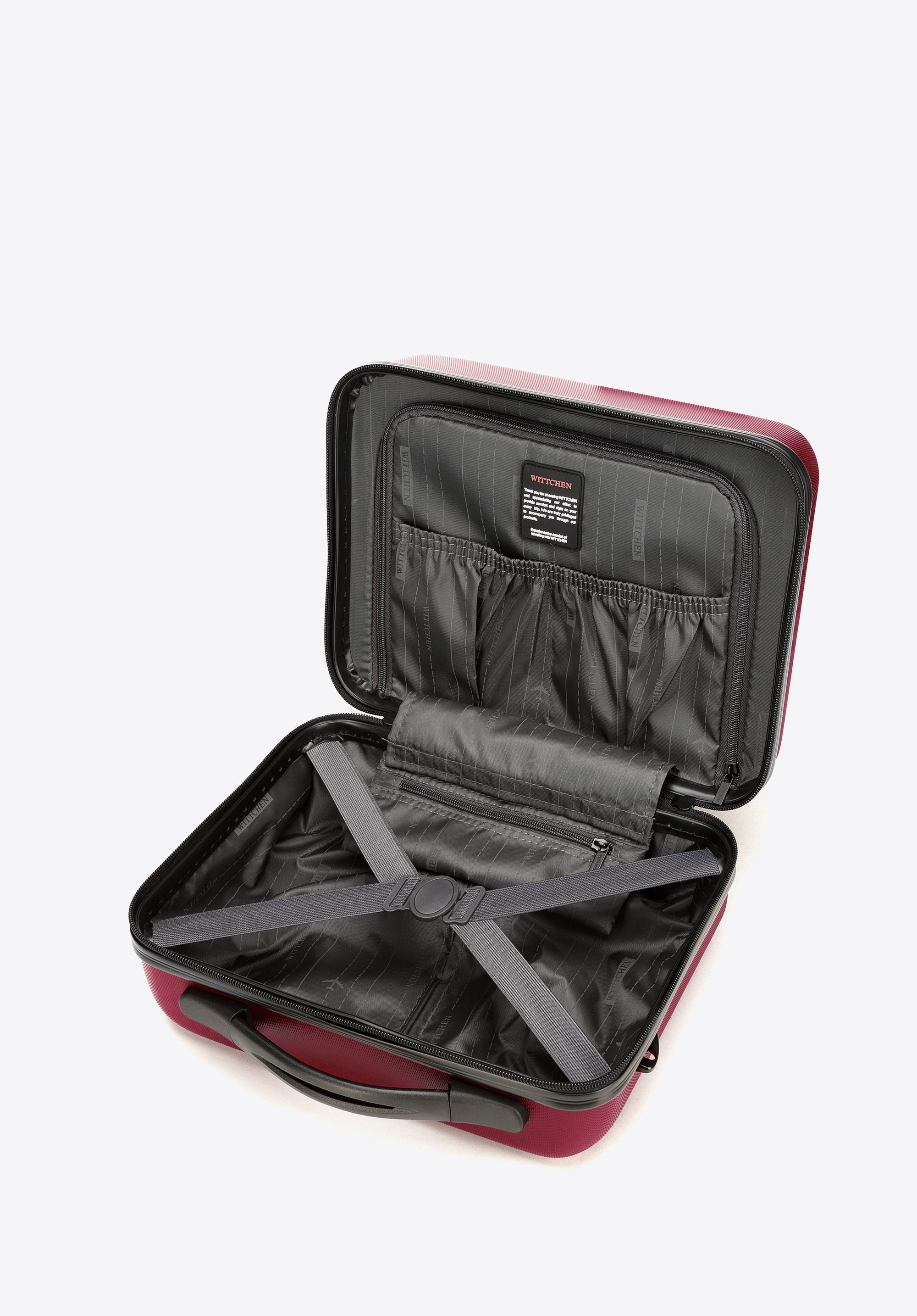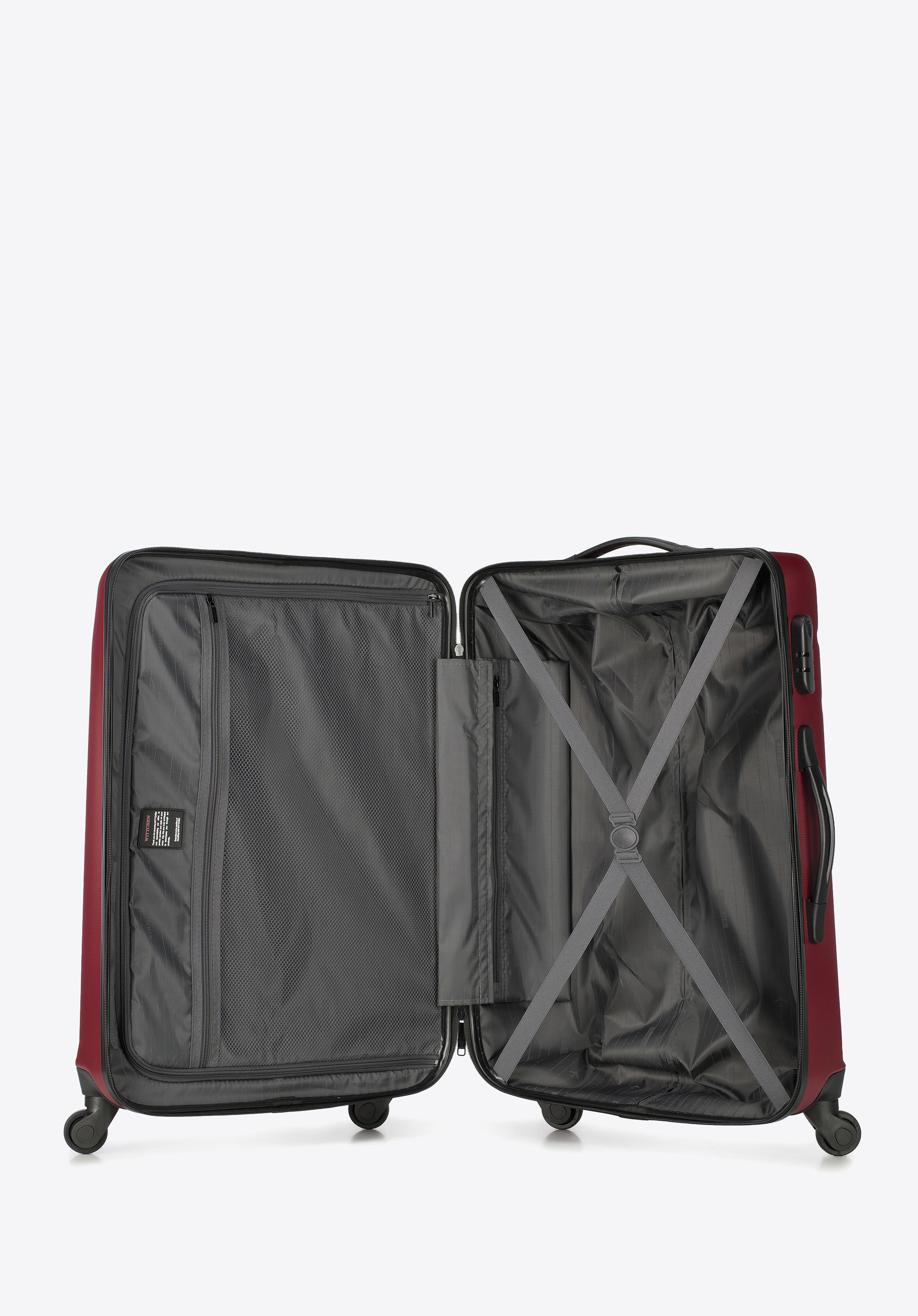 - Suitcase interior: Two compartments – one with adjustable straps to secure clothing, and the other with a zipped divider; includes a mesh pocket and a small zipped pocket for accessories.