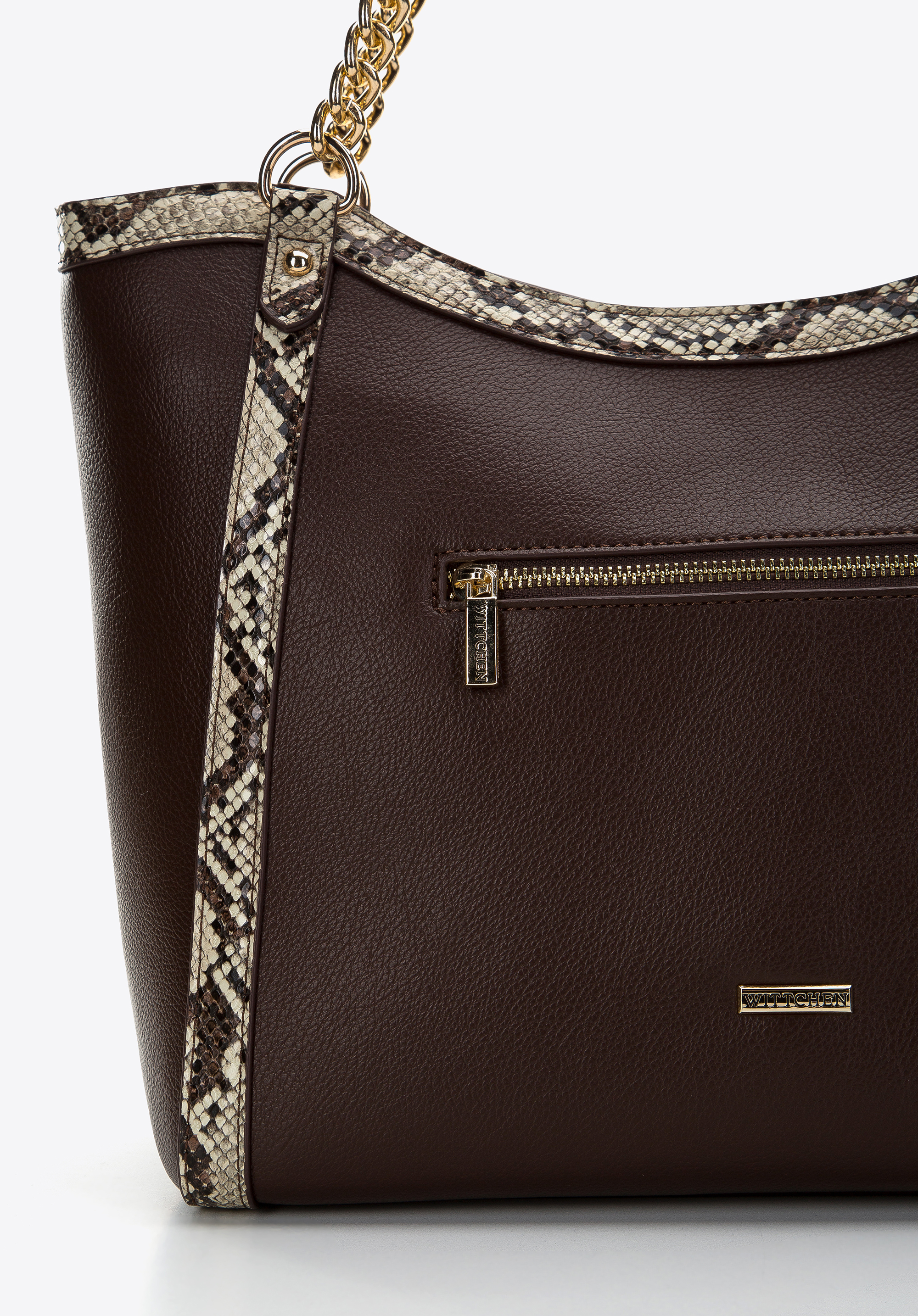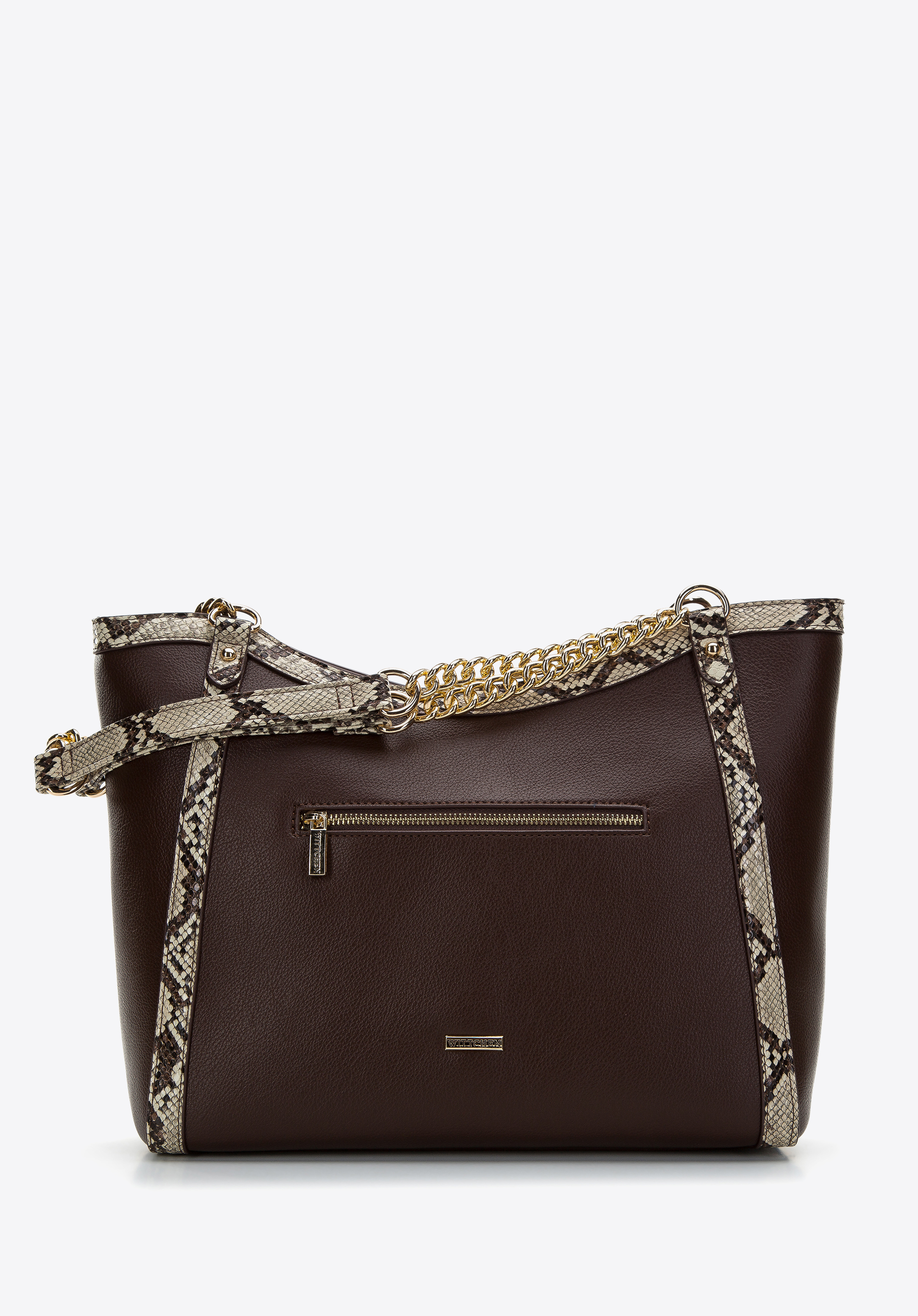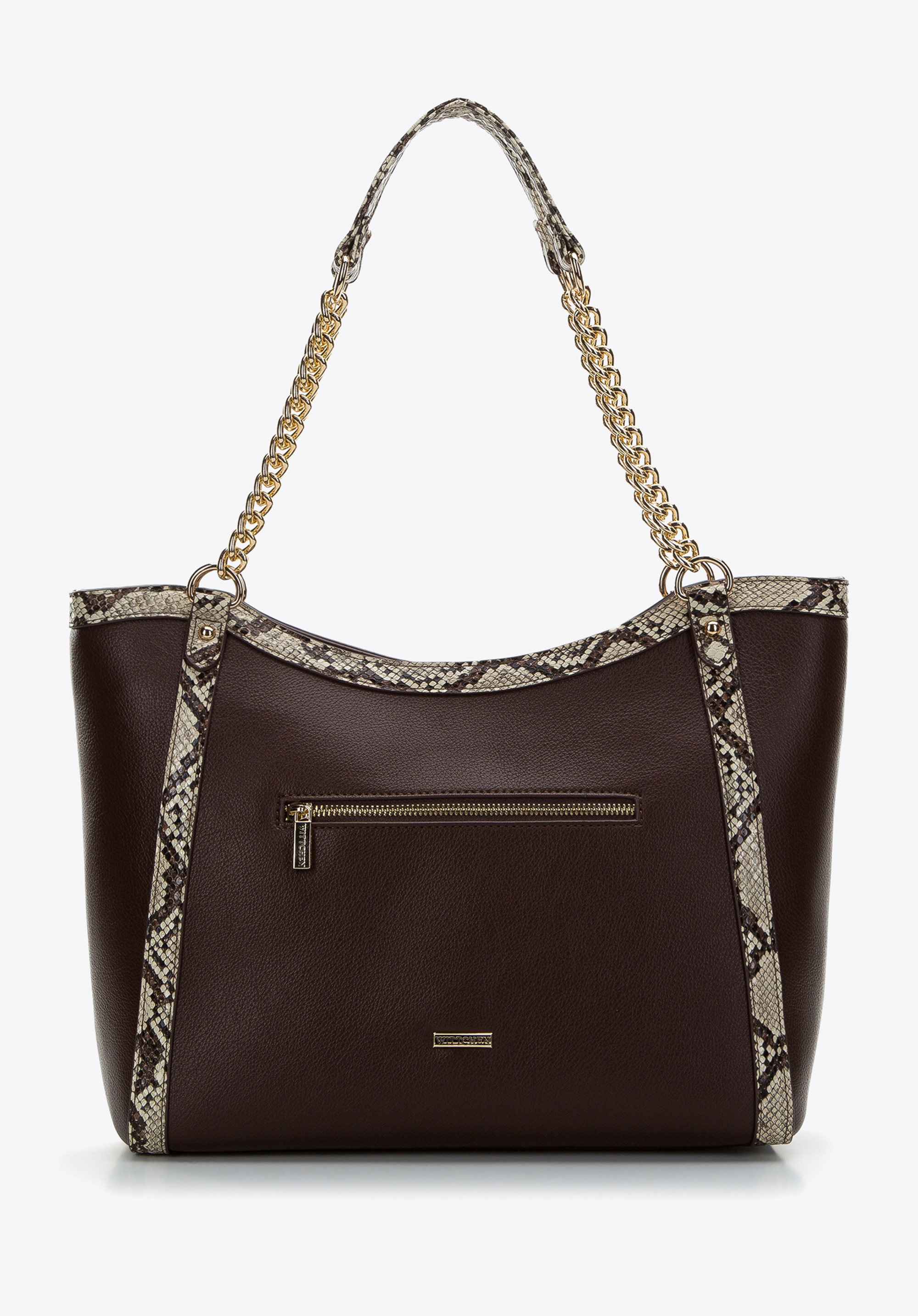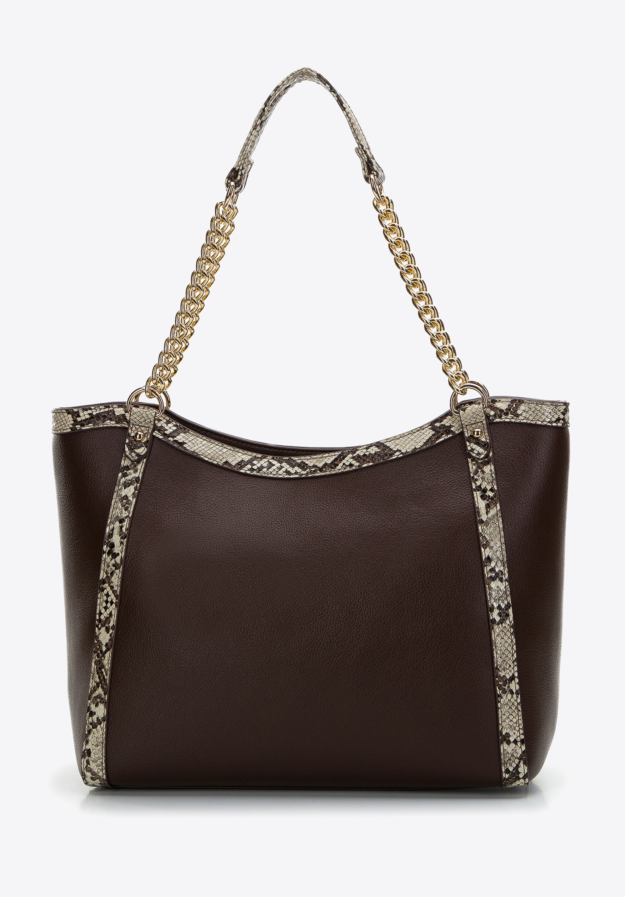 This handbag is the perfect accessory for all women who appreciate bold animal-textured accessories. Made entirely of faux leather with lizard-textured trim, it boasts chic style. Featuring gold-tone chain and faux leather shoulder straps a rigid bottom, this handbag opens up to a spacious interior which can easily hold a wallet, phone, thermal mug, cosmetic case and other bits and bobs. Perfect for teaming with a little black dress or with jeans and a shirt. This feminine shopper bag is perfect for office as well as when you go out in the evening.