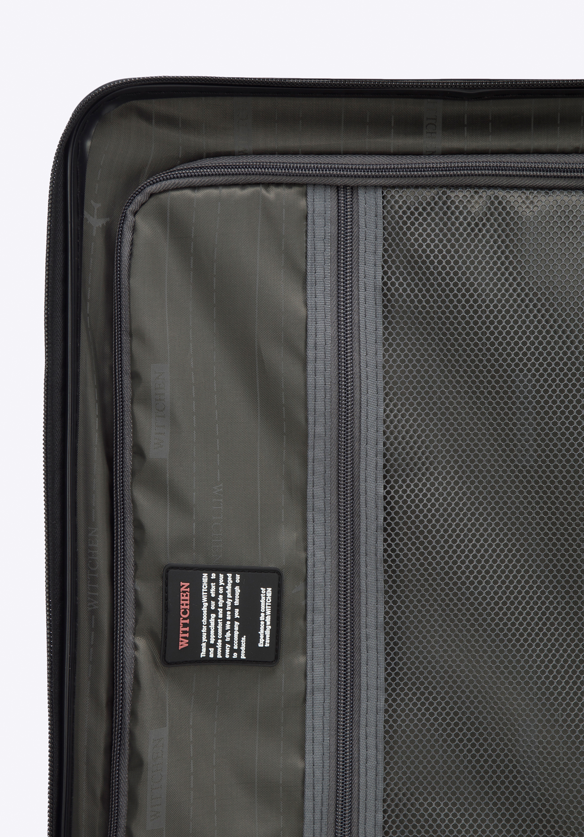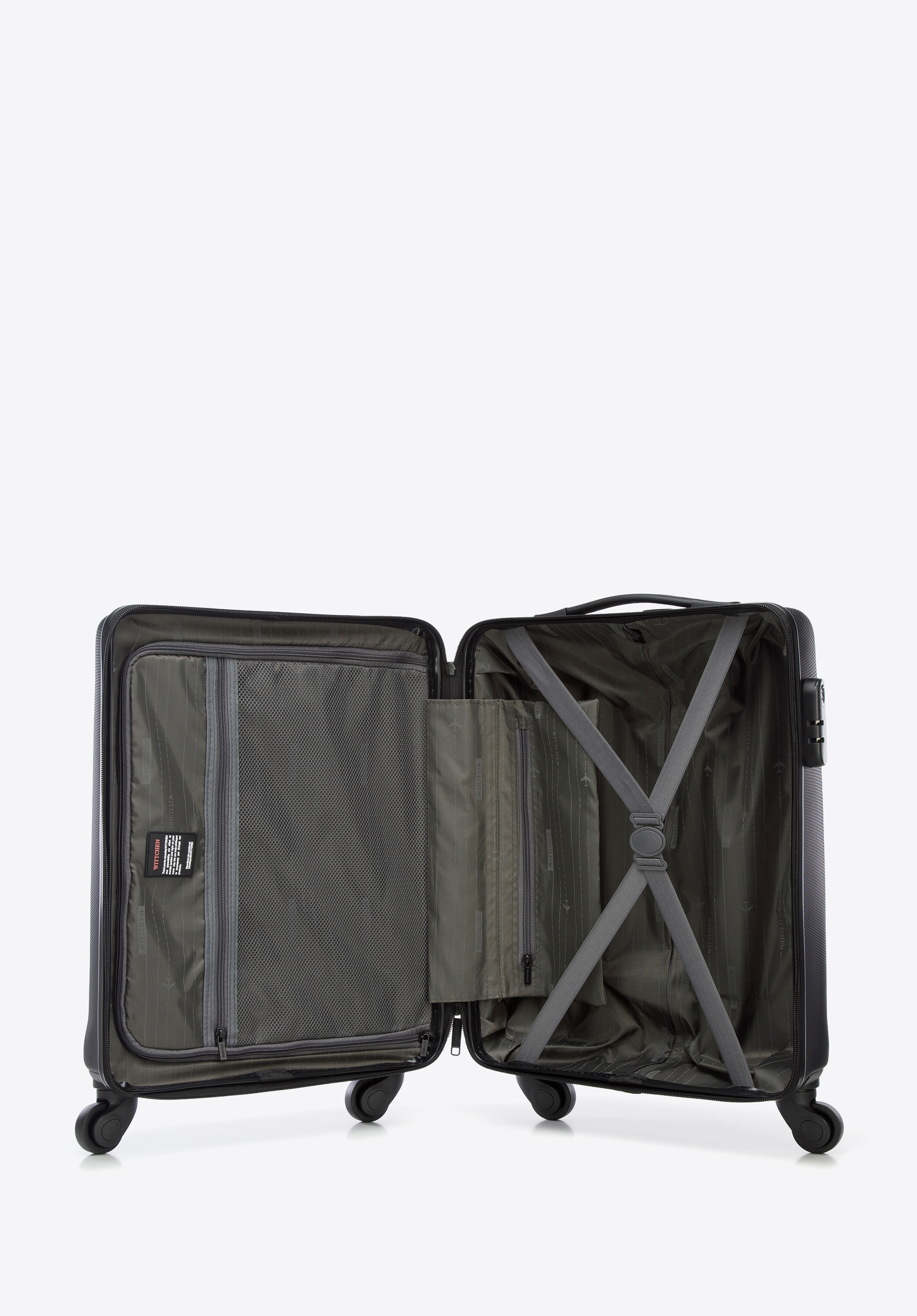- Suitcase interior: Two compartments – one with elastic cross straps and the other with a zip closure; additional pockets (one mesh and one zipped) help with storage.