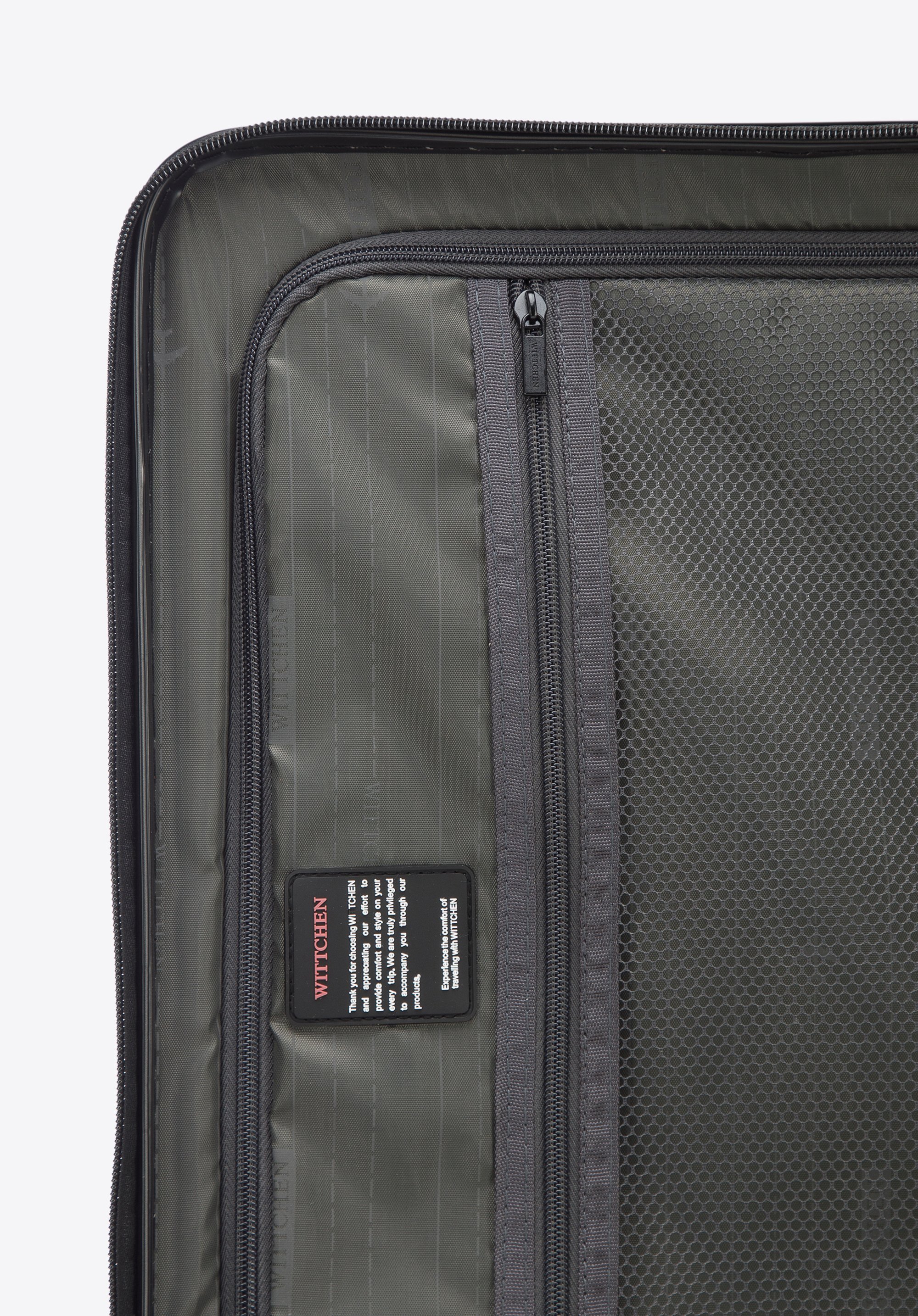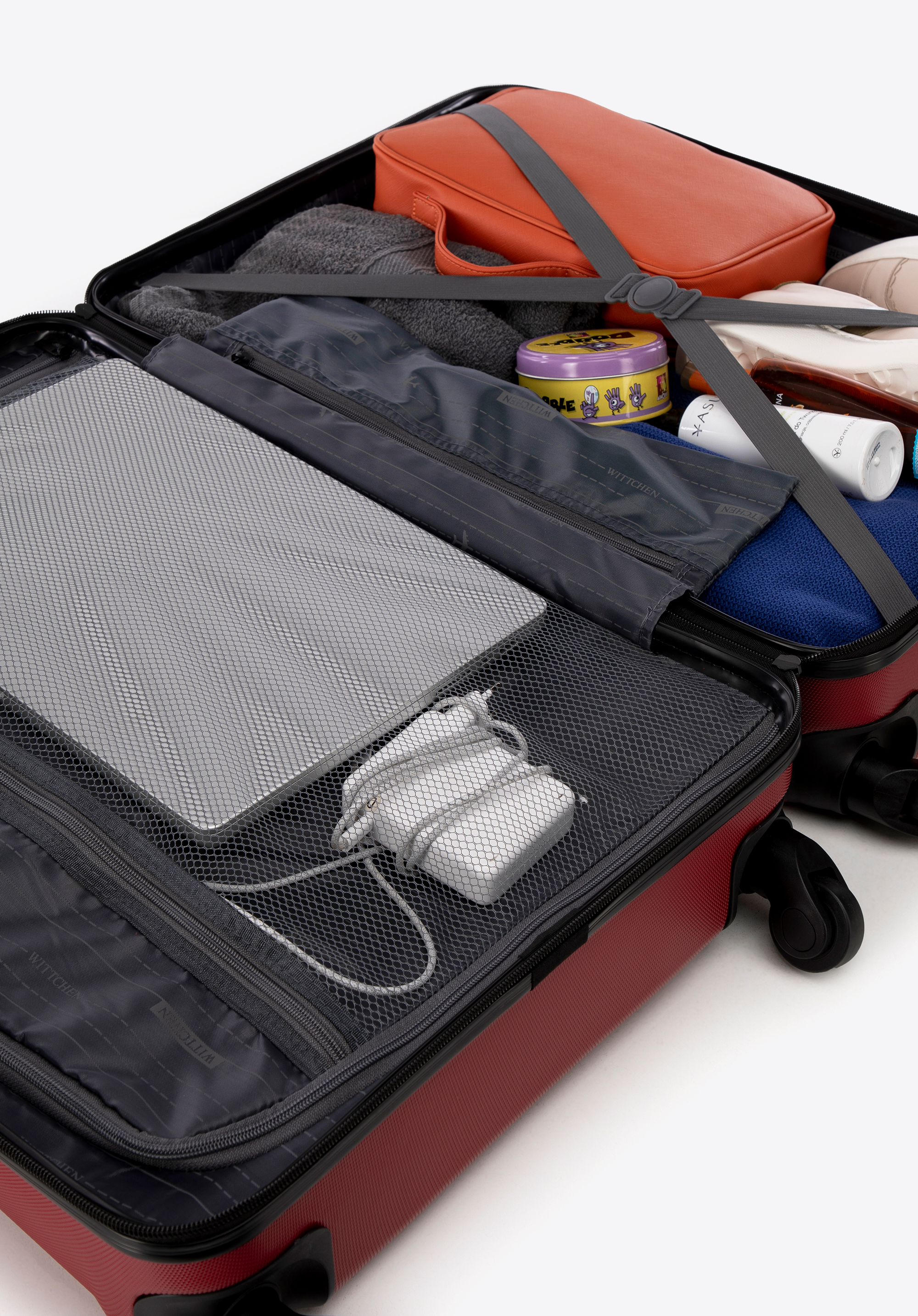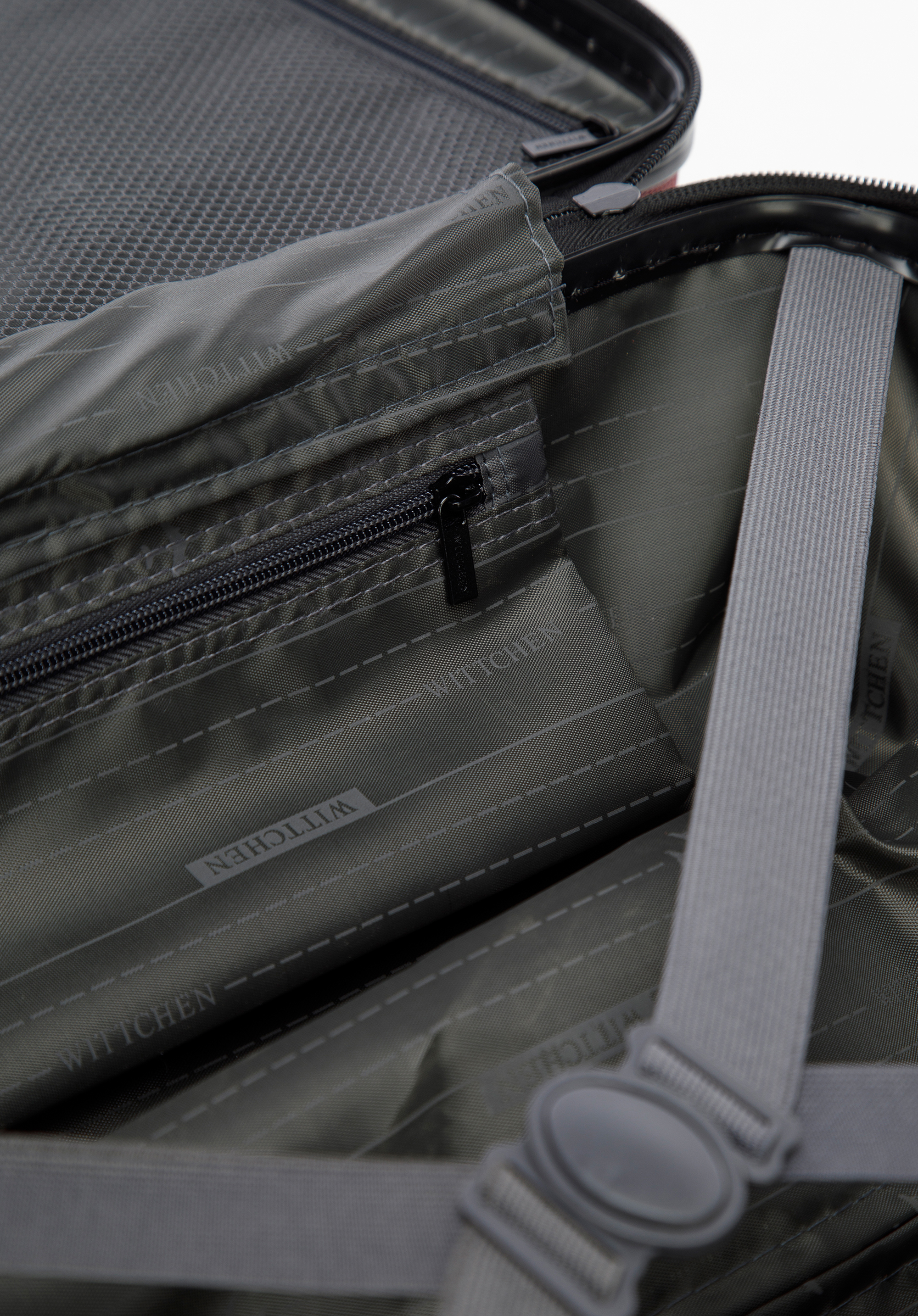 - Suitcase interior: Two compartments – one with elastic cross straps and the other with a zip closure; additional pockets (one mesh and one zipped) help with storage.