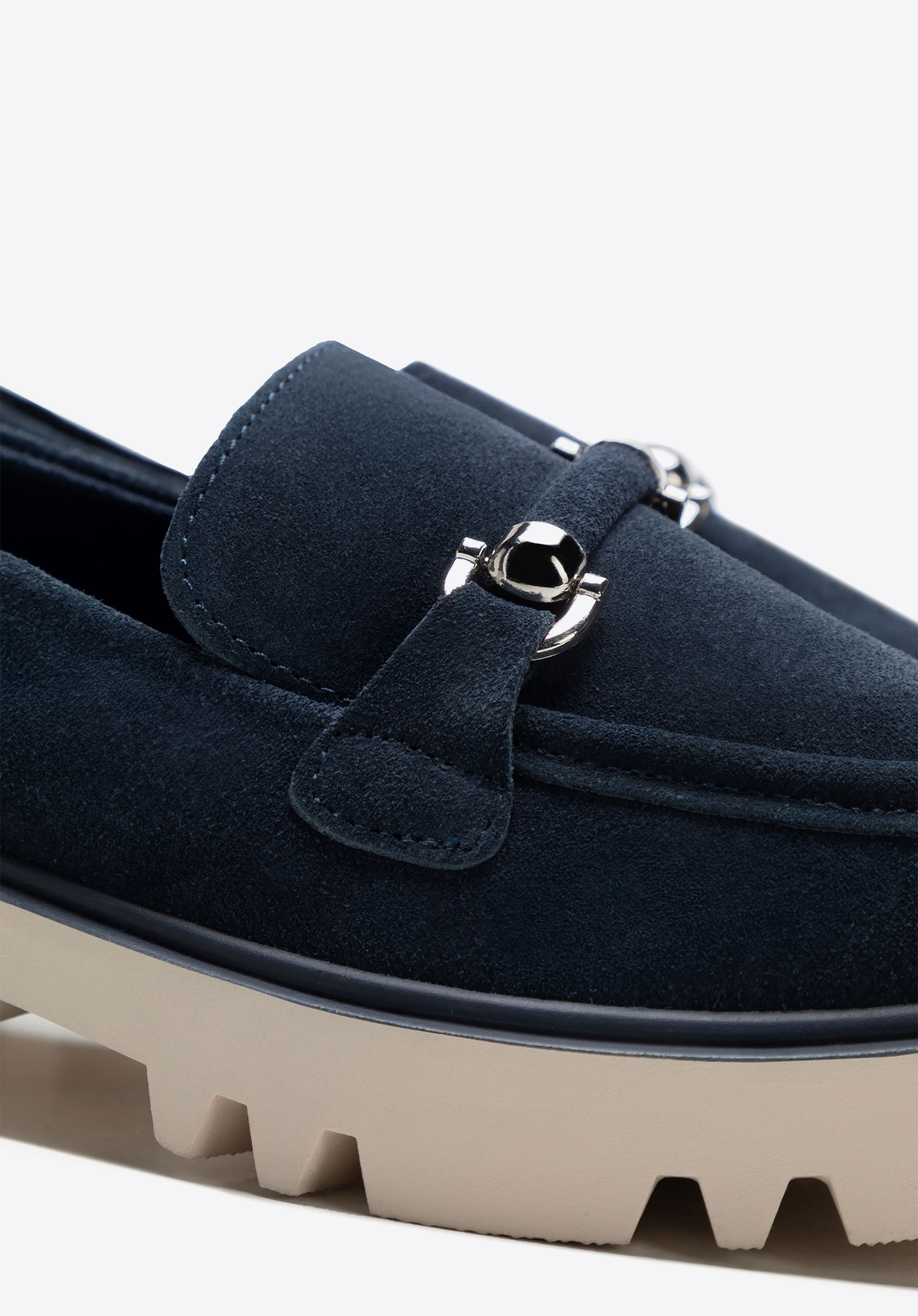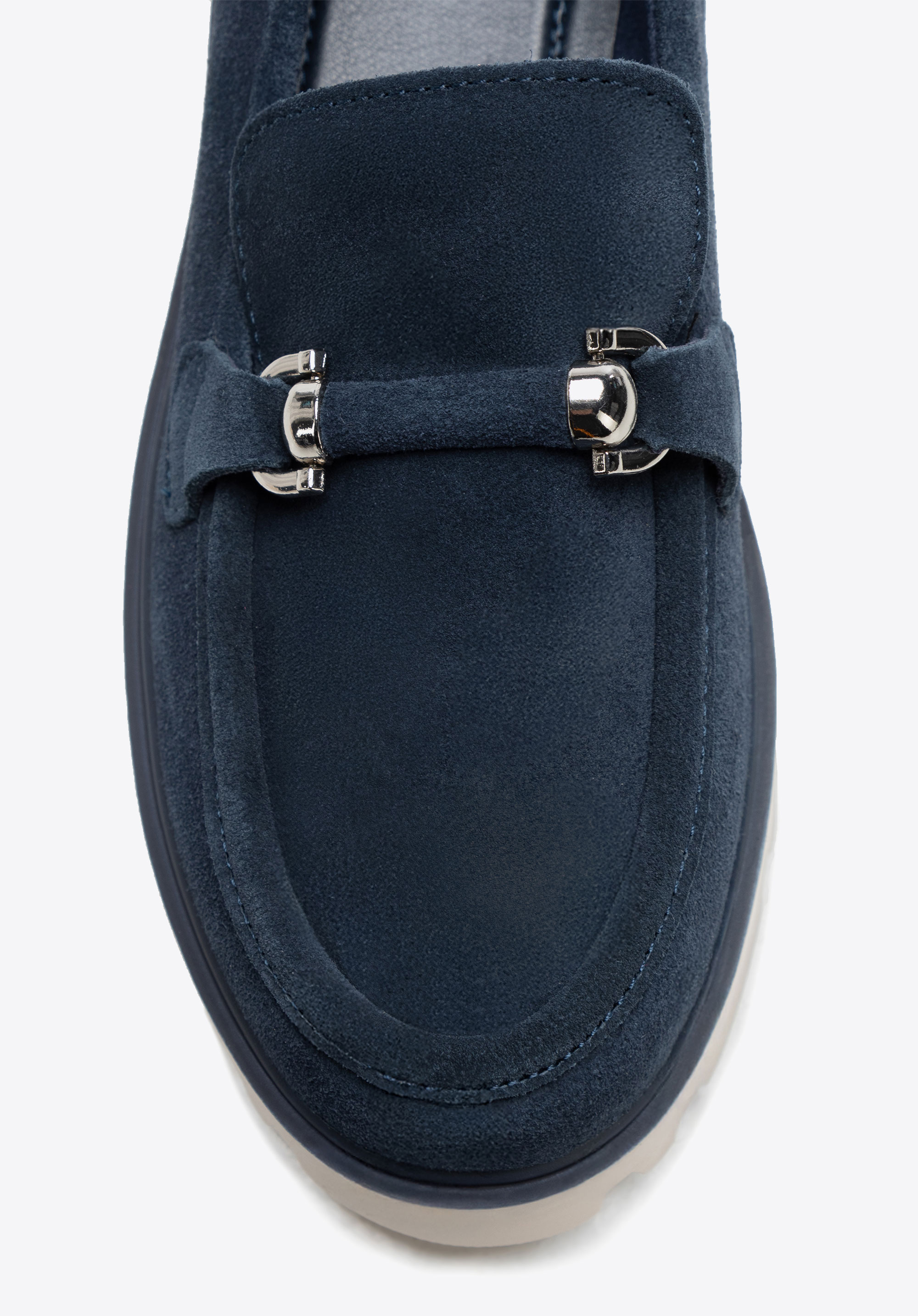 These loafers combine classic style with a modern touch. Made from soft suede leather, they exude subtle elegance, while the shiny buckle adds a sophisticated accent. The slip-on design ensures convenience, and the rounded toe provides all-day comfort. The track sole not only highlights a trendy look but also enhances stability and confidence with every step. The interior is finished with faux leather and soft microfibre, offering comfort even during prolonged wear.
