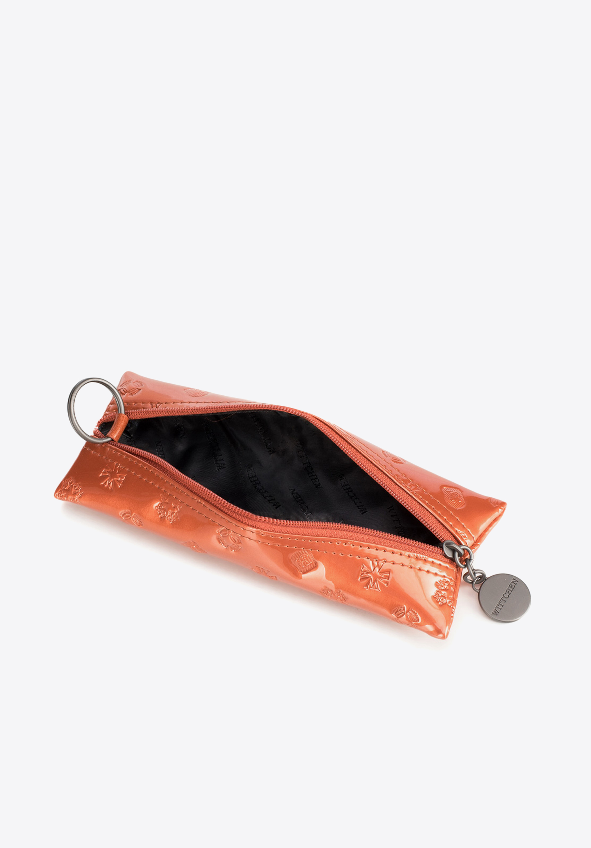 Etui na klucze ze skóry lakierowanej z monogramem sprawdzi się w torebce i w dłoni, gdy chcesz mieć klucze zawsze pod kontrolą i w eleganckiej oprawie. Lakierowana skóra z tłoczeniem, zapięcie na suwak oraz kółko na klucze ułatwiają przechowywanie i szybkie odnalezienie drobiazgu.
