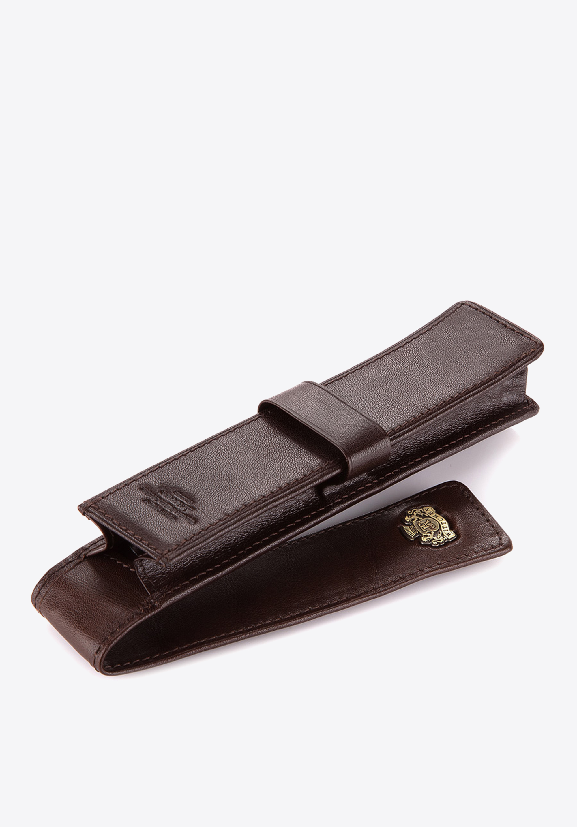Etui na pióro skórzane z herbem będzie idealne do pracy i na spotkania biznesowe, gdy eleganckie pióro ma mieć oprawę na miarę. Skóra cielęca, dopracowany kształt i metalowy herb chronią przed zarysowaniami, podkreślając prestiż dodatku.