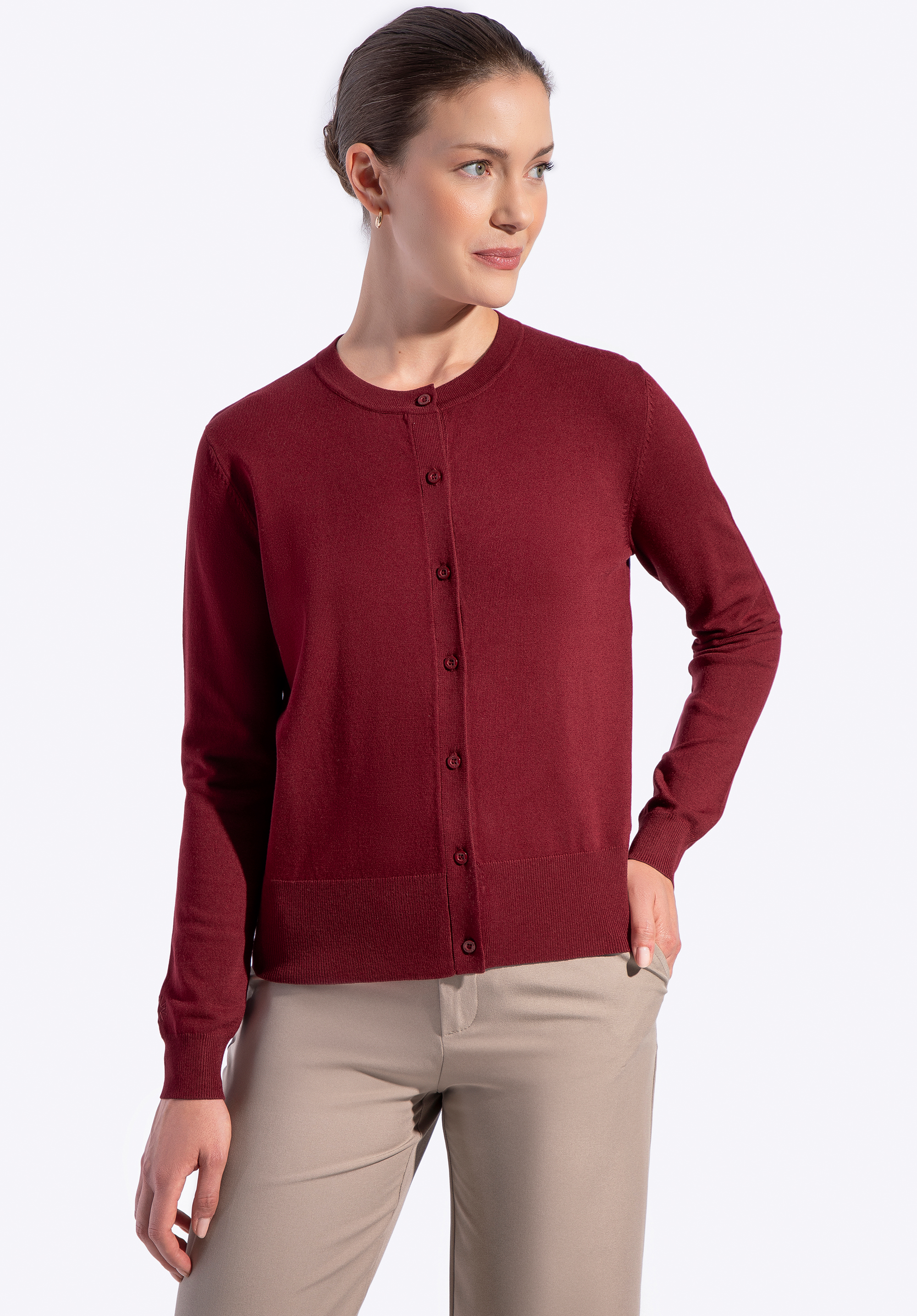 - Idealne dopasowanie u dołu: Wykończenie ze ściągaczami zapewnia stabilne przyleganie, dzięki czemu kardigan pozostaje na miejscu.