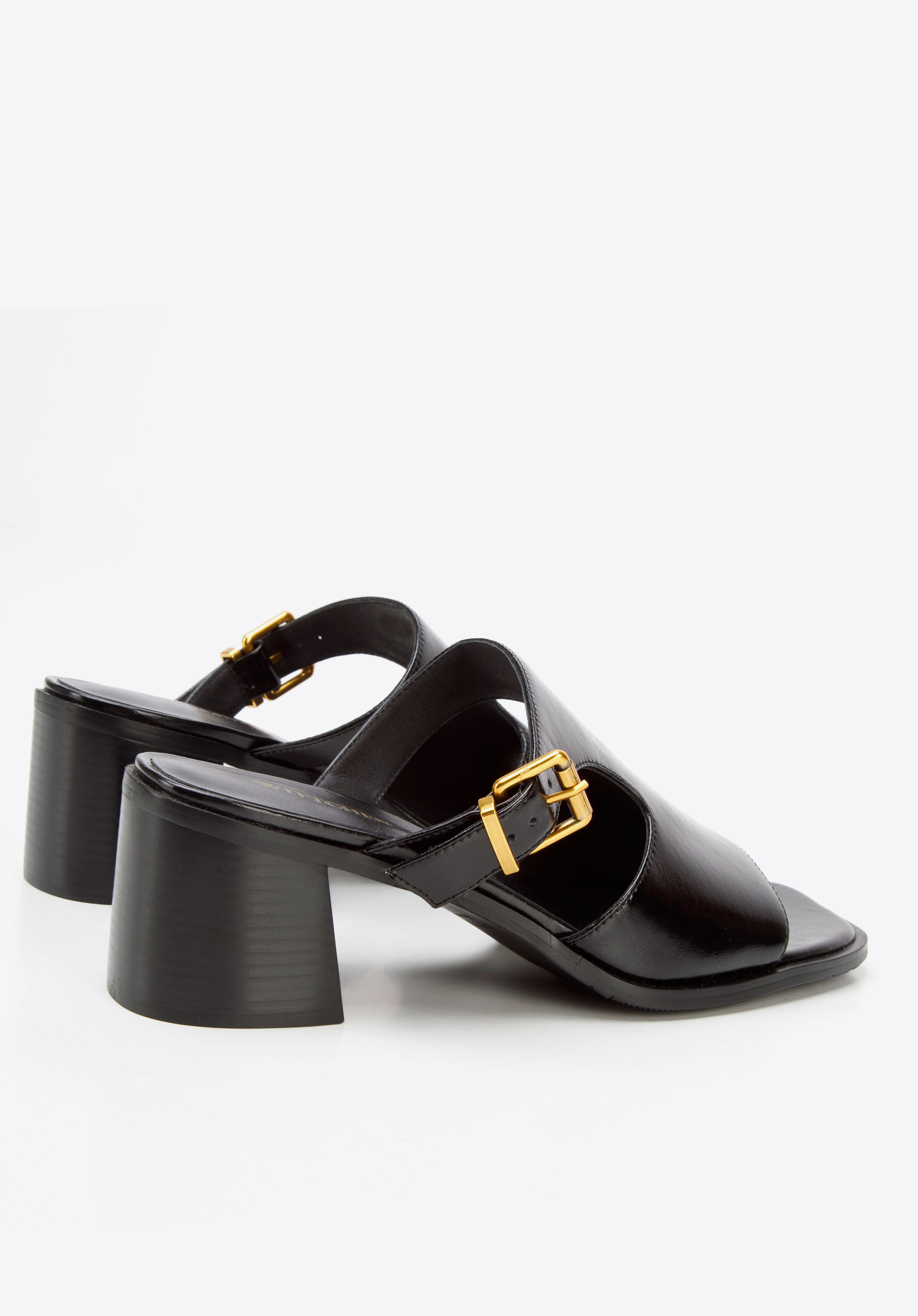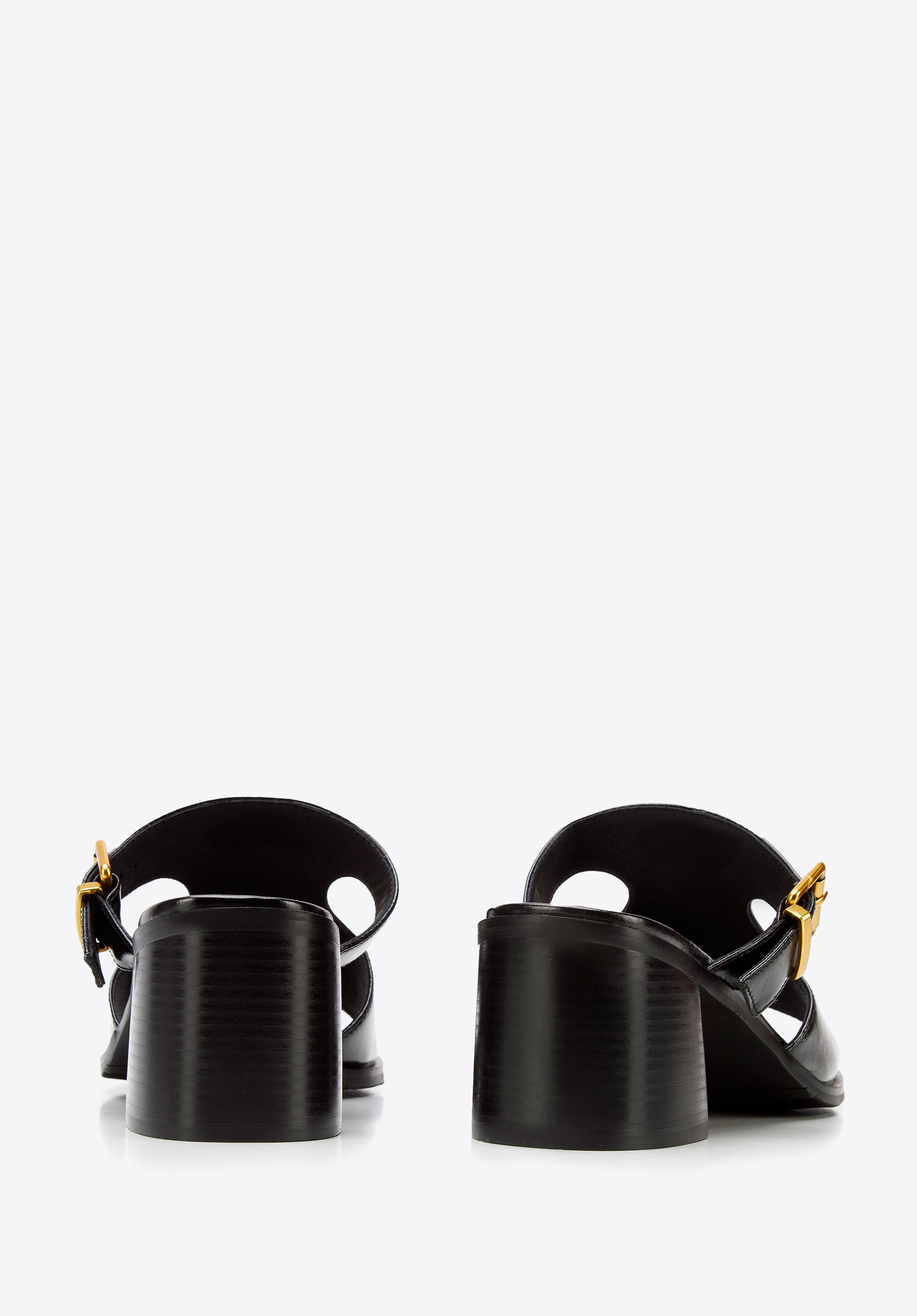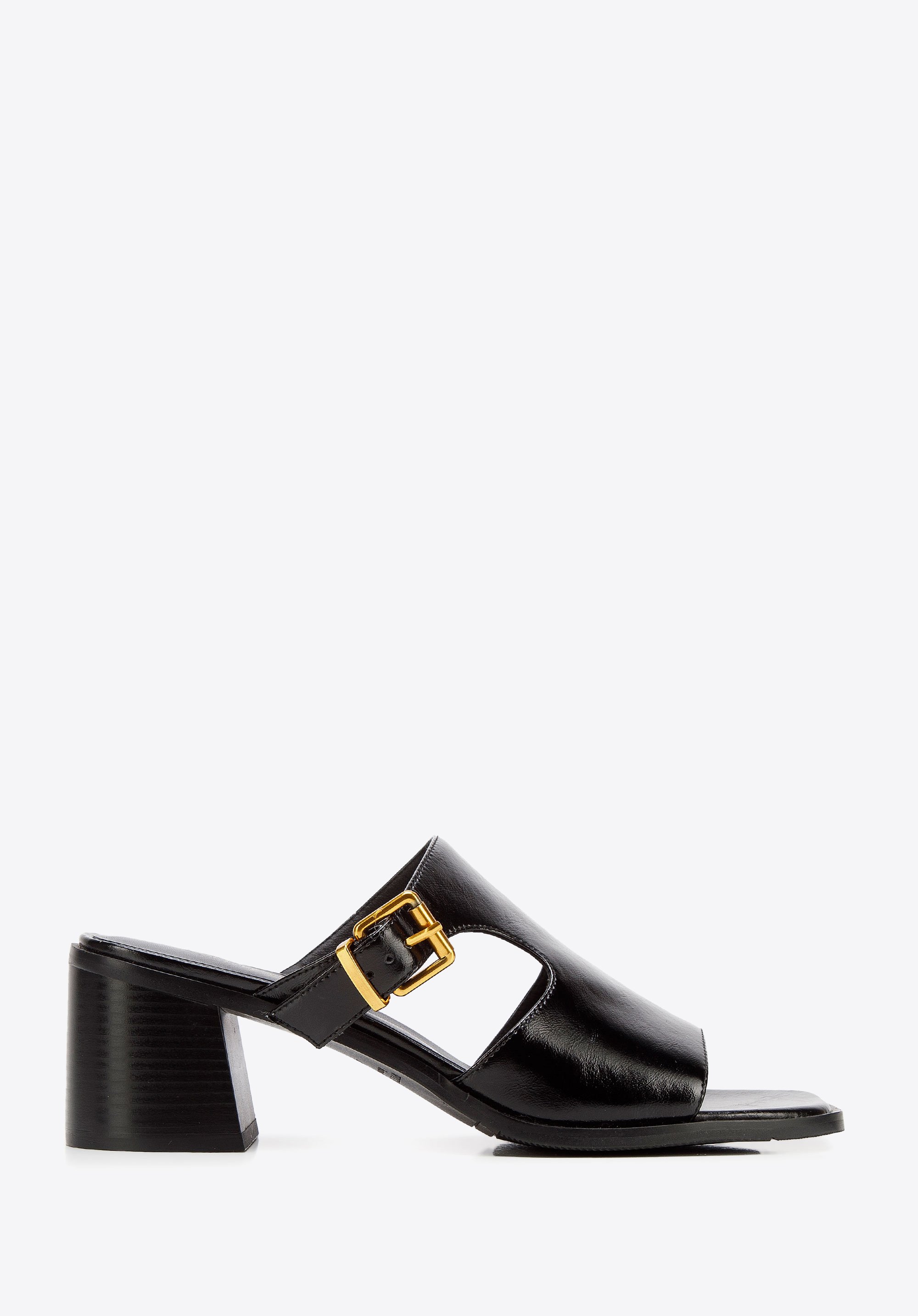 Obcas średniej wysokości jest szeroki i modnie ścięty. Klapki skórzane na słupku ze sprzączką to uniwersalny letni dodatek, który warto mieć w swojej szafie.