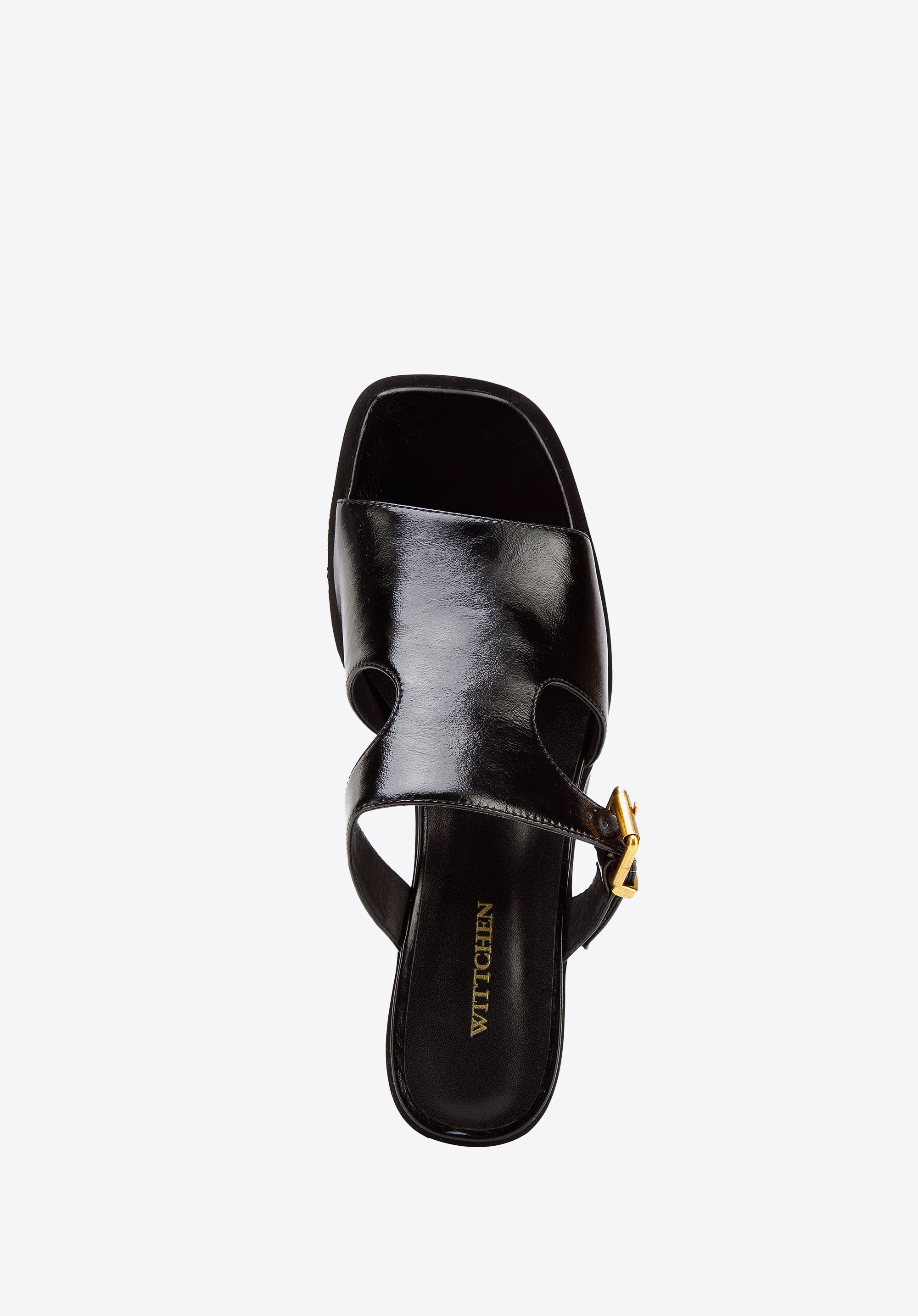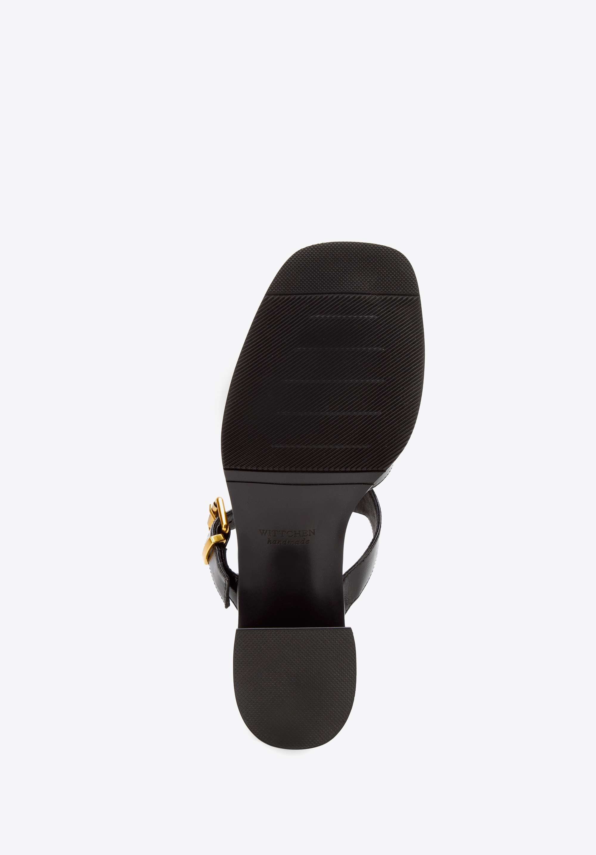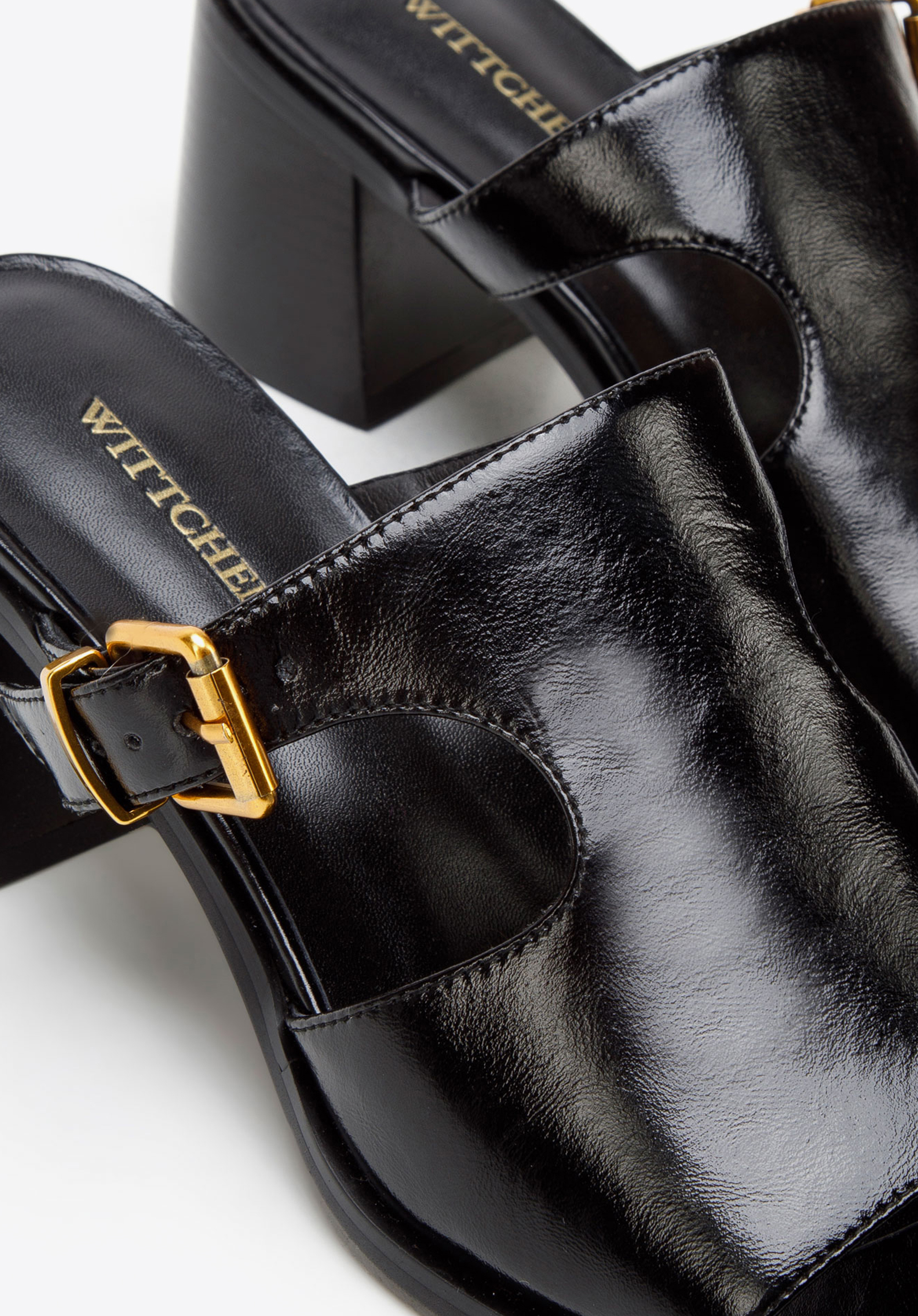 Obcas średniej wysokości jest szeroki i modnie ścięty. Klapki skórzane na słupku ze sprzączką to uniwersalny letni dodatek, który warto mieć w swojej szafie.