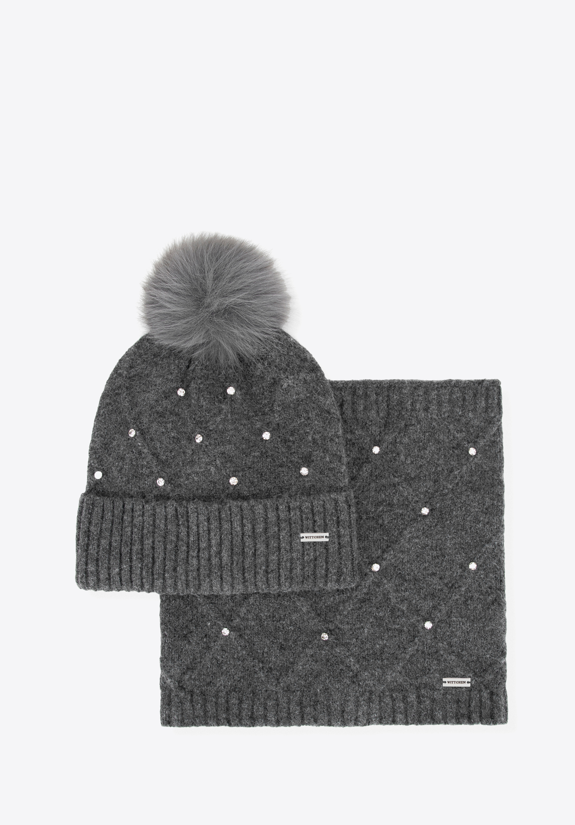 Nasza rada: Zestaw doskonale uzupełni klasyczne płaszcze, puchowe kurtki oraz ciepłe swetry. Czapka z miękkim pomponem z poliestru oraz ozdobnymi kryształkami z tworzywa sztucznego doda Twojej stylizacji wyjątkowego blasku, a komin o ozdobnym splocie zapewni przyjemne ciepło i komfort noszenia.