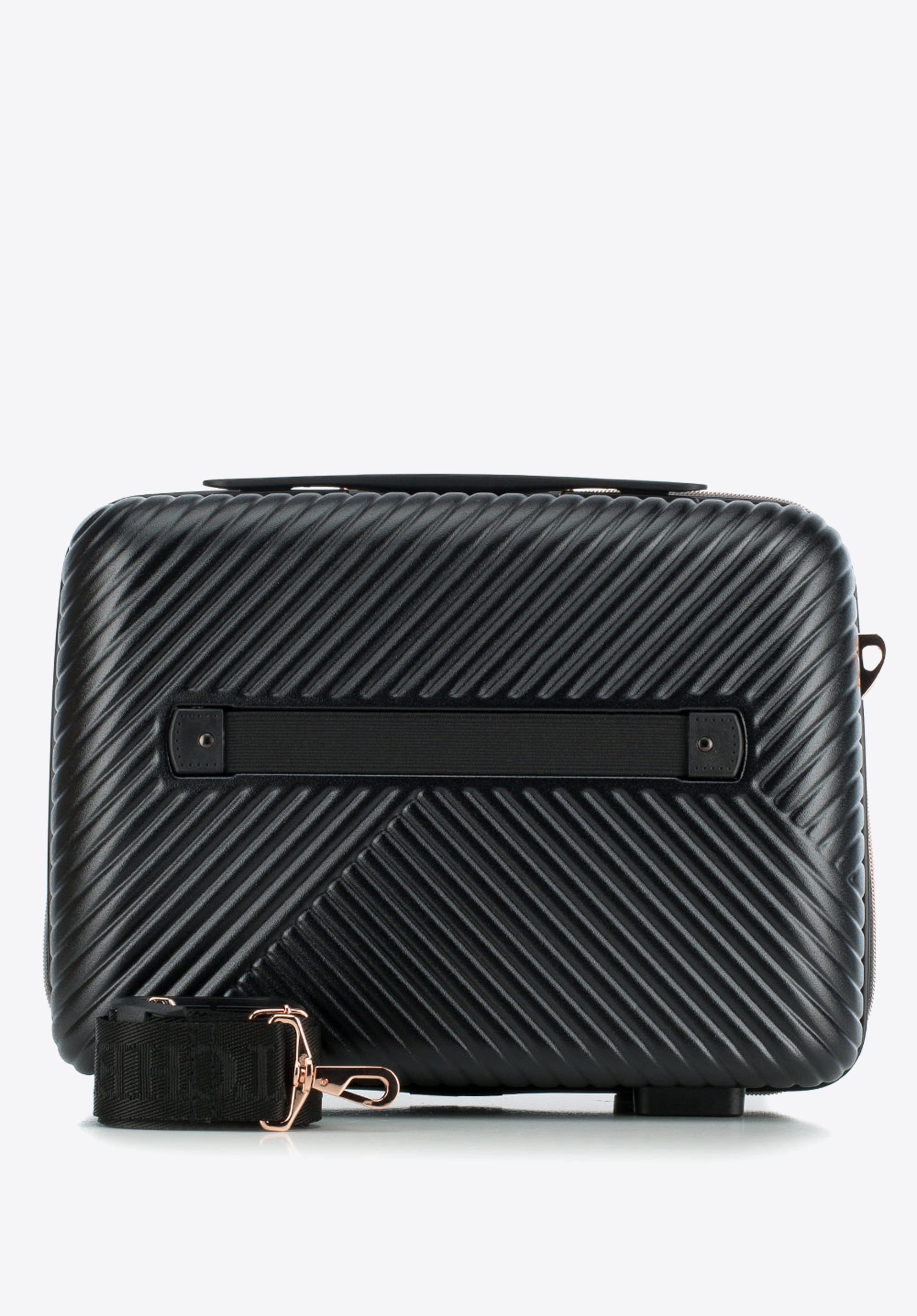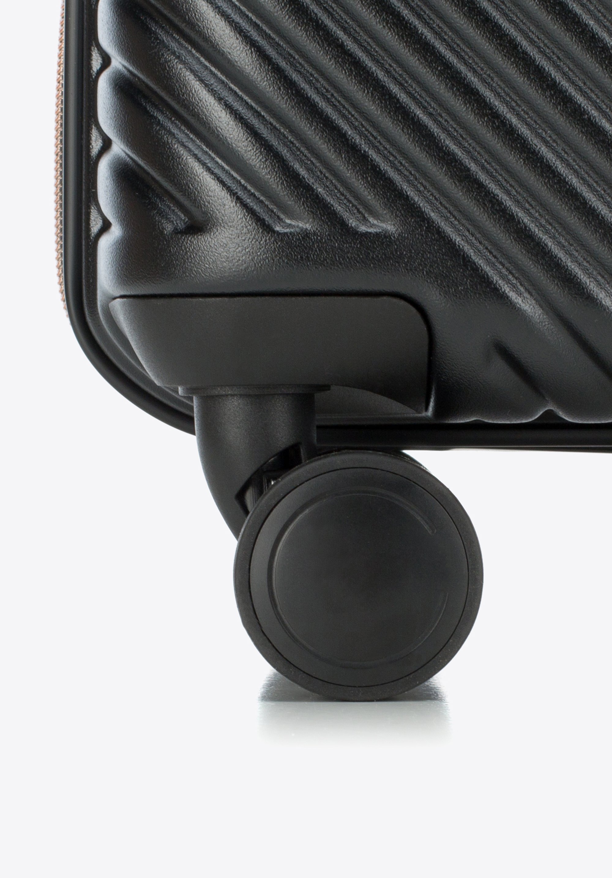 z lśniącymi okuciami w kolorze różowego złota.Kółka wykonane z tworzywa sztucznego ABS z elastyczną powłoką. Wnętrze bagażu pokrywa beżowa podszewka z logo WITTCHEN.
