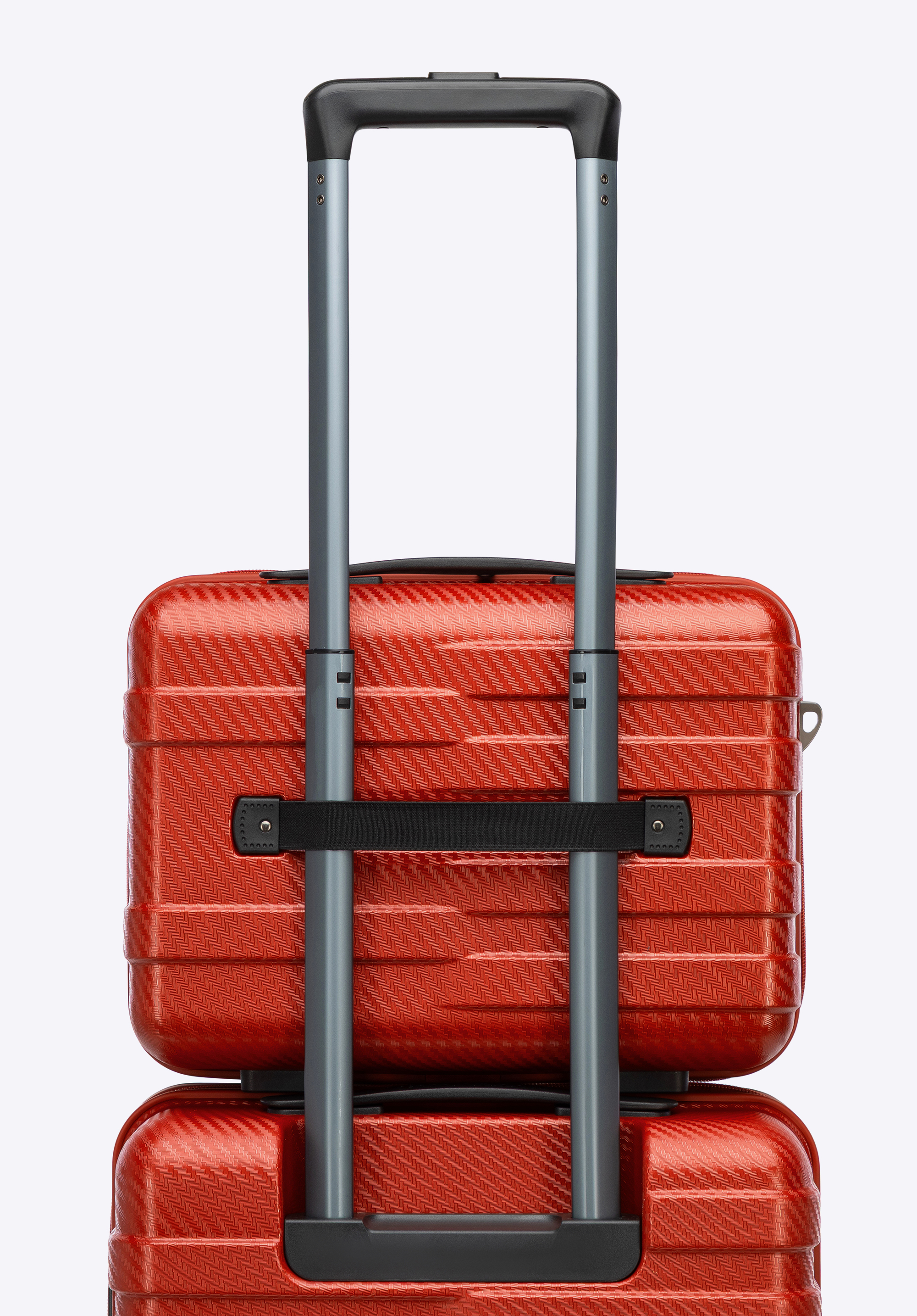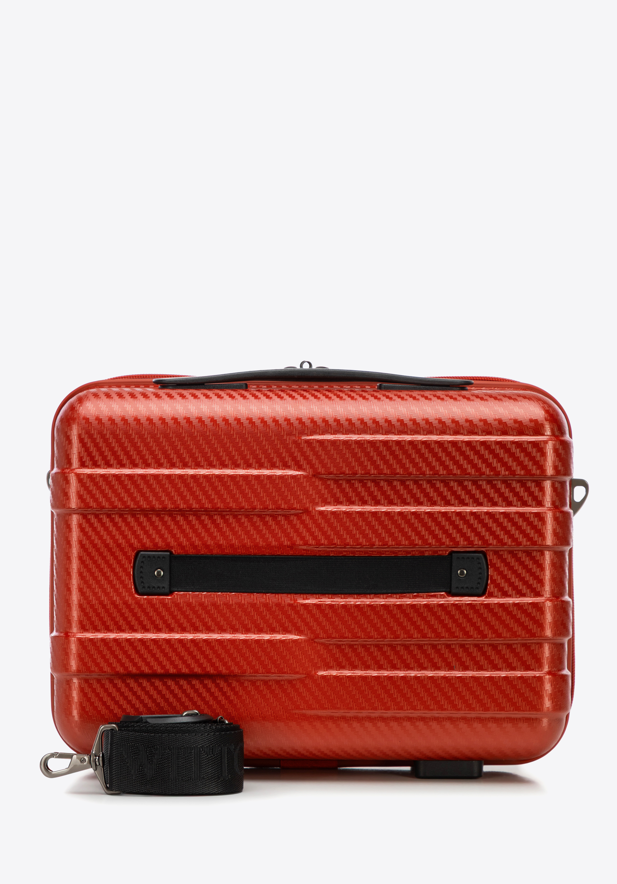 - Pasek i uchwyt z tyłu kosmetyczki: Odpinany, regulowany pasek do noszenia na ramieniu oraz wygodny uchwyt umożliwiający zawieszenie kosmetyczki na teleskopowej rączce walizki.