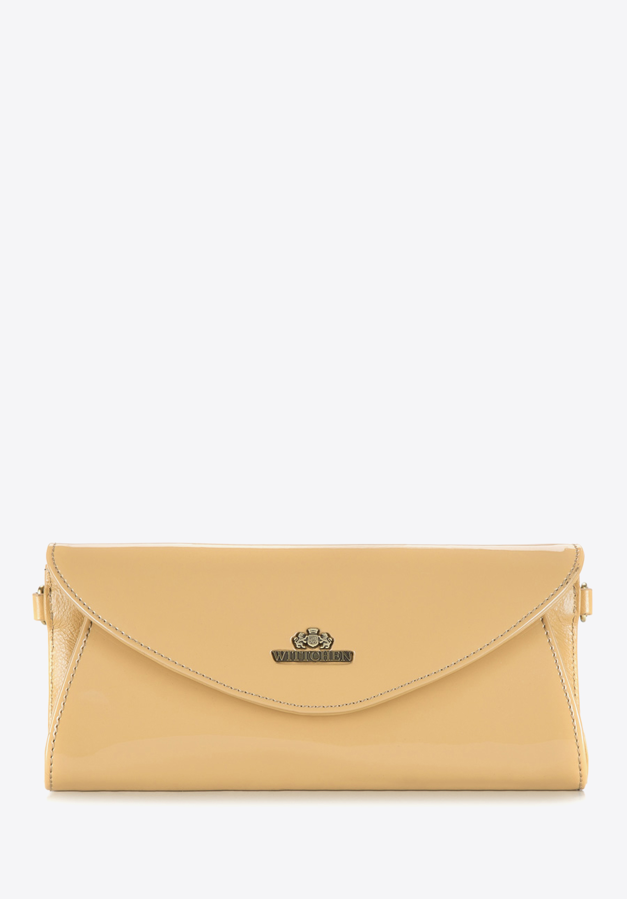 Beżowa kopertówka ze skóry lakierowanej. Pięknie komponuje się ze stylizacjami w jasnych odcieniach, jak też z klasycznymi kreacjami wieczorowymi w ponadczasowej czerni.