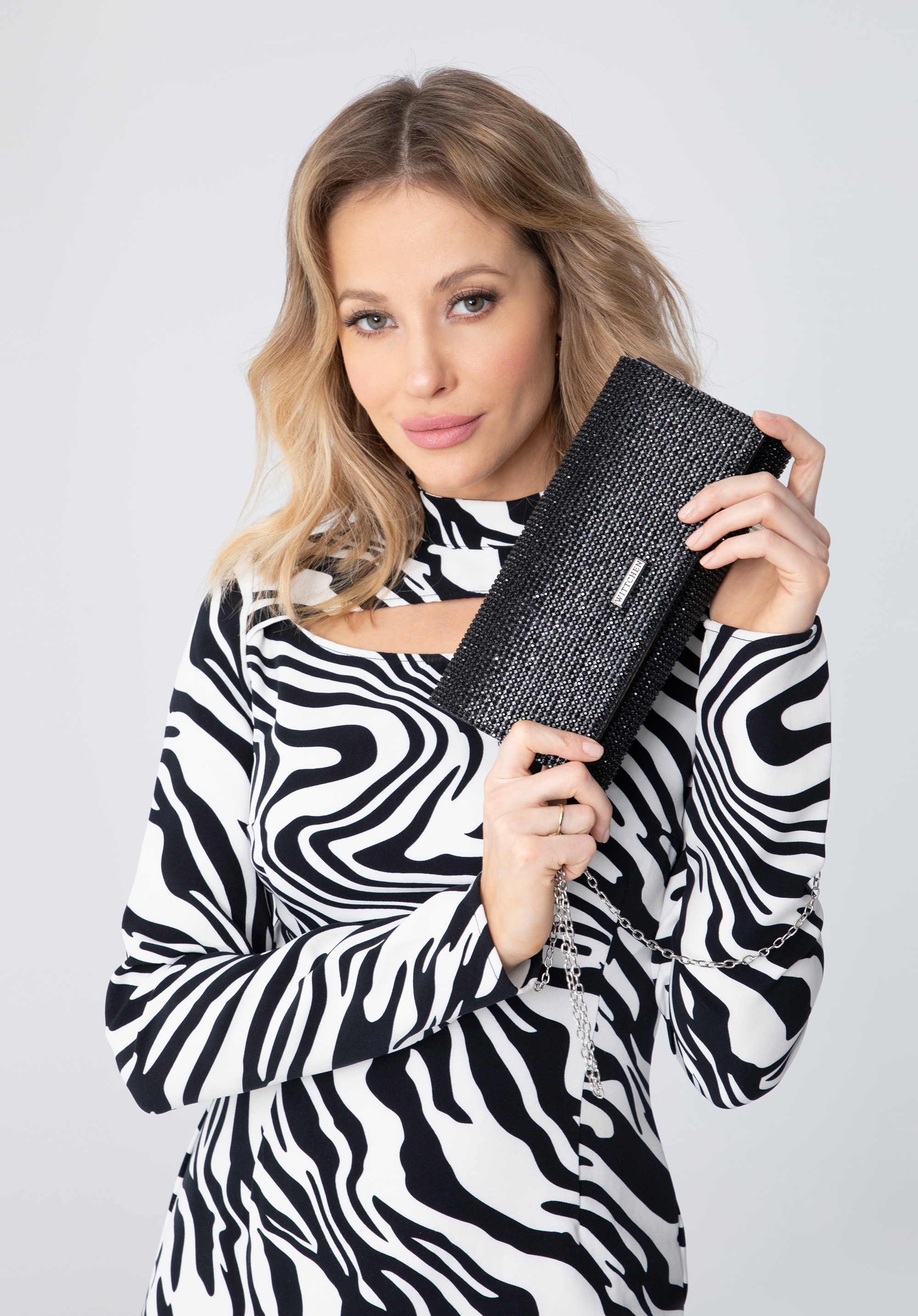 pokrywają drobne, błyszczące kryształki. W środku zmieścisz tylko najpotrzebniejsze rzeczy takie jak telefon, etui na karty, chusteczki i ulubioną szminkę – w sam raz na kolację, do teatru lub na eleganckie przyjęcie. Świetnie podkreśli koktajlową sukienkę i doda blasku do ulubionego kobiecego garnituru. Kopertówka z kryształkami to ponadczasowy dodatek, który warto mieć w swojej szafie.
