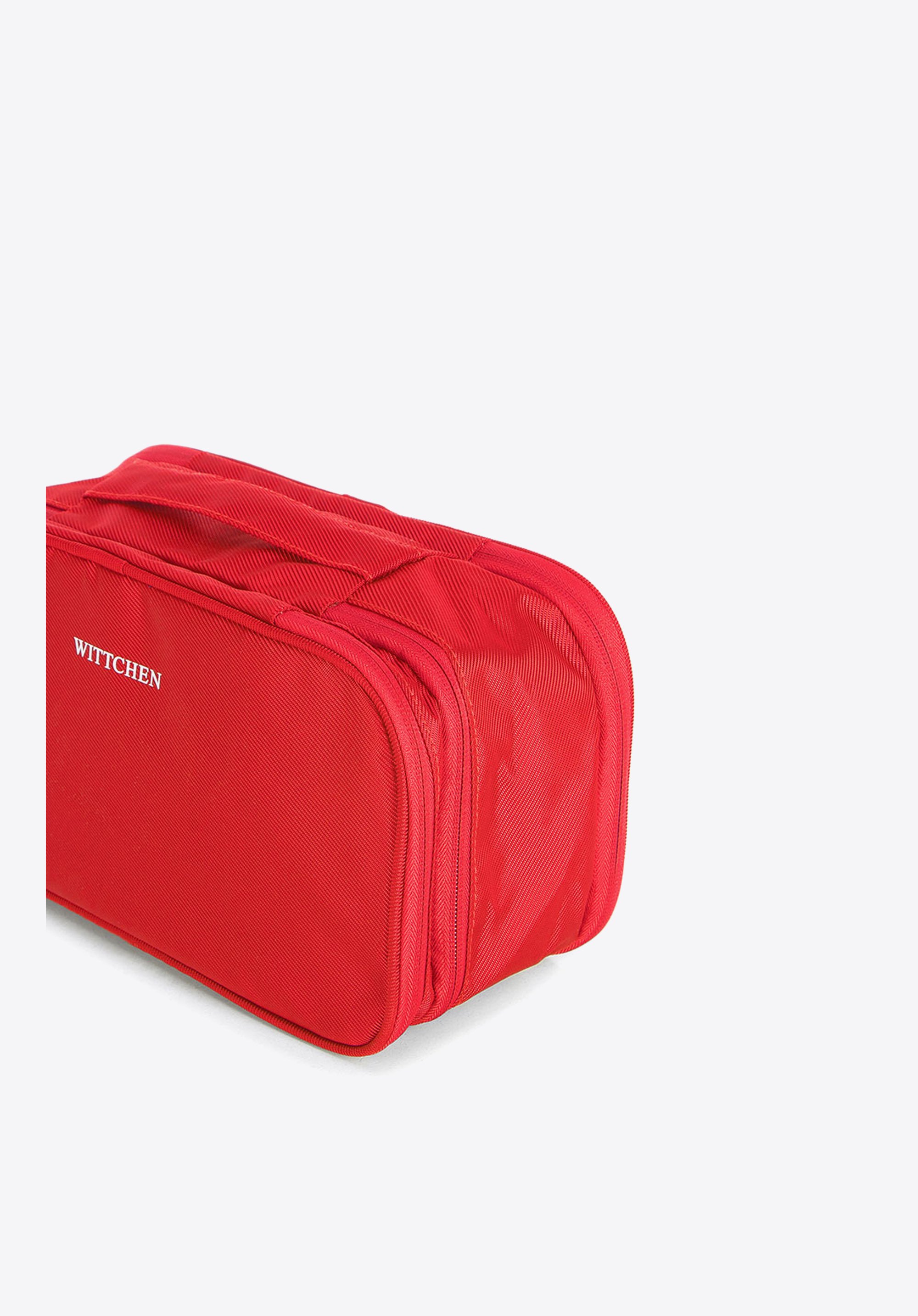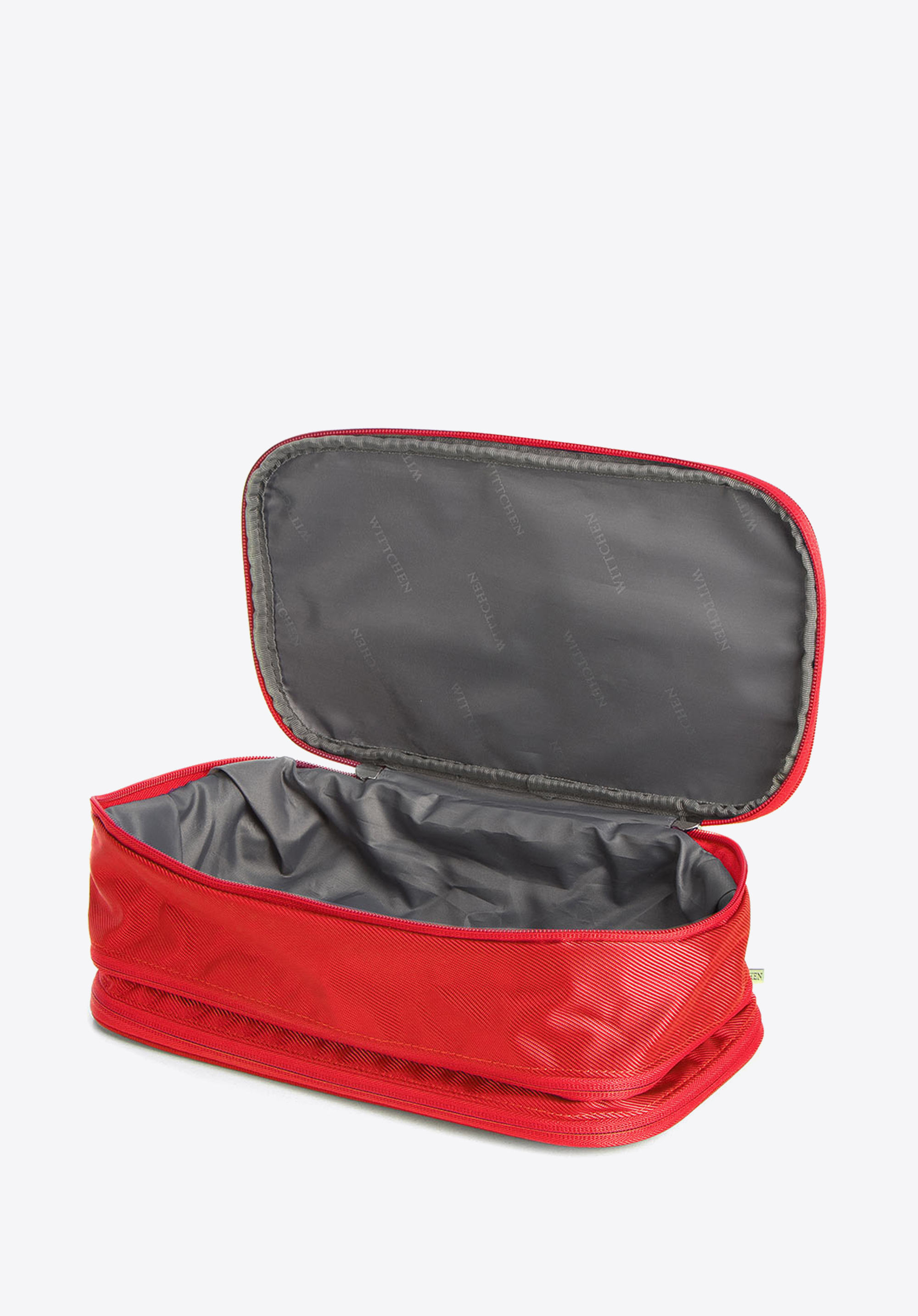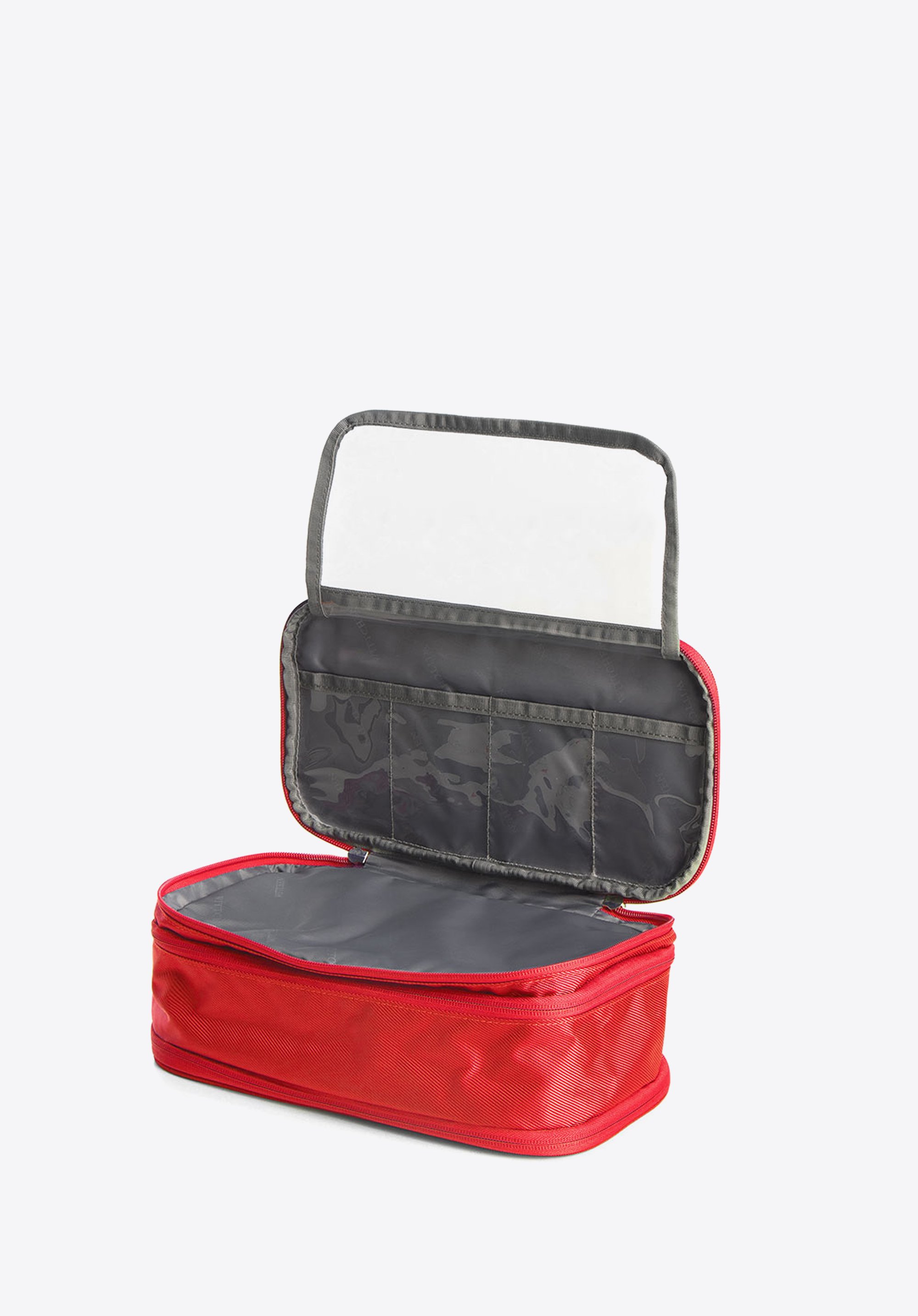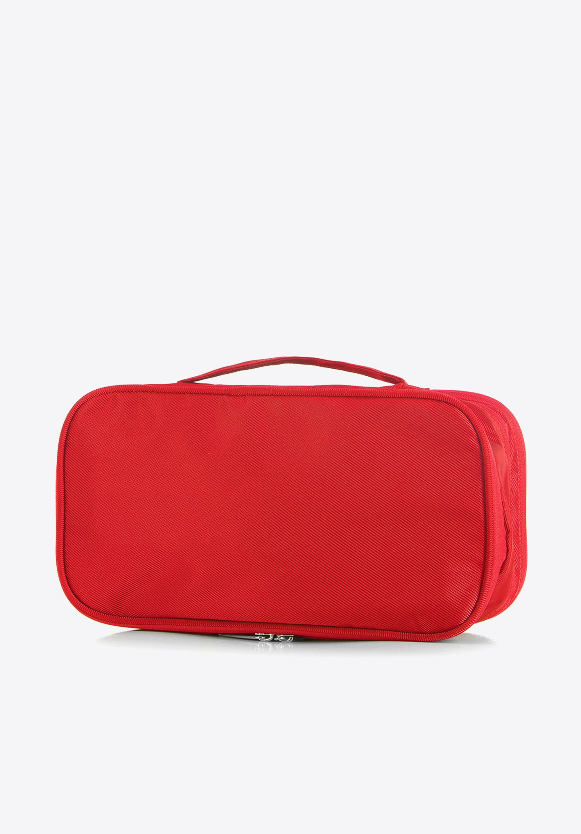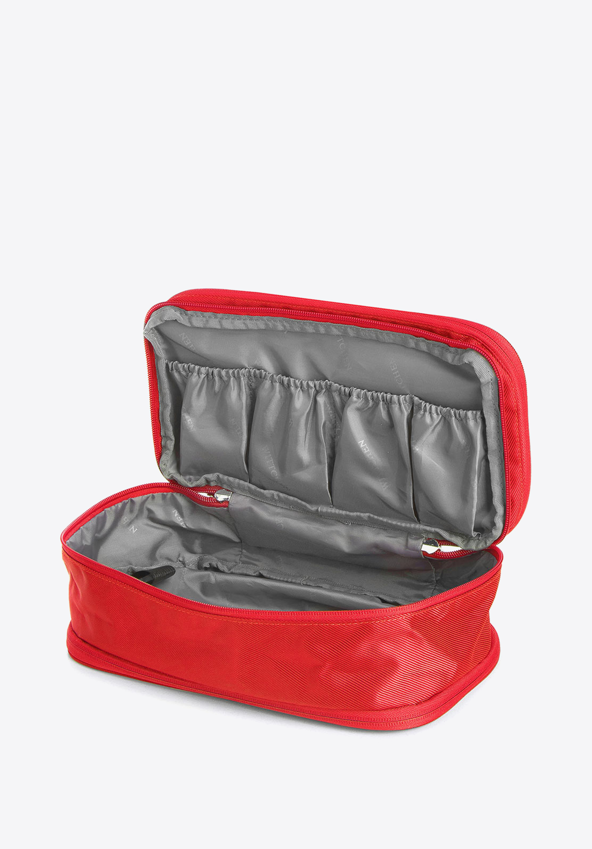 utrzymać porządek wewnątrz kosmetyczki. Prążkowane wykończenie o lekkim połysku jest odporne na plamy, a w razie zachlapania wodą szybko wyschnie. Ta duża kosmetyczka podróżna będzie też