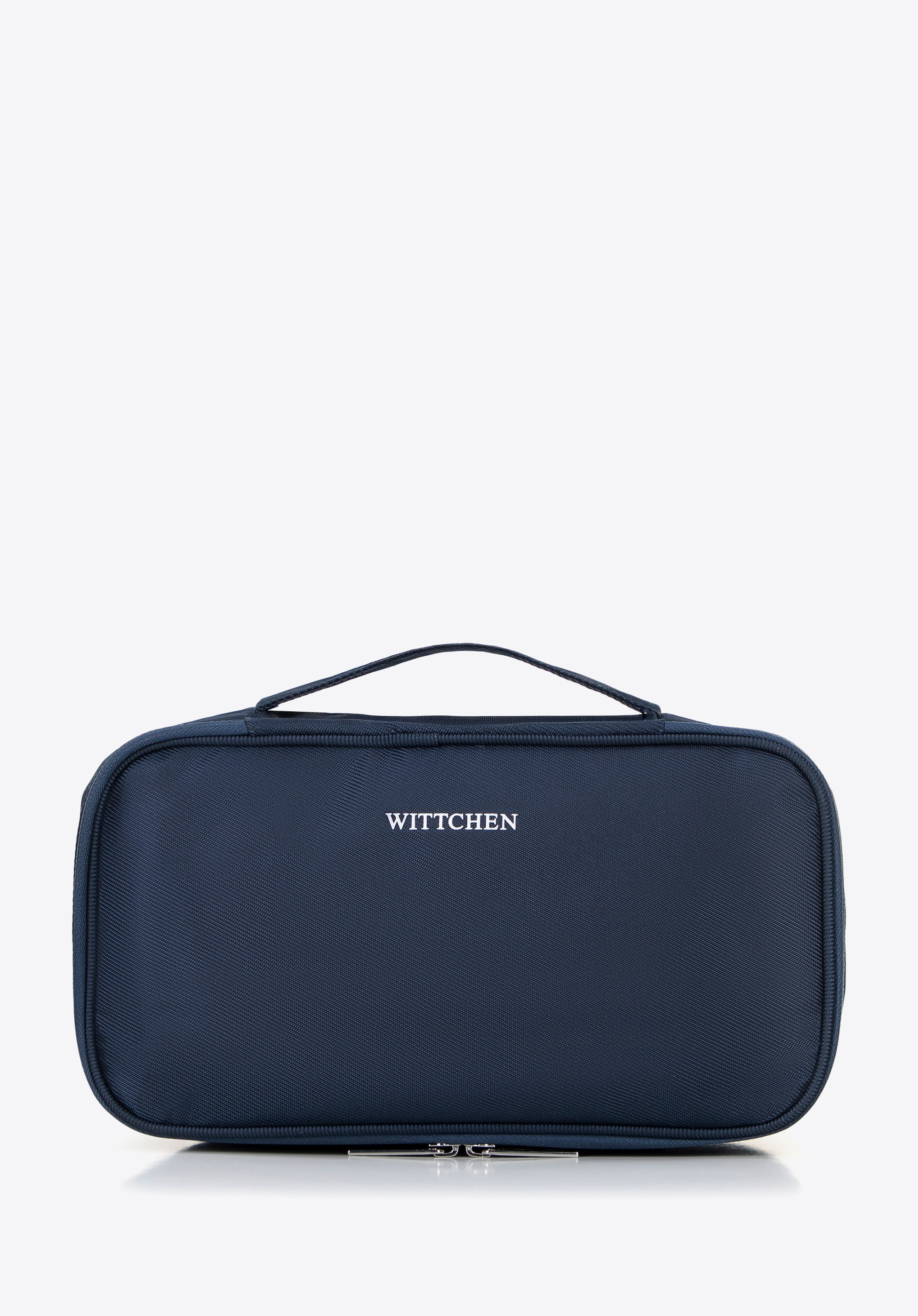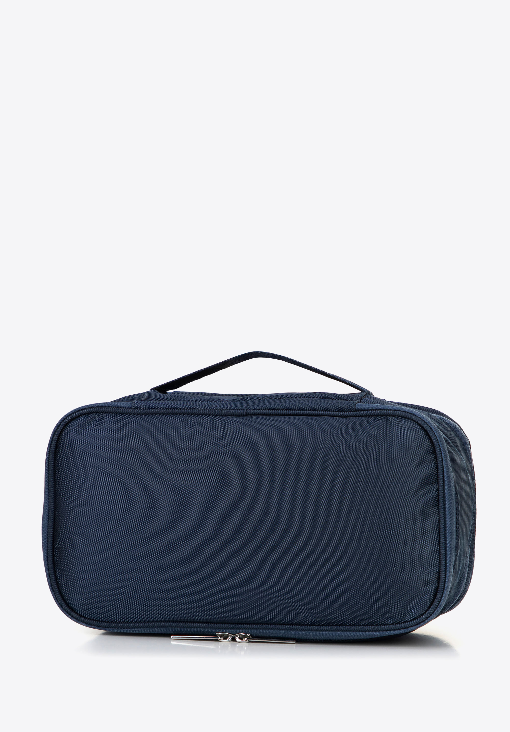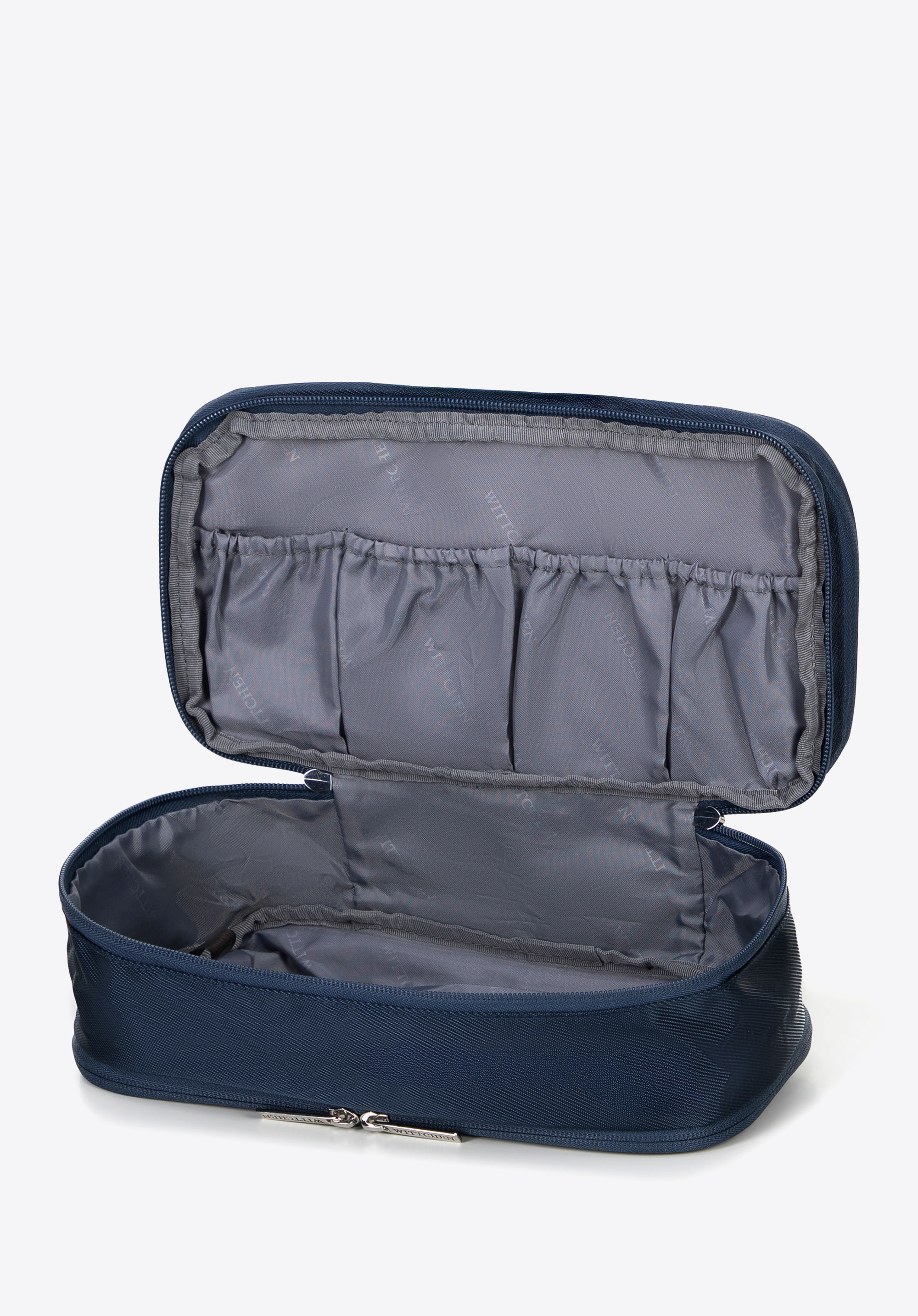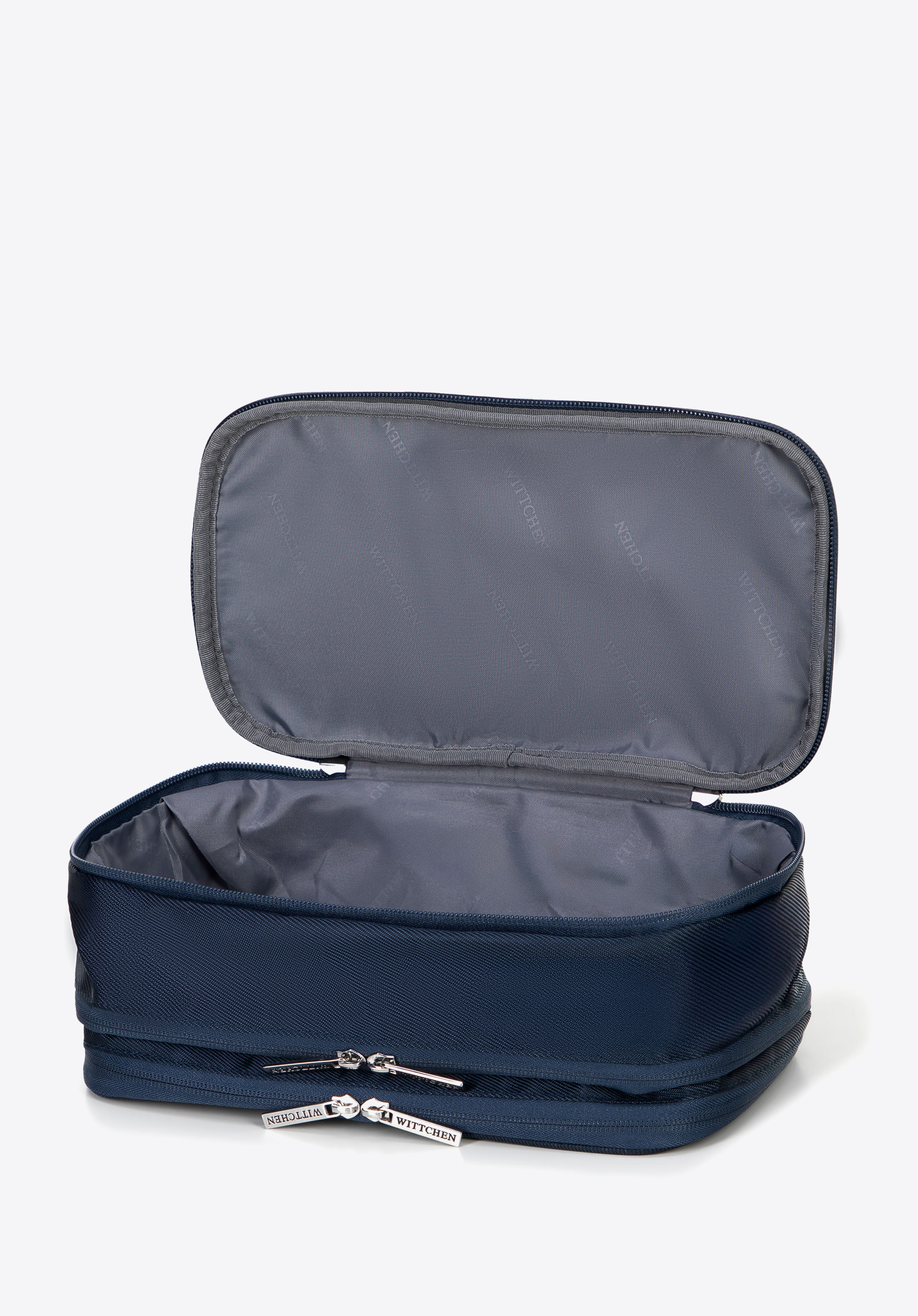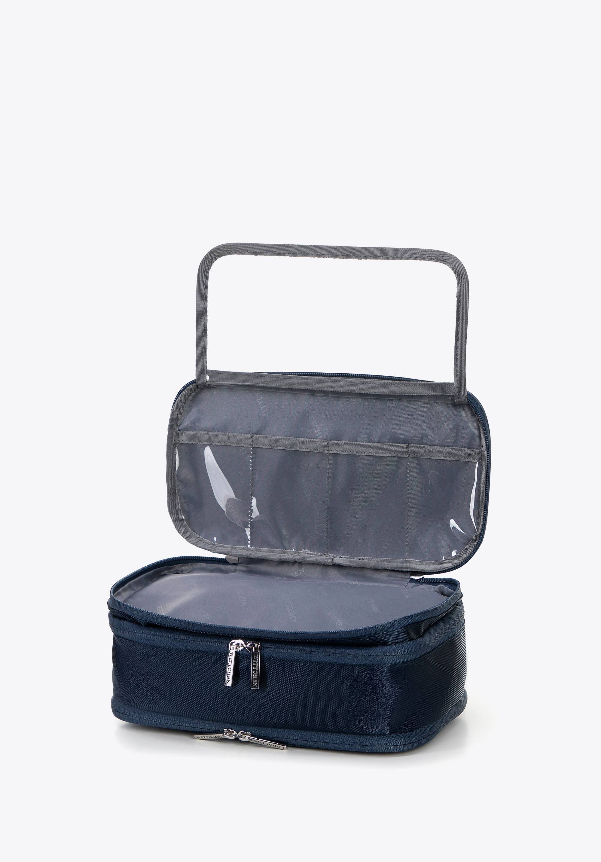 utrzymać porządek wewnątrz kosmetyczki. Prążkowane wykończenie o lekkim połysku jest odporne na plamy, a w razie zachlapania wodą szybko wyschnie. Ta duża kosmetyczka podróżna będzie też
