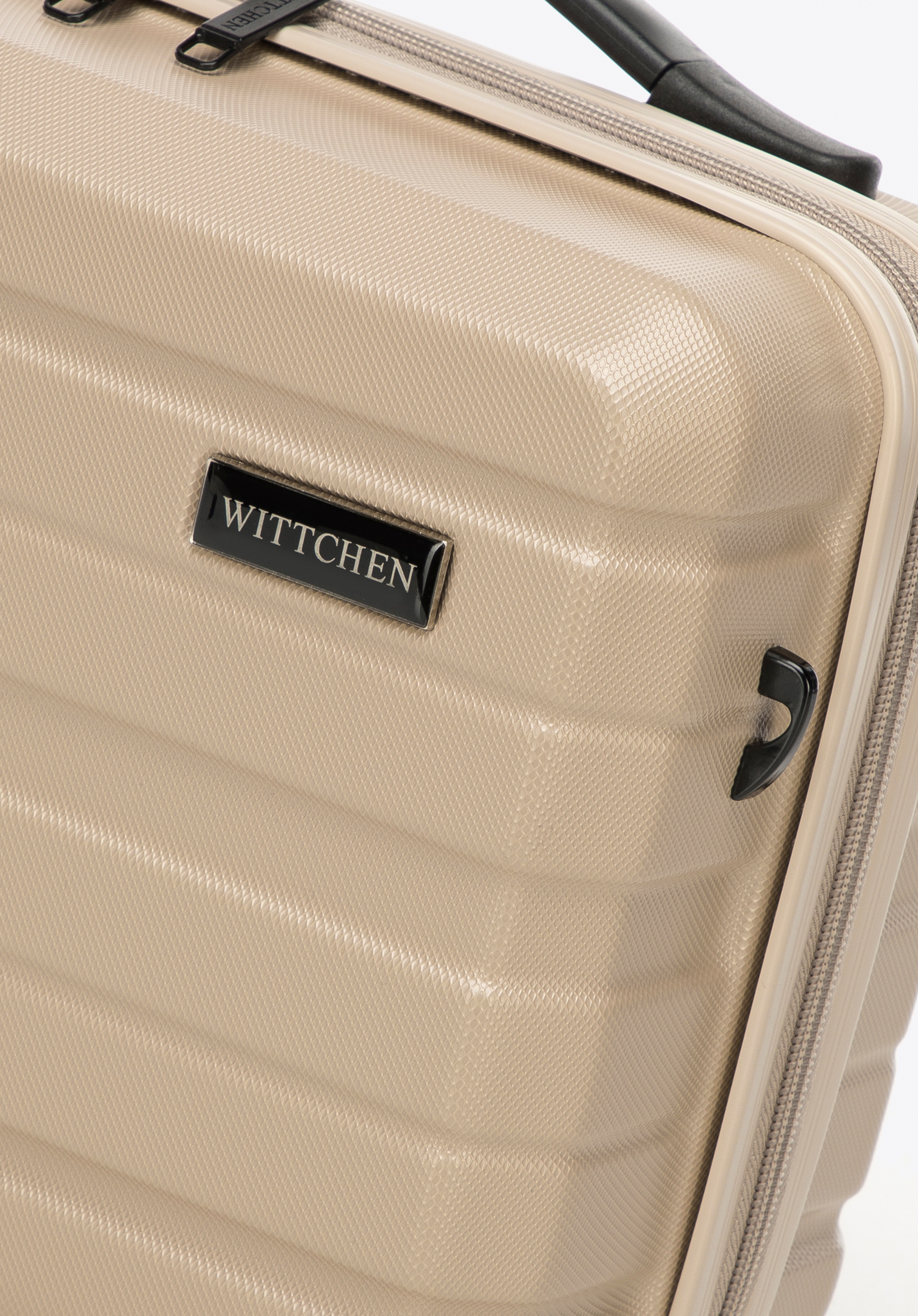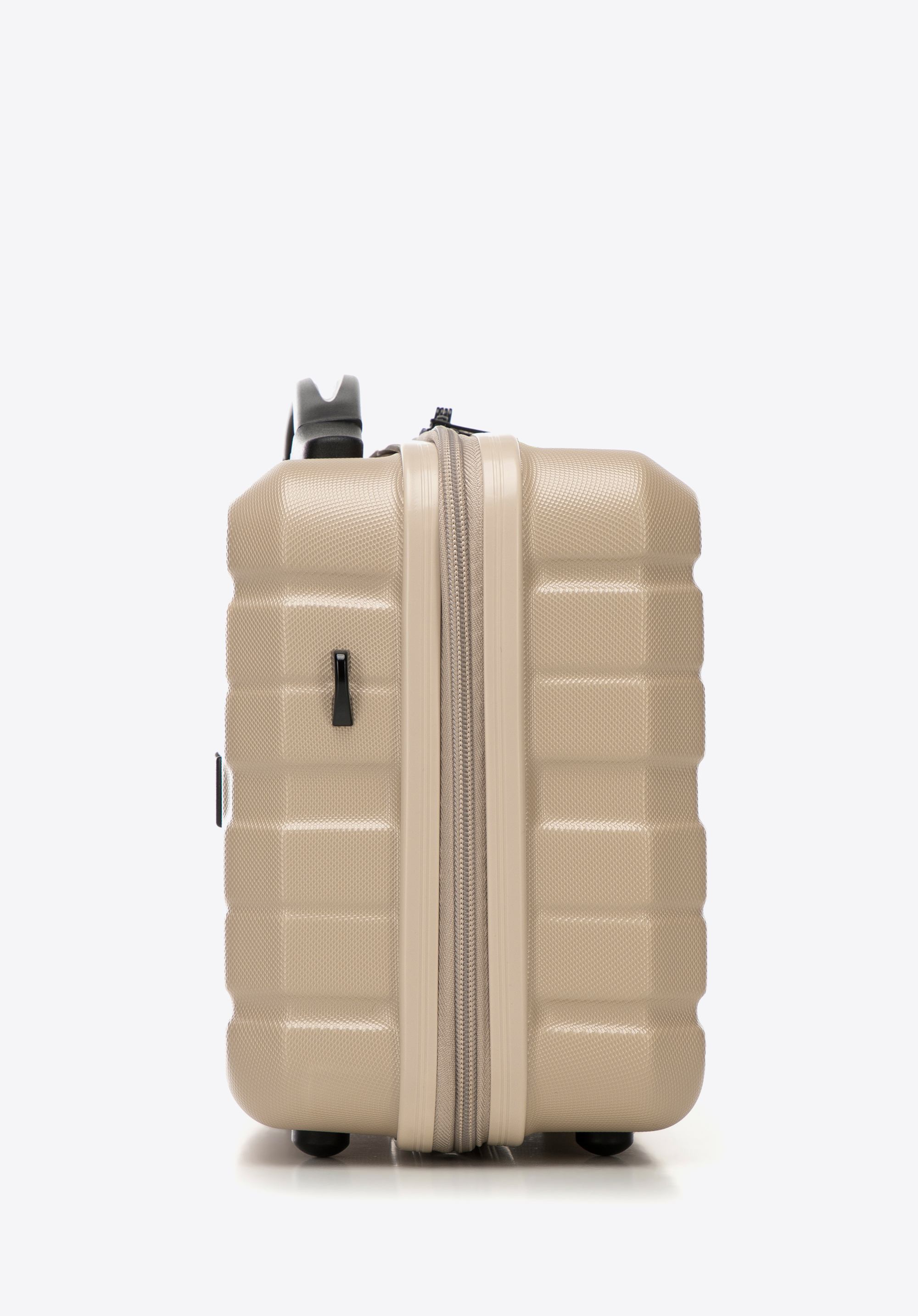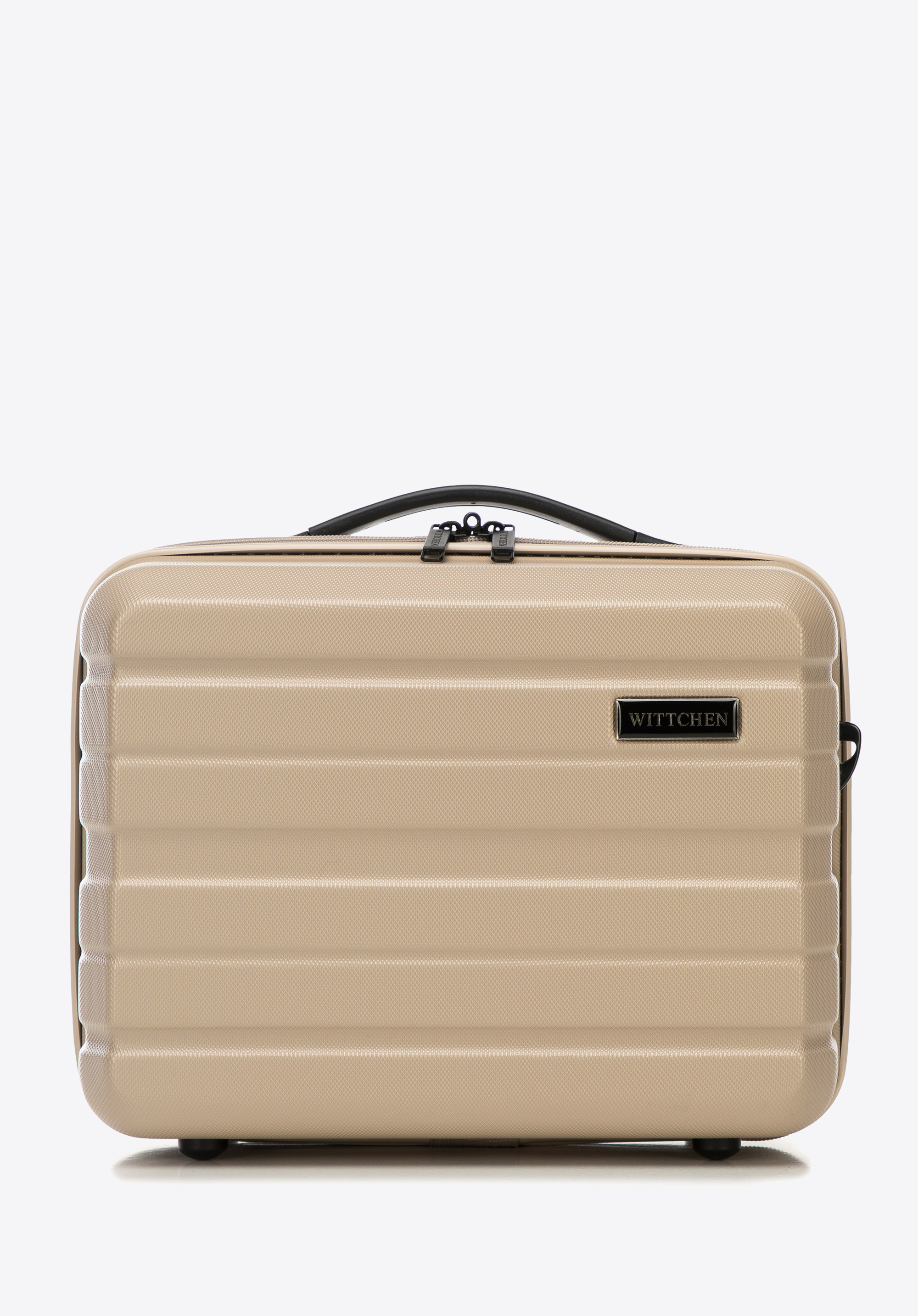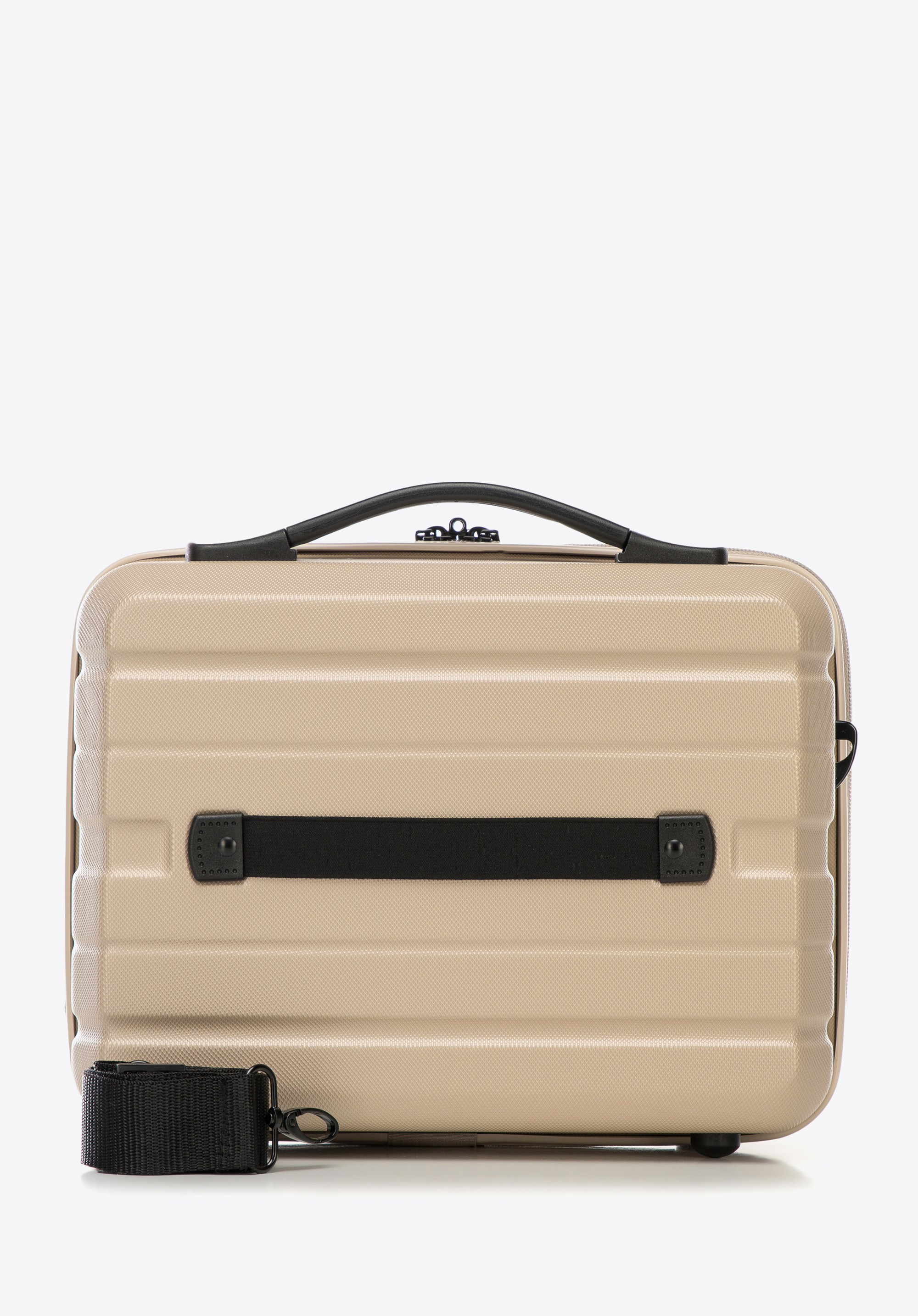 Z tyłu ma elastyczny pasek, dzięki któremu zaczepisz ją o uchwyt walizki. Kosmetyczka podróżna z ABS-u w poziome pasy to świetny wybór dla każdej eleganckiej kobiety.