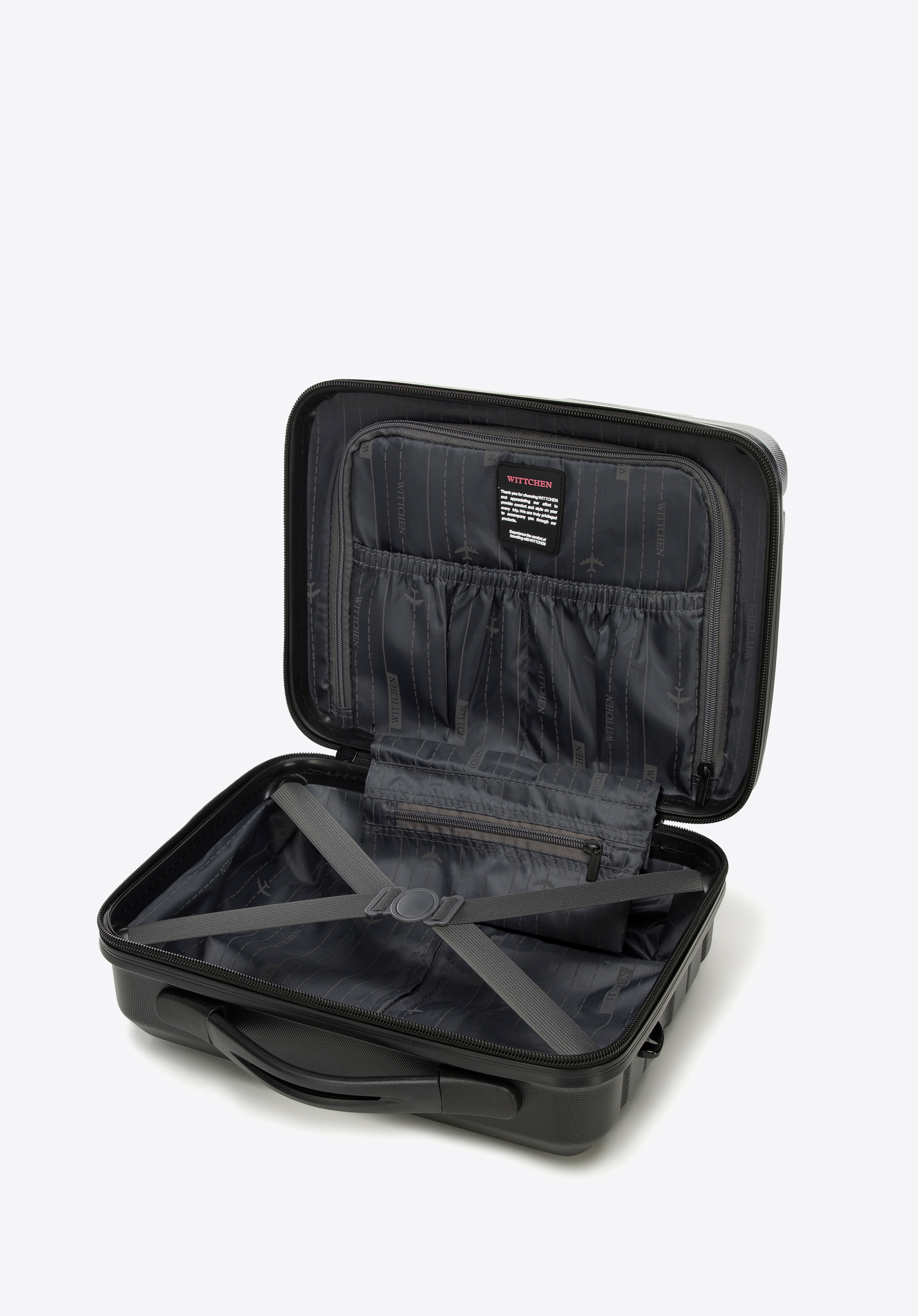 - z tyłu elastyczny pas umożliwiający mocowanie na rączce walizki;