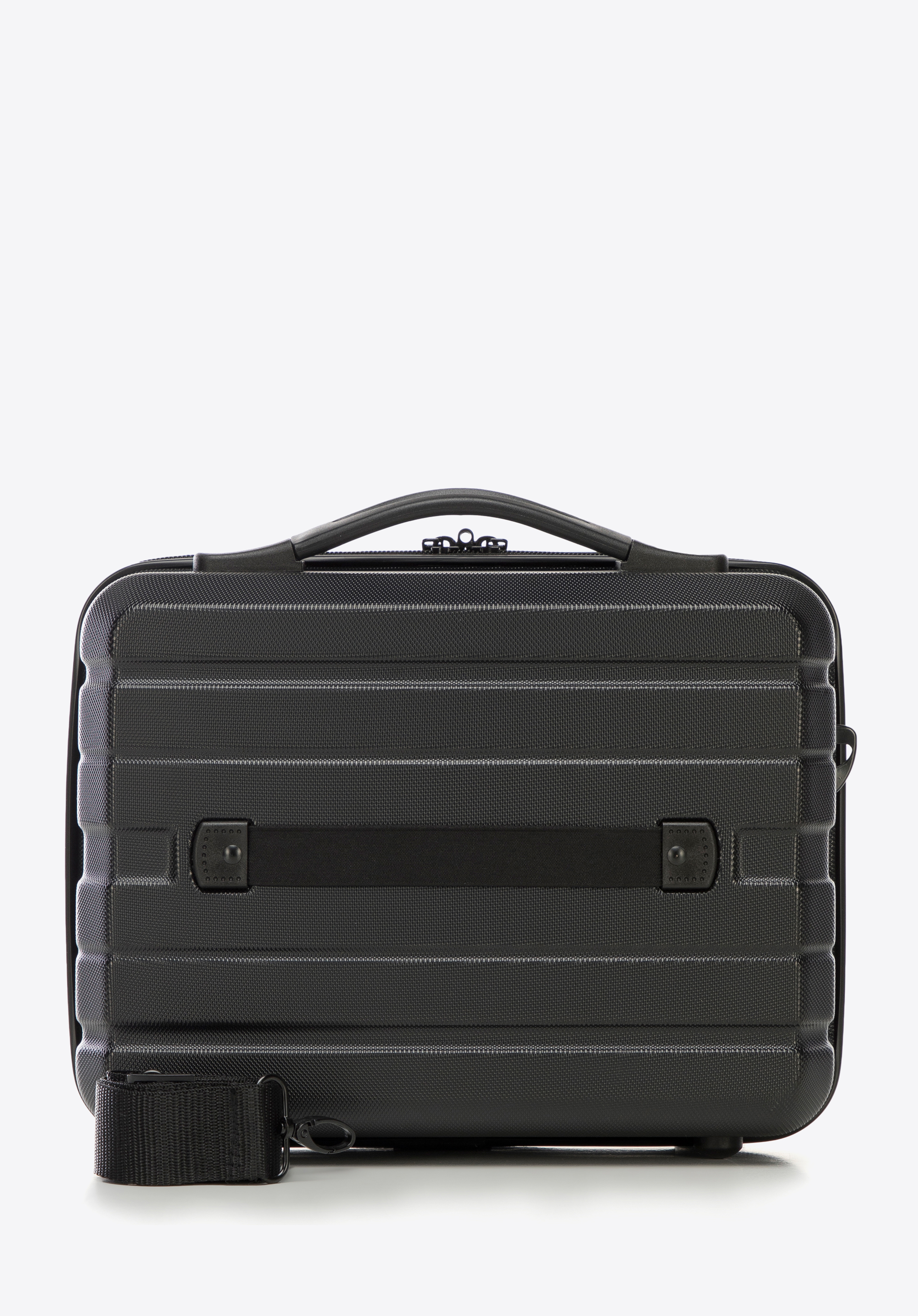 Z tyłu ma elastyczny pasek, dzięki któremu zaczepisz ją o uchwyt walizki. Kosmetyczka podróżna z ABS-u w poziome pasy to świetny wybór dla każdej eleganckiej kobiety.