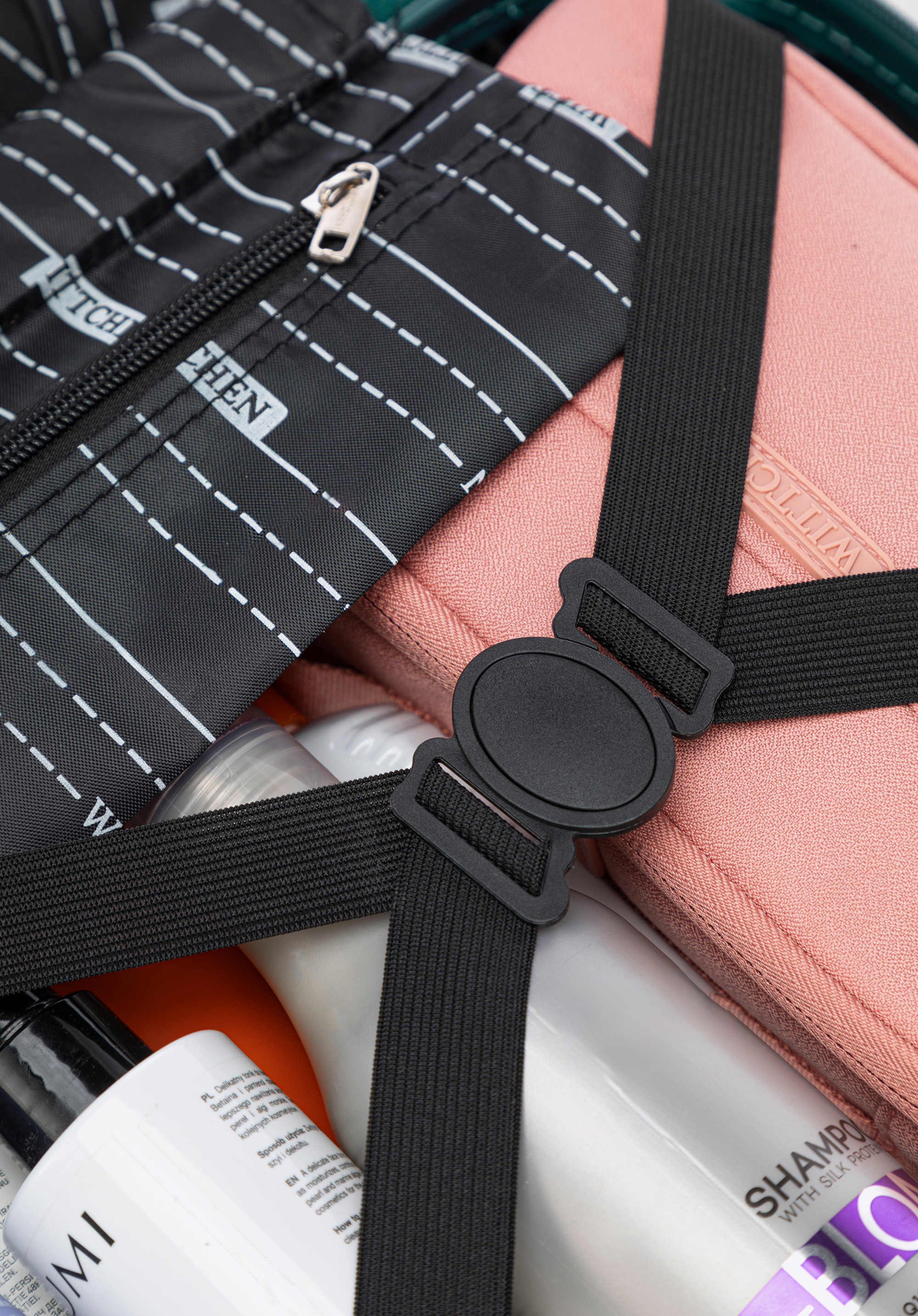 - Dodatkowa przegroda zamykana na suwak skutecznie utrzymuje kosmetyki i akcesoria na miejscu, zapobiegając ich przemieszczaniu się i zapewniając porządek oraz ochronę zawartości.