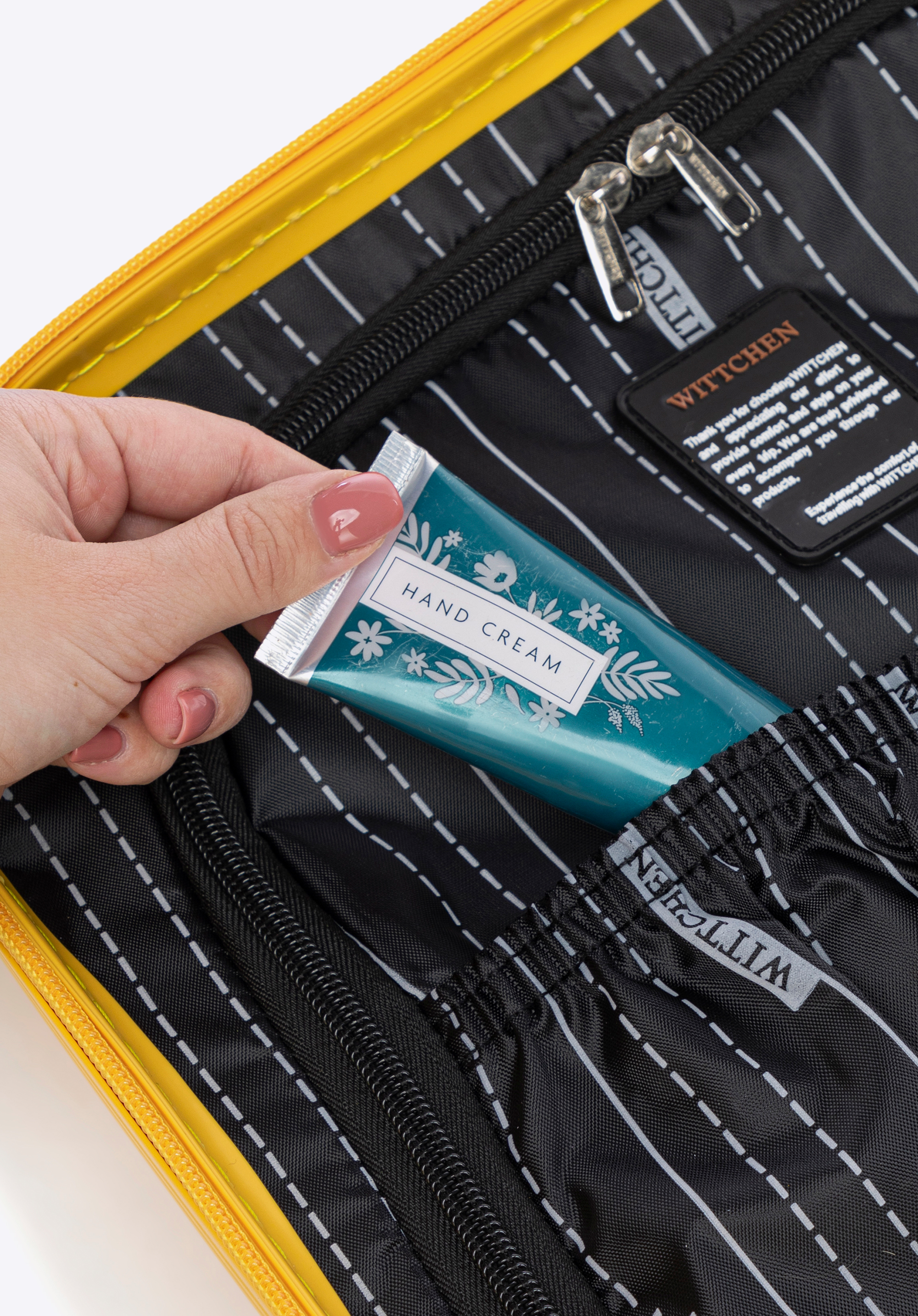 - Dodatkowa przegroda zamykana na suwak skutecznie utrzymuje kosmetyki i akcesoria na miejscu, zapobiegając ich przemieszczaniu się i zapewniając porządek oraz ochronę zawartości.