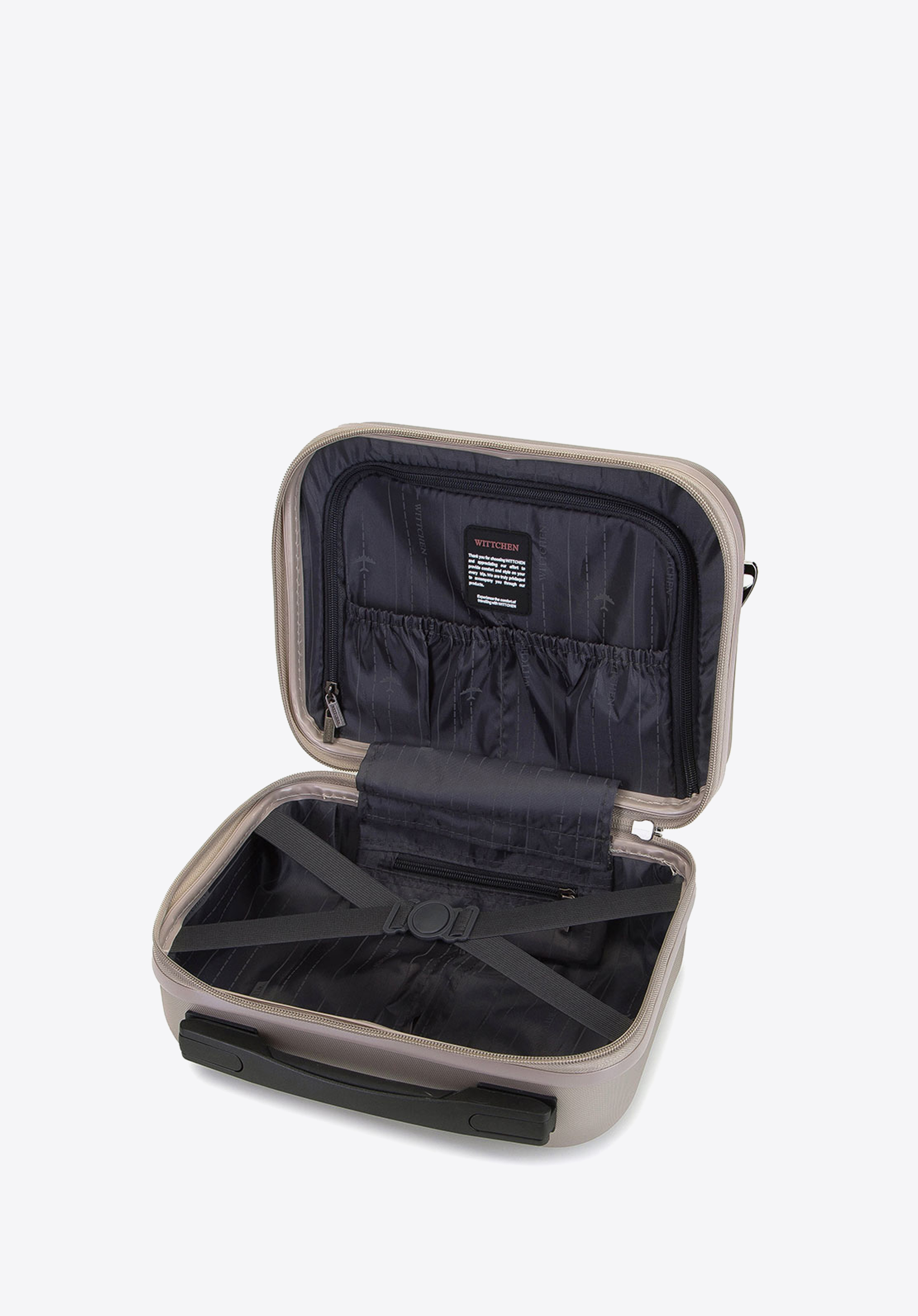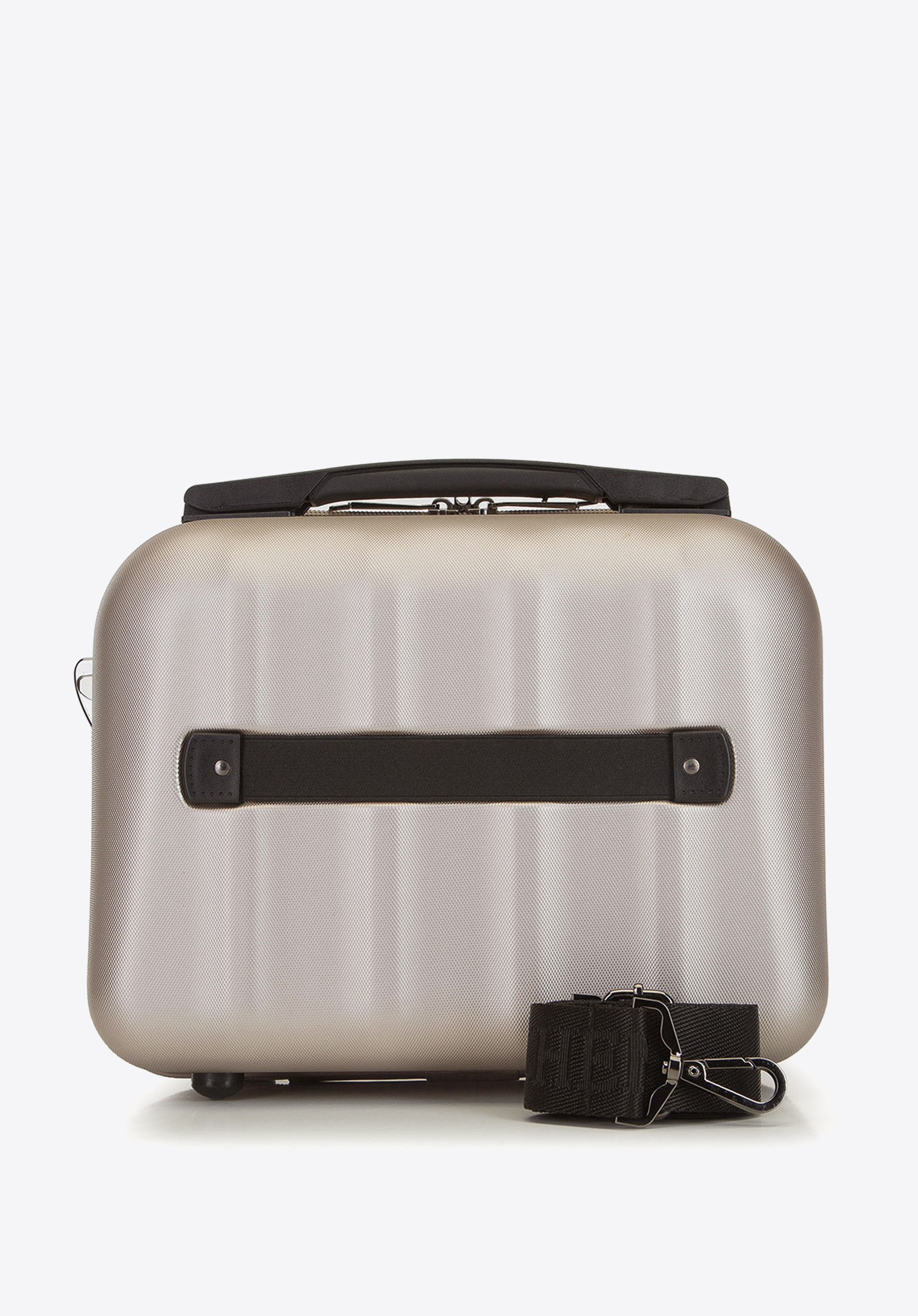 regulowany pasekoraz gumkę, dzięki której wsuniesz kosmetyczkę na rączkę walizki. Możesz kupić ją osobno lub w komplecie walizek.