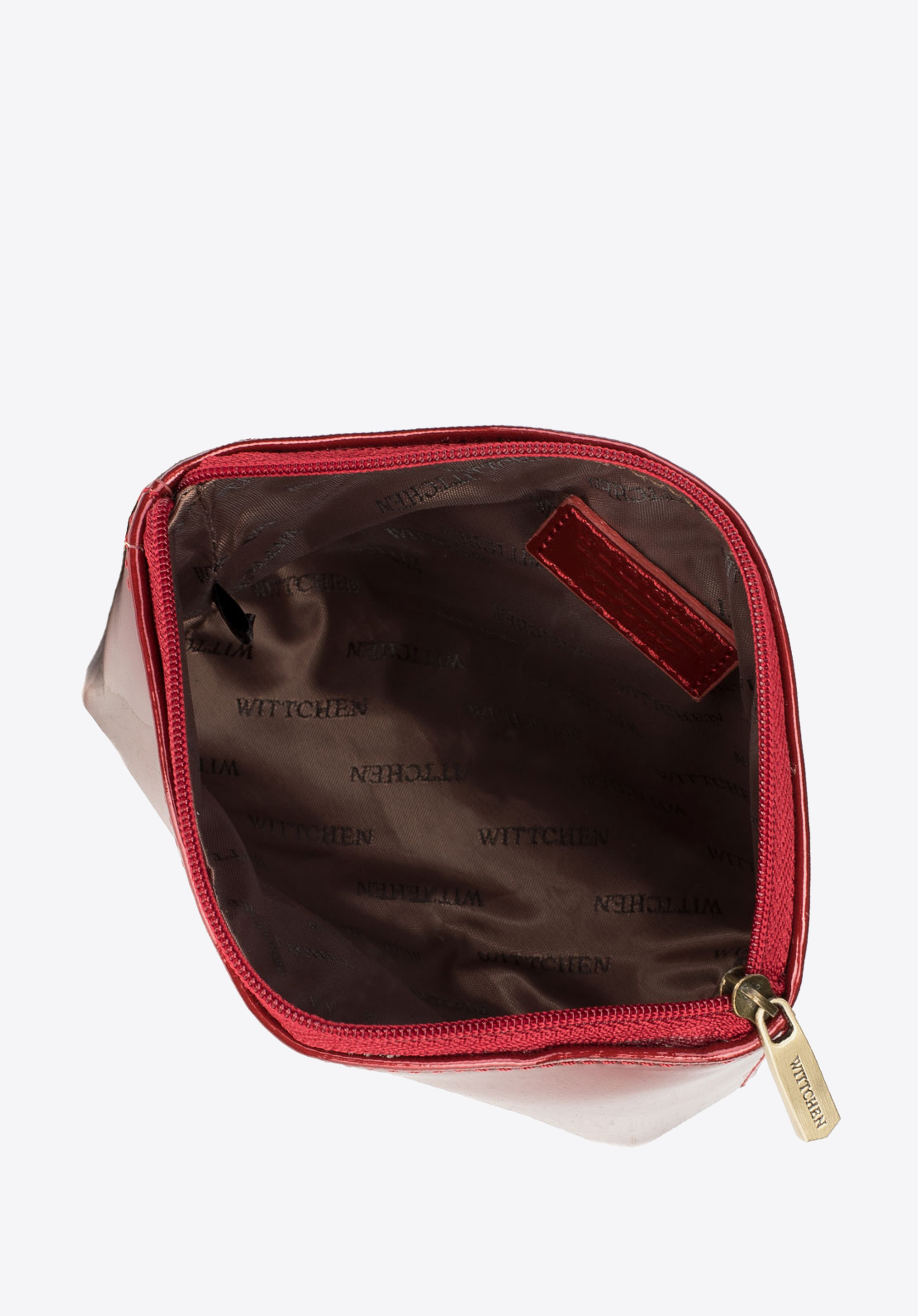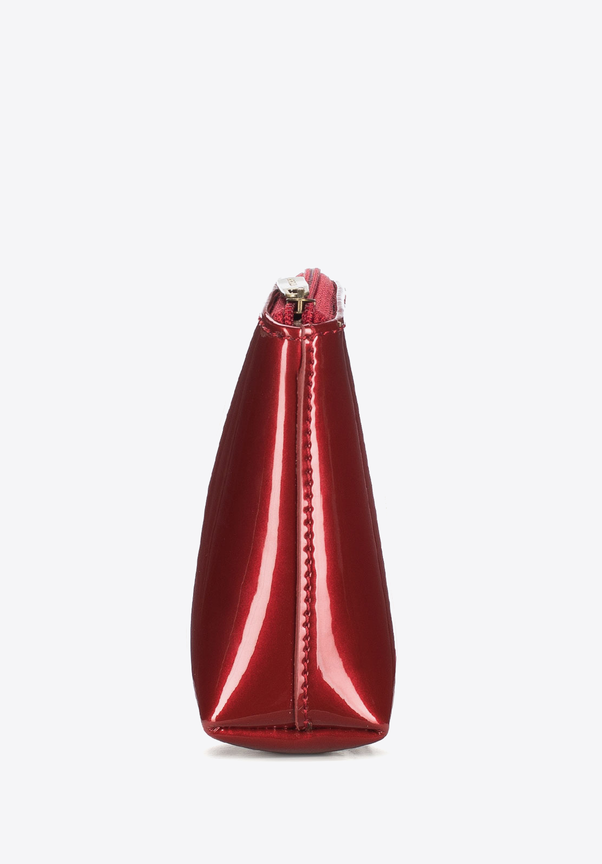 Kosmetyczka wykonana z lakierowanej skóry cechująca się wyjątkową estetyką oraz ciekawym krojem. Pojemny i praktyczny model pomieści potrzebne kosmetyki i akcesoria do makijażu, a funkcjonalne zamknięcie na suwak zapewni, że te nie wypadną niepostrzeżenie.