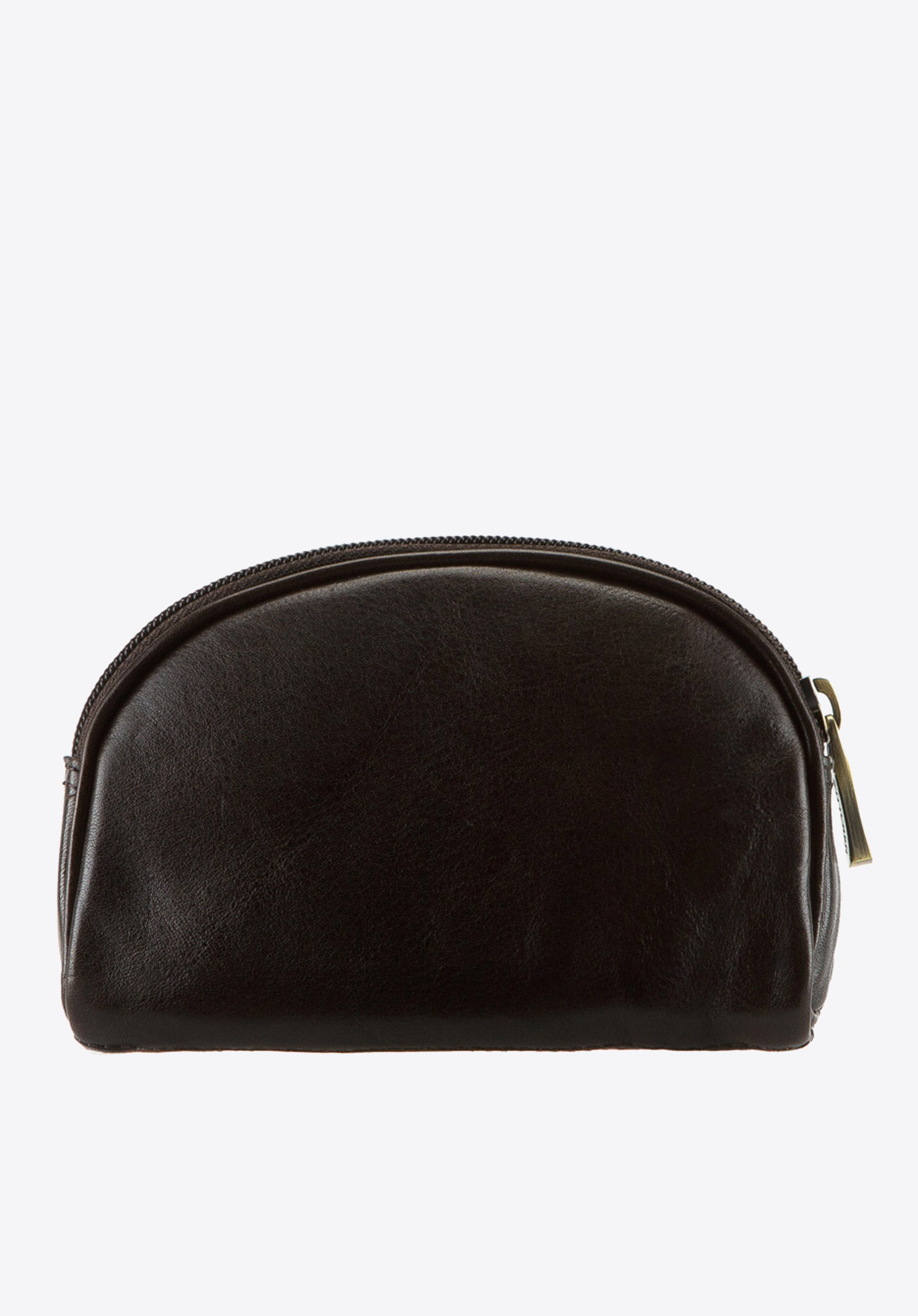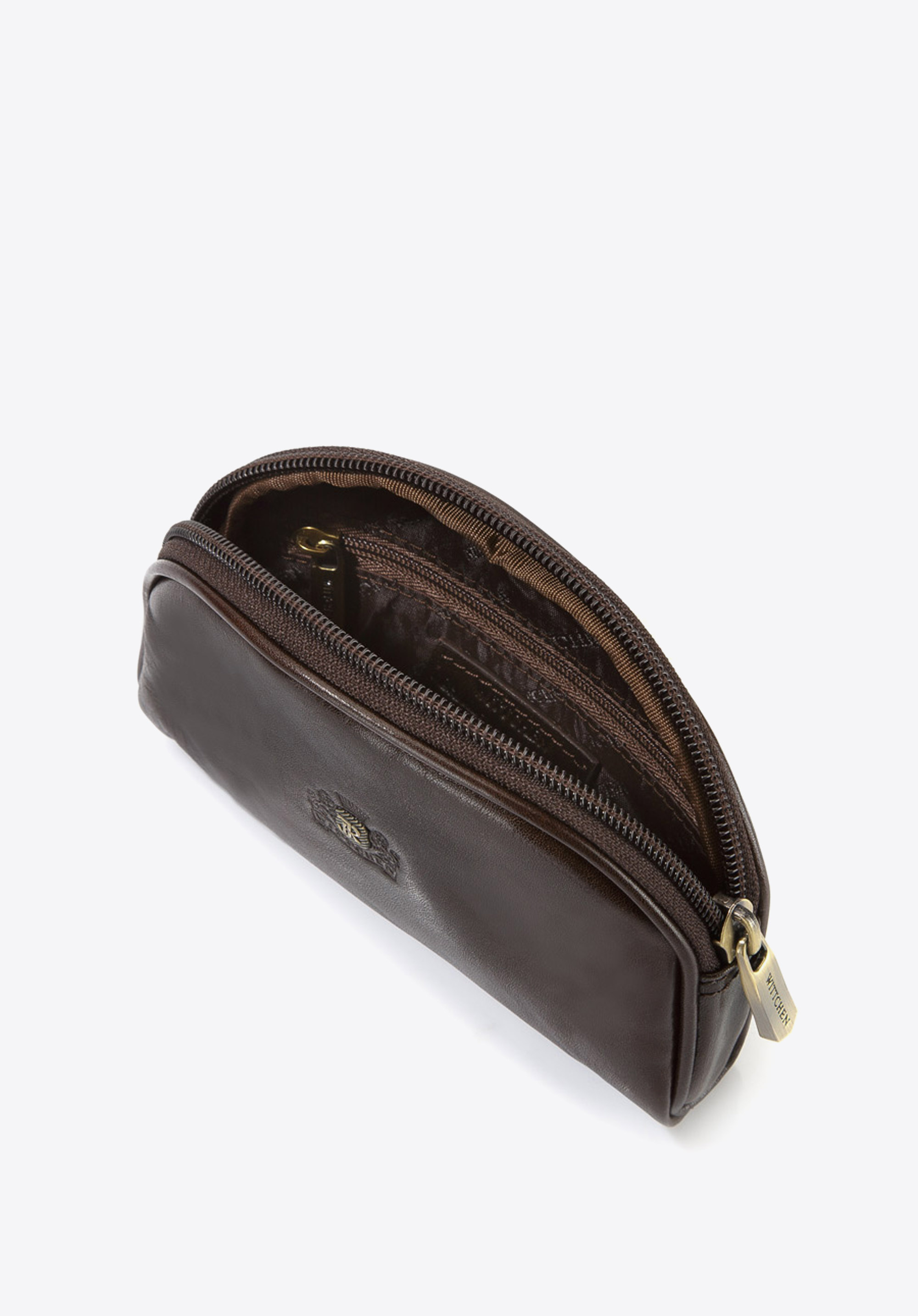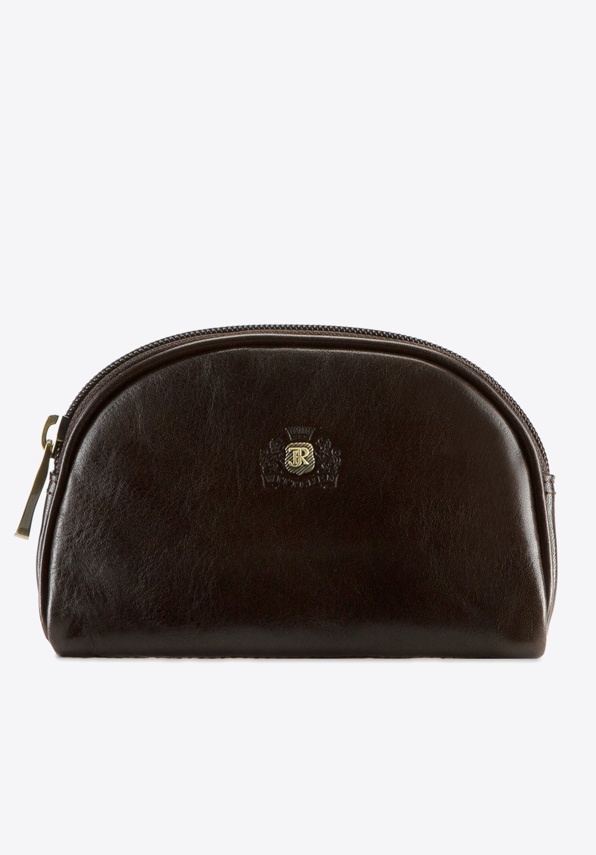 Elegancka kosmetyczka w kształcie półksiężyca wykonana z miękkiej skóry cielęcej, ozdobiona logo - inicjałami otoczonymi tarczą w kolorze starego złota na wytłoczonym herbie. Szykowny wygląd podkreślają widoczne jarzma naturalnej skóry licowej.