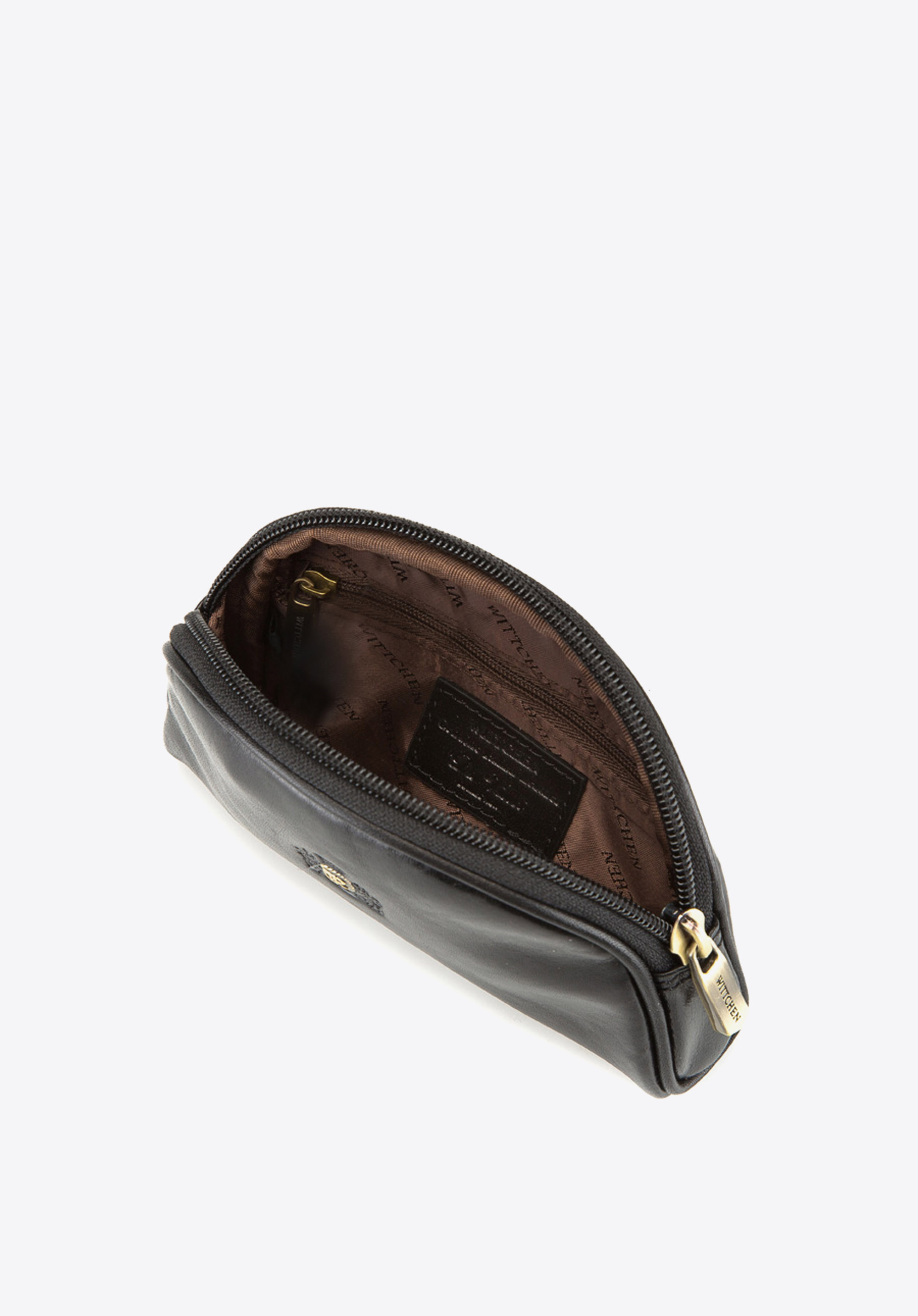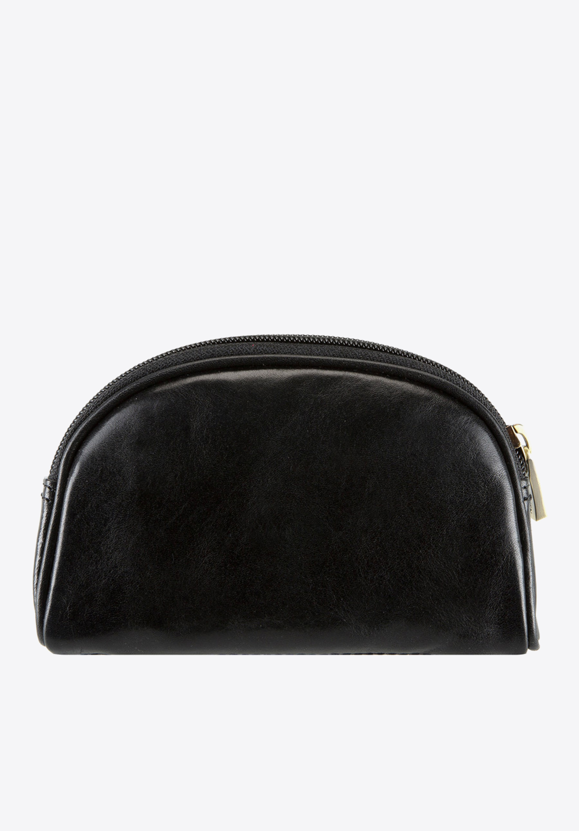 Elegancka kosmetyczka w kształcie półksiężyca wykonana z miękkiej skóry cielęcej, ozdobiona logo - inicjałami otoczonymi tarczą w kolorze starego złota na wytłoczonym herbie. Szykowny wygląd podkreślają widoczne jarzma naturalnej skóry licowej.