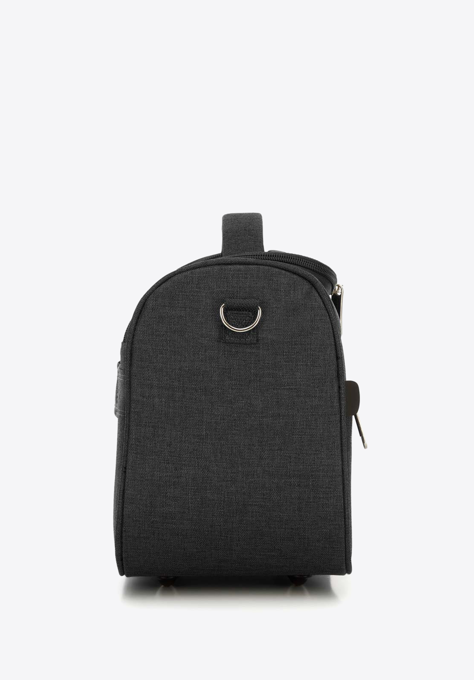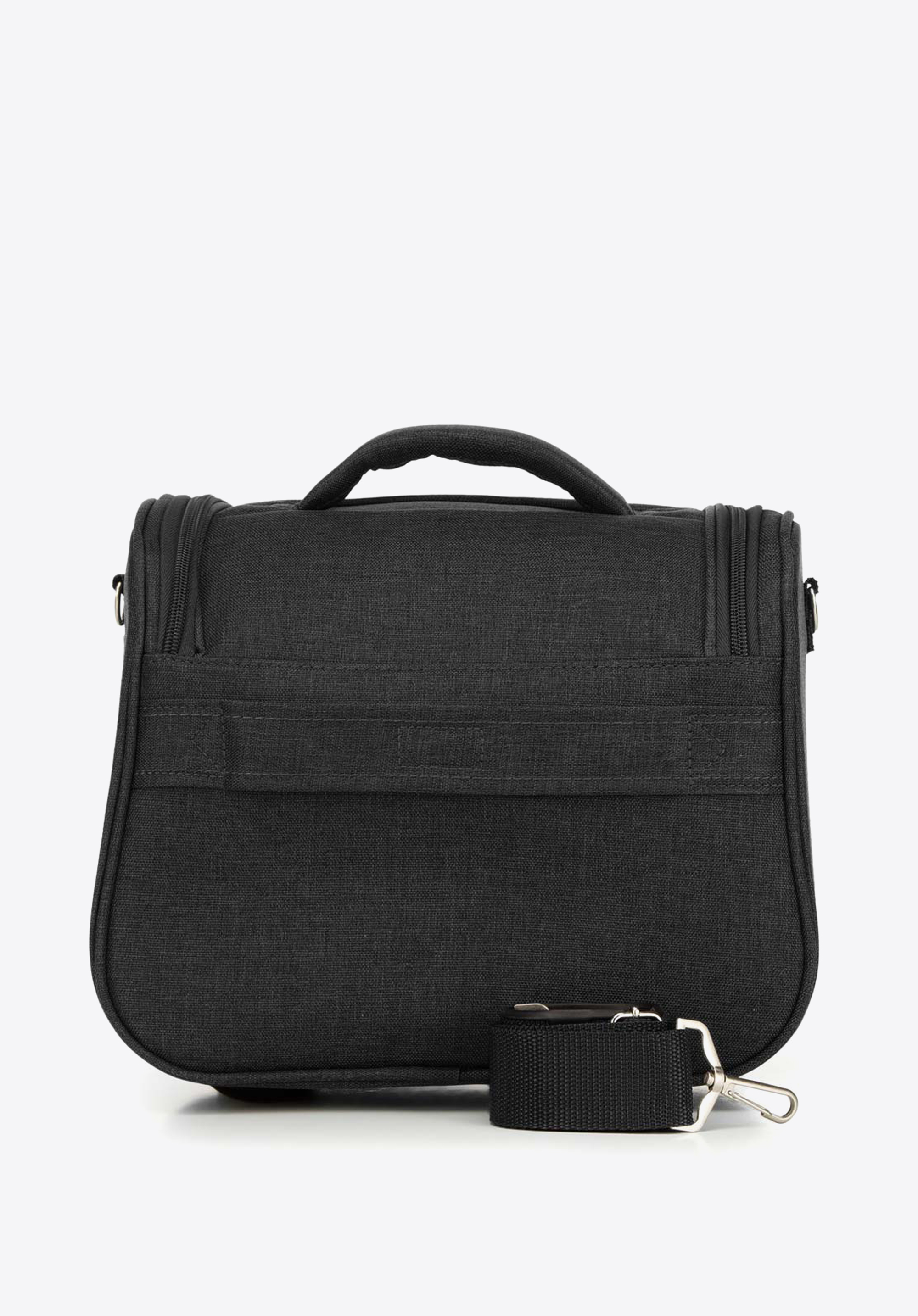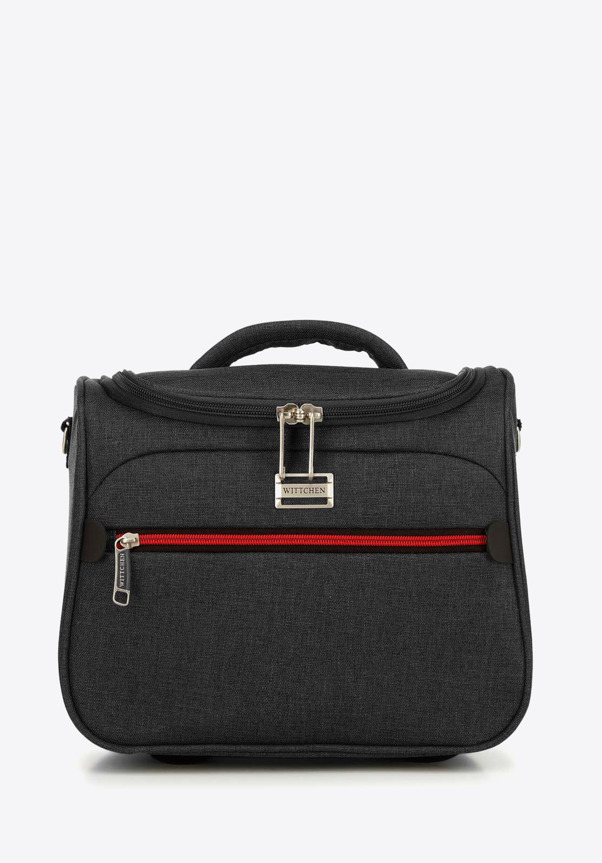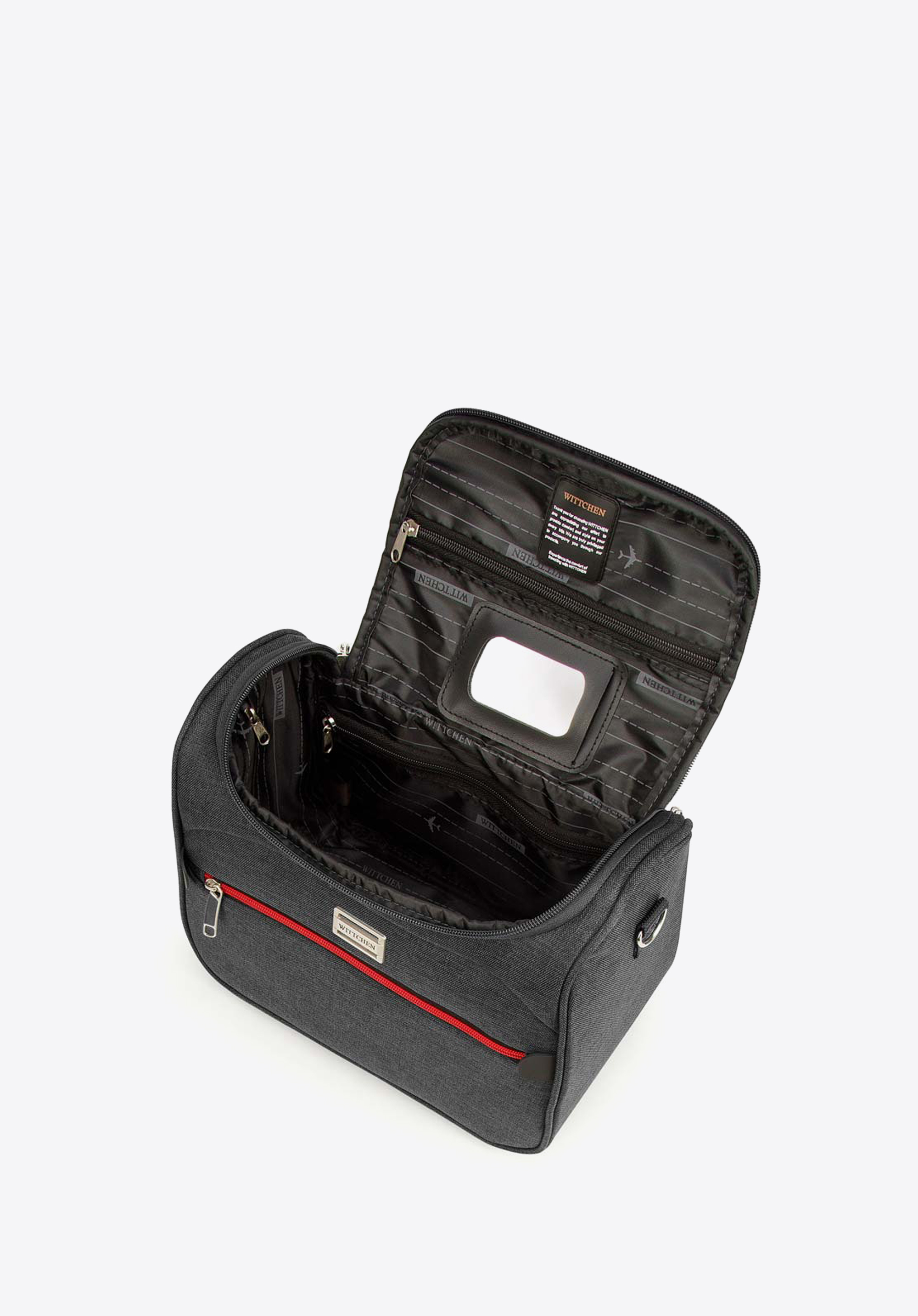 Uniwersalny model kosmetyczki, którą zabierzesz ze sobą w niejedną podróż. Ma usztywnione dno i boczne ścianki, dzięki czemu nawet w niekomfortowych warunkach Twoje rzeczy pozostaną w nienaruszonym stanie. Uszyta jest z grubej, wytrzymałej tkaniny, która dodatkowo cechuje się łatwością w czyszczeniu. Jej ozdobą jest kolorowy suwak. Wewnątrz znajdziesz zamykaną na zamek kieszeń i wyjmowane lusterko. Aby było Ci wygodnie, możesz wsunąć ją na rączkę walizki lub przewiesić przez ramię na doczepianym pasku. Kosmetyczka z kolorowym suwakiem to niezastąpiony dodatek, niezależnie od tego czy wybierasz samolot, czy samochód – weź ją ze sobą.